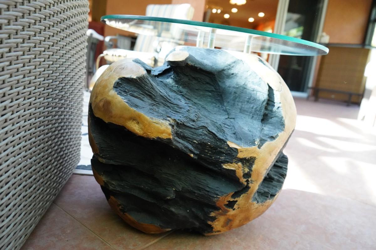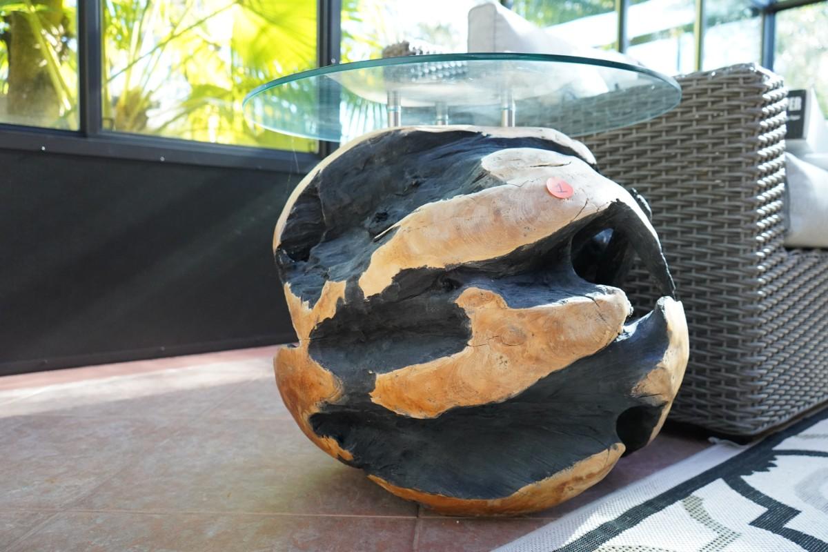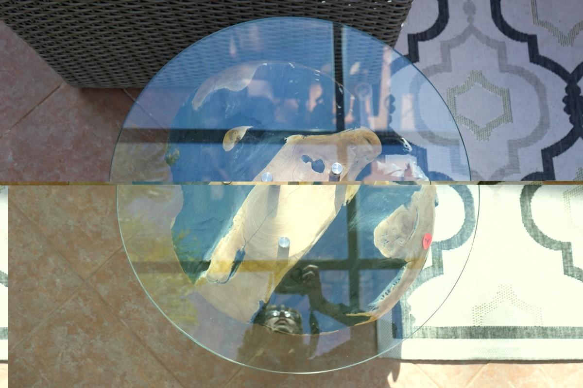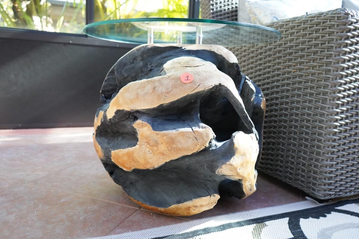 Round in shape, this eclectic end table includes a glass top that measures 23 1/2 inches in diameter. It stands 21 inches high. It looks like a tree root that has been cleaned, sanded, and possibly varnished. Very heavy. Bring help and equipment to move.
