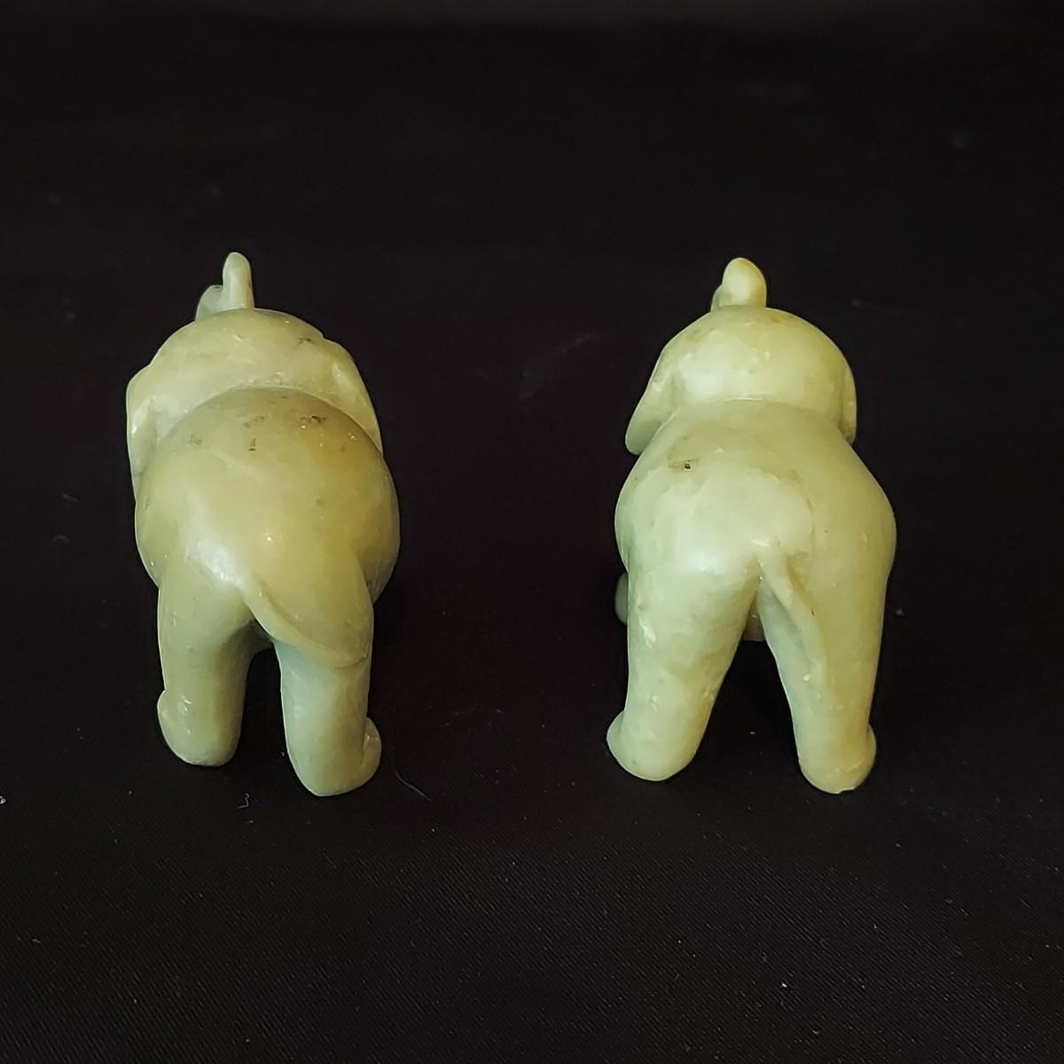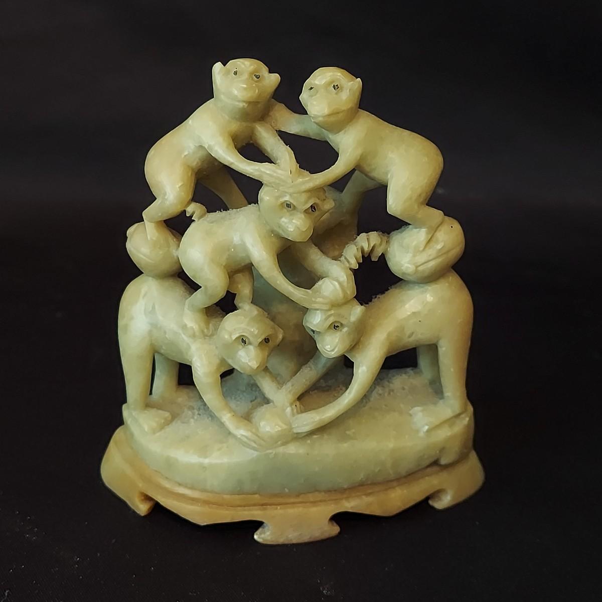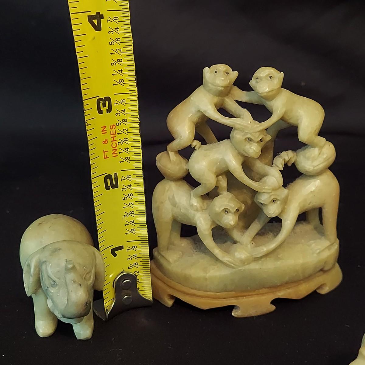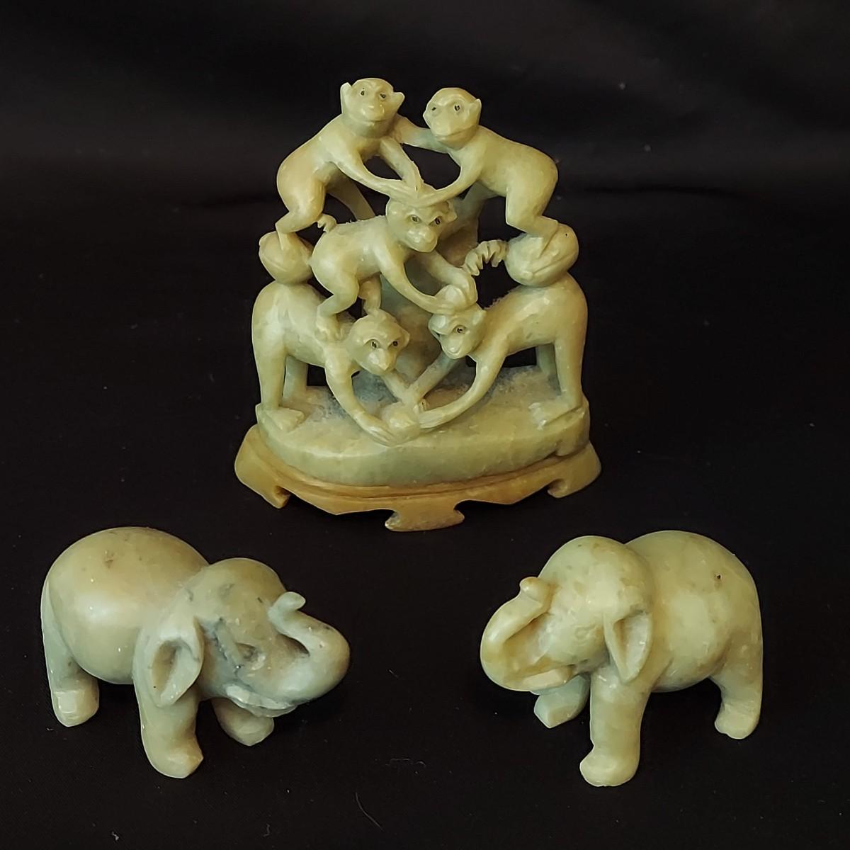 Lot includes a carved stone monkey pyramid figurine with two carved stone elephants. They appear to be soapstone but the stone is very cool to the touch and has a slight green tint and therefore could be jade. The monkeys are 3.5"H. Please see photos for details. Shipping available