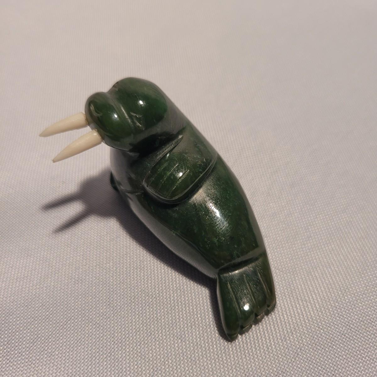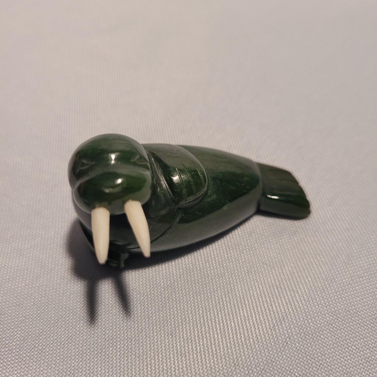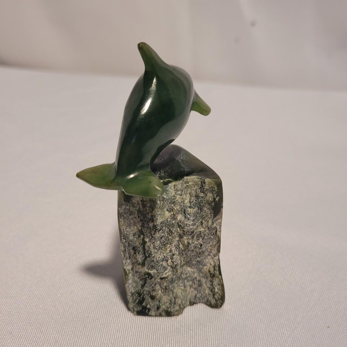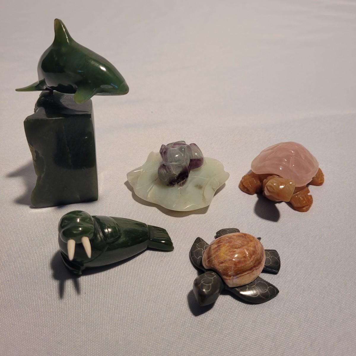 This lot includes five unique carved stone figurines depicting marine life. The first item is a small dolphin statue made from stone with the appearance of natural jade. It is the largest item measuring 2" x 2" x 3.5"H. The second item is a small carved frog figurine made from stone with the appearance of fluorite. The third item is a small carved turtle made from pink and brown stones. The fourth item is another small carved sea turtle made from a marble-like and another stone. Lastly, we have a small walrus carved from a stone with a natural jade appearance, with small white tusks.