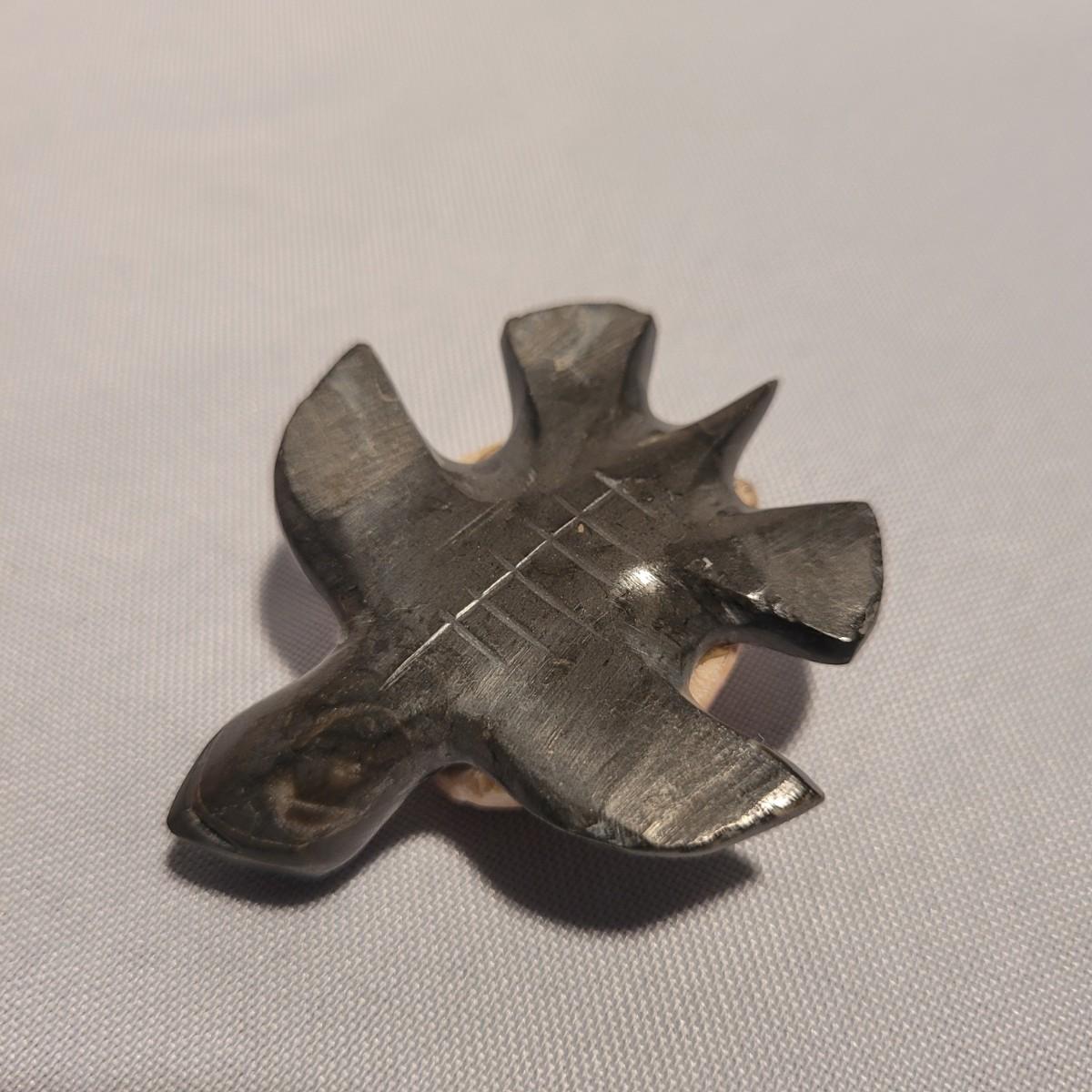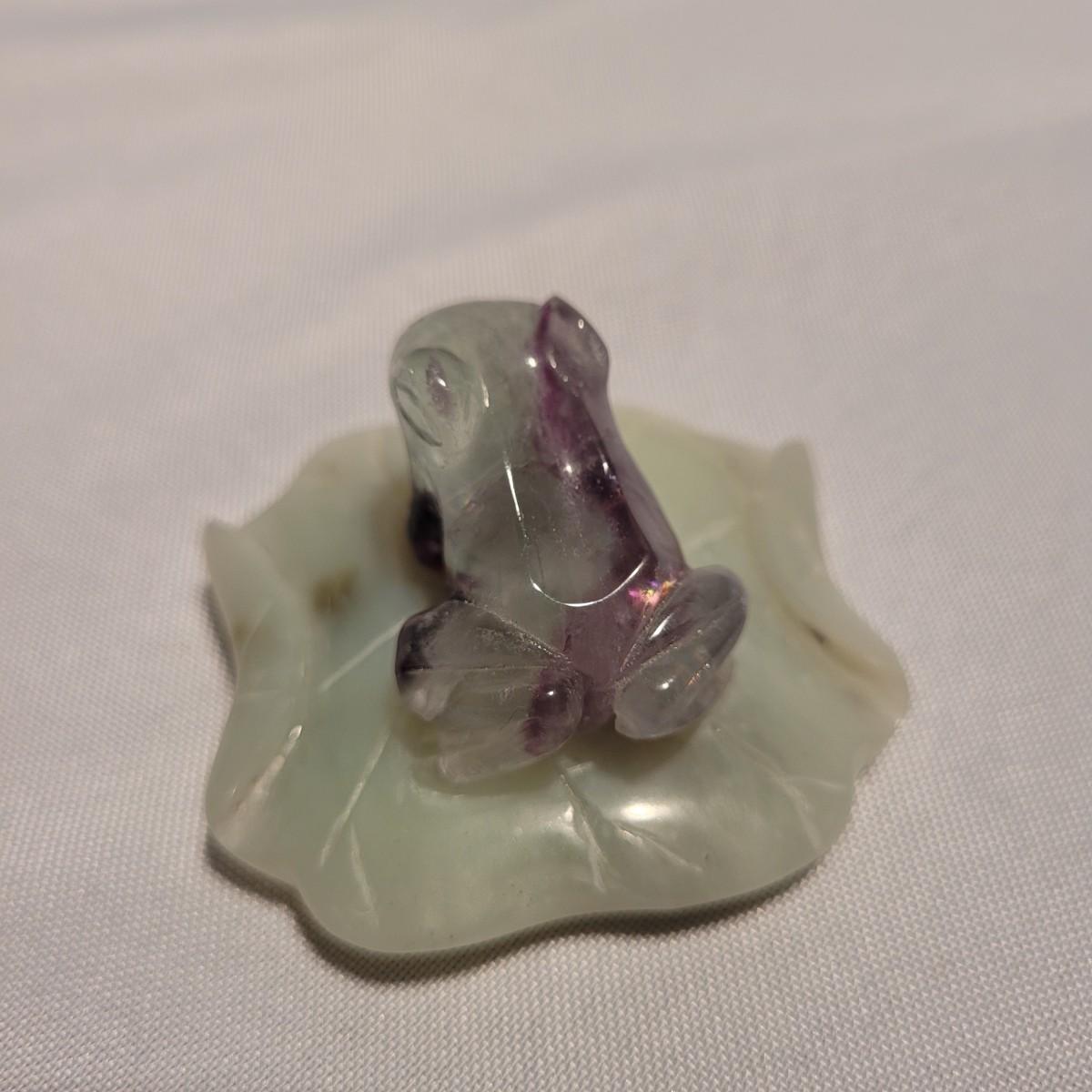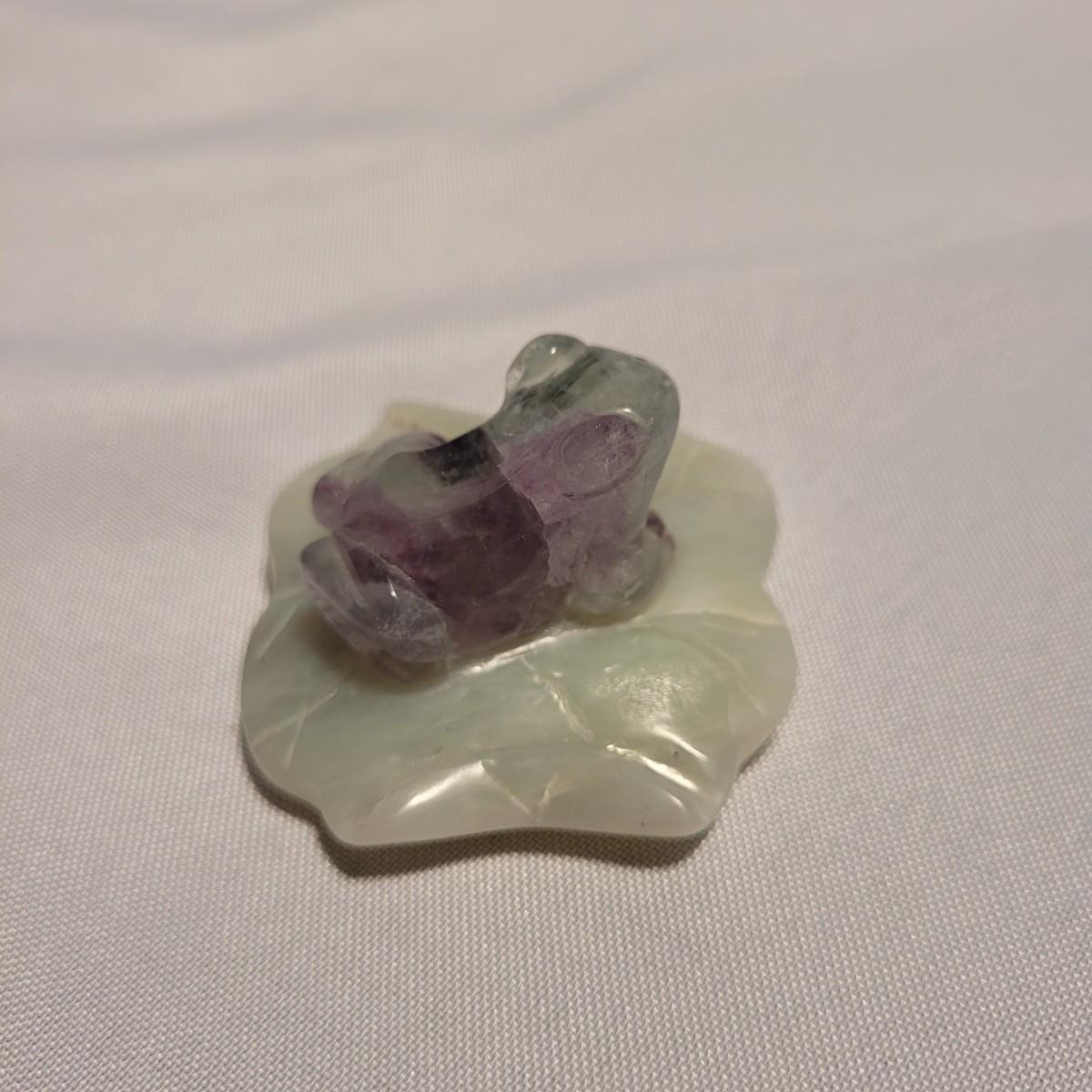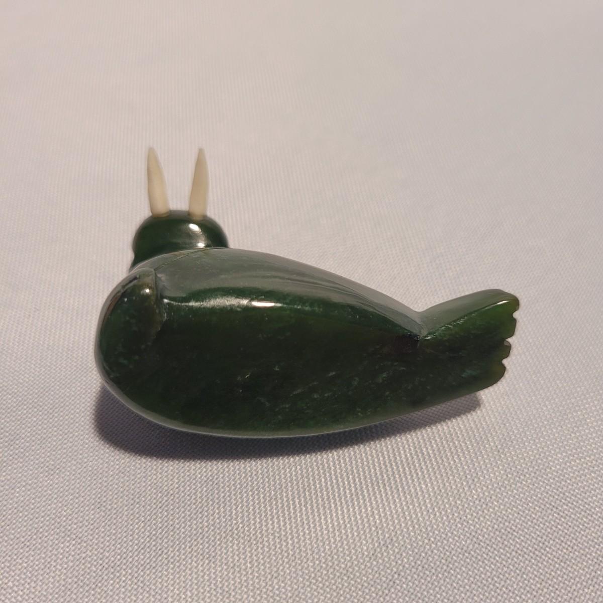 This lot includes five unique carved stone figurines depicting marine life. The first item is a small dolphin statue made from stone with the appearance of natural jade. It is the largest item measuring 2" x 2" x 3.5"H. The second item is a small carved frog figurine made from stone with the appearance of fluorite. The third item is a small carved turtle made from pink and brown stones. The fourth item is another small carved sea turtle made from a marble-like and another stone. Lastly, we have a small walrus carved from a stone with a natural jade appearance, with small white tusks.