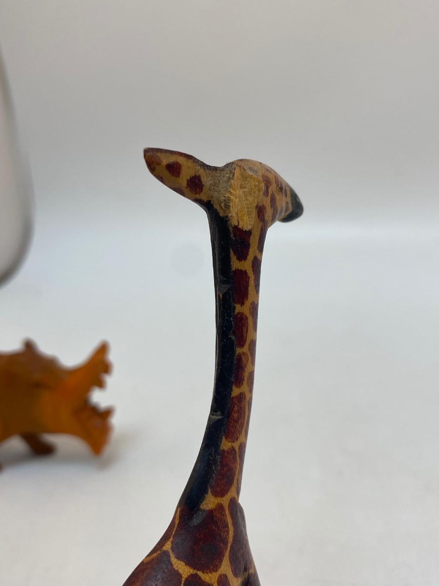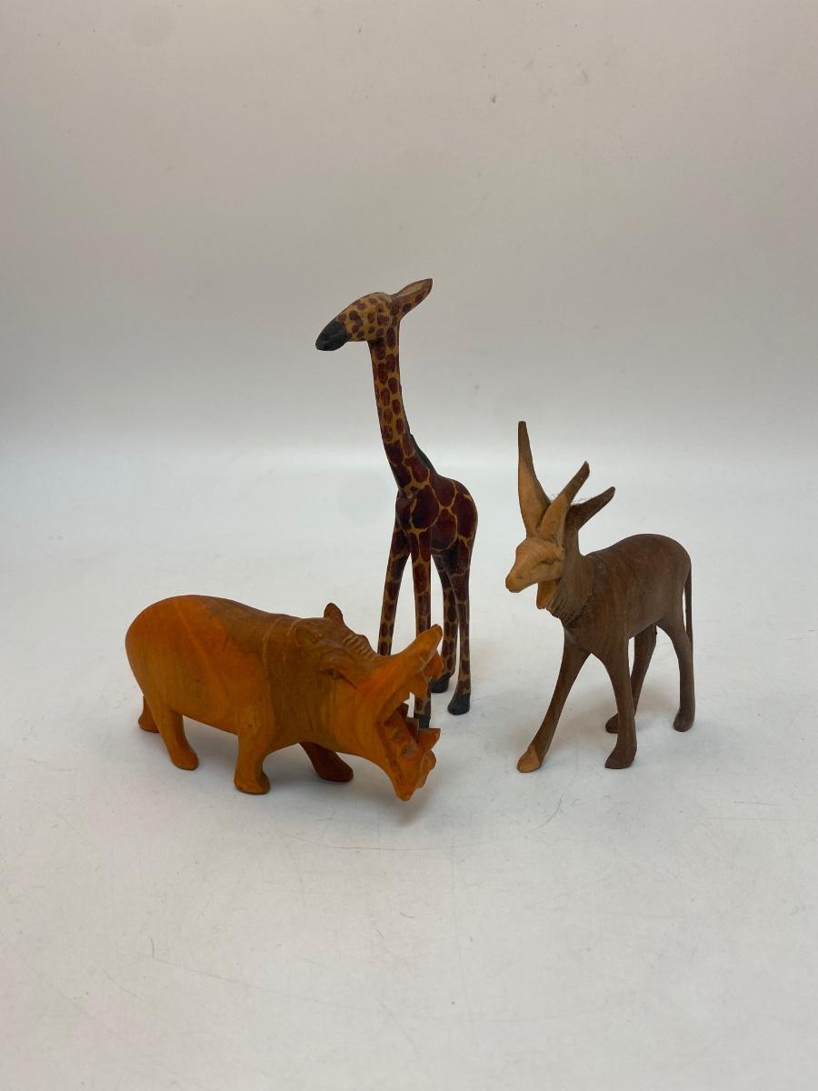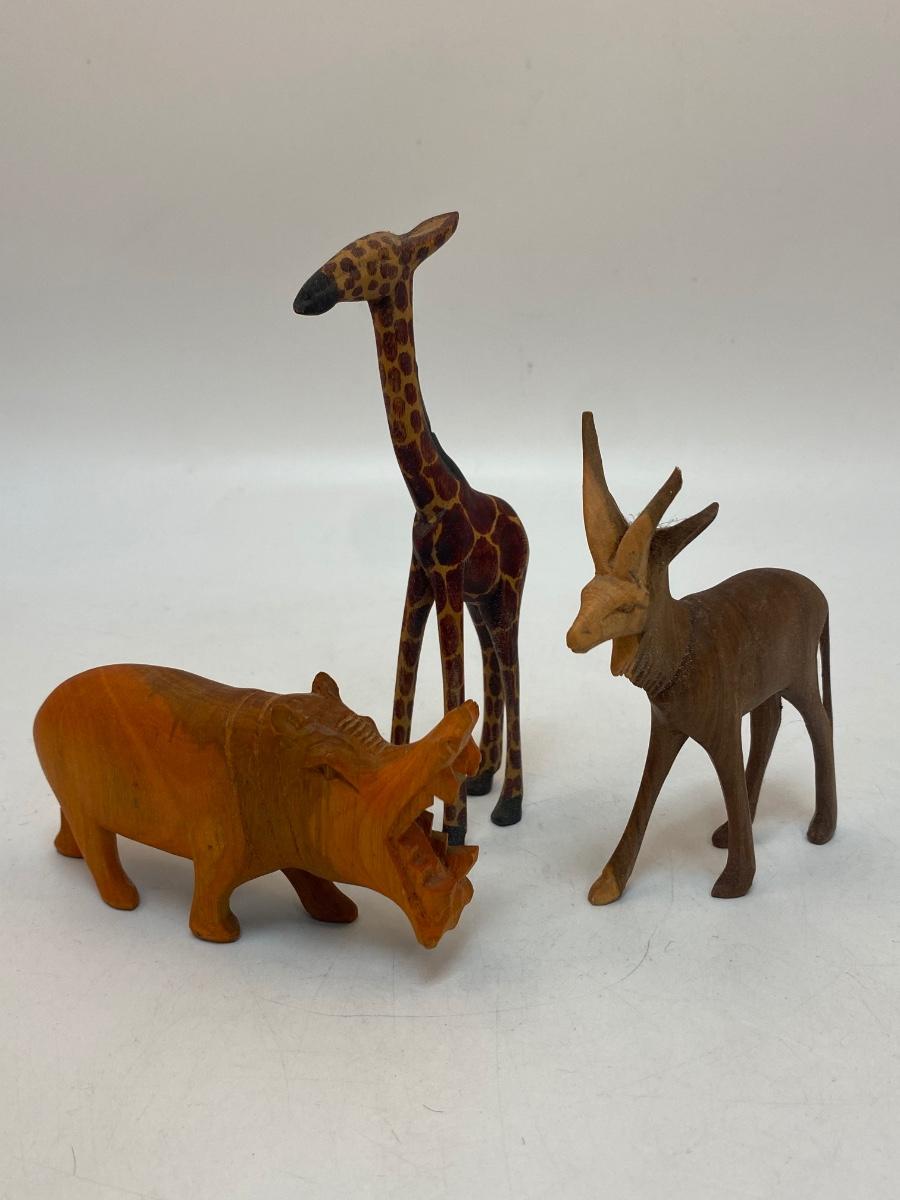 Carved Wood African Safari Wild Animal Figurines Hippo Giraffe Impala. The giraffe is missing an ear, and the impala has broken horns but both display nice. Hippo is undamaged.