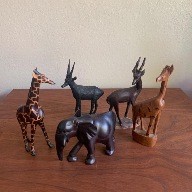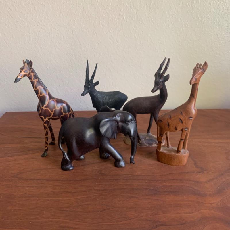 One giraffe is missing an ear and antelope has a repair on horn. Measures 3 1/2” to 6 1/4.”