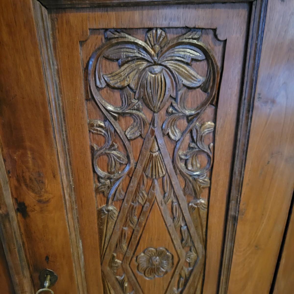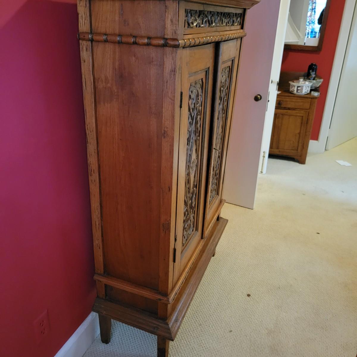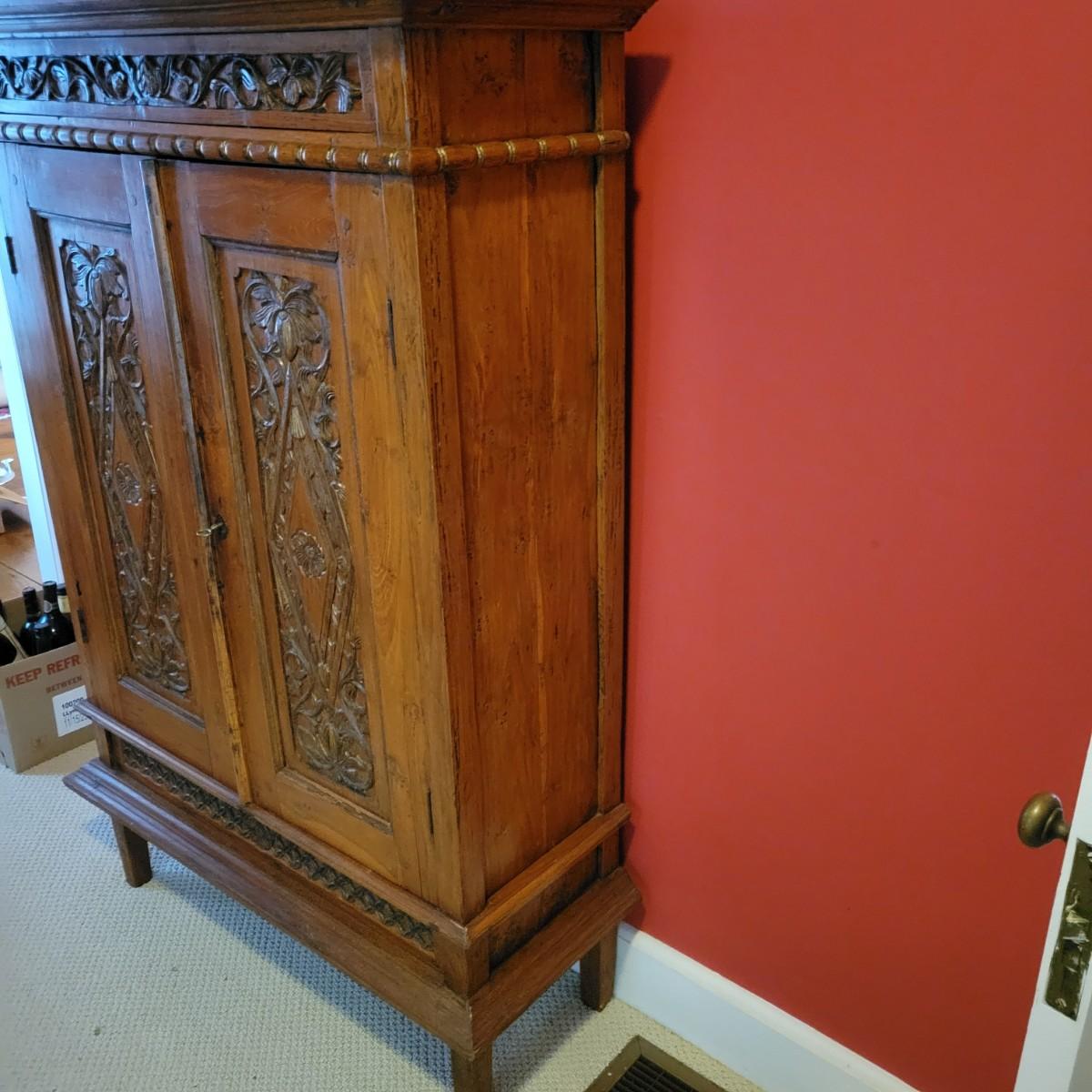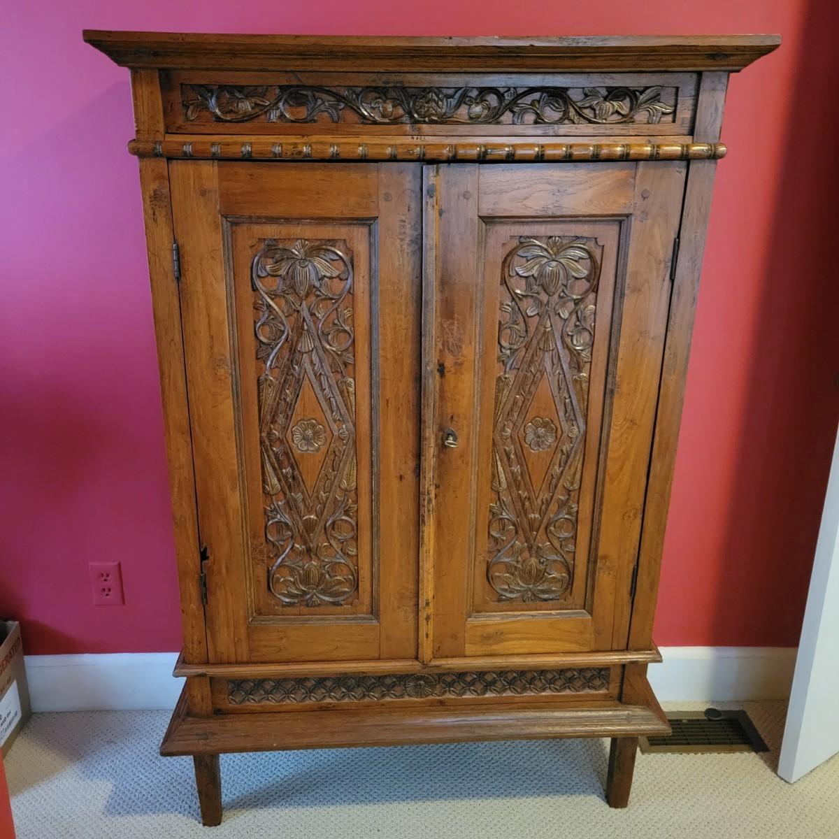 A unique carved wood cabinet that has two doors with a locking mechanism and key that does not appear to work. It measures approximately 39" x 15" x 58.5"H. Some surface dust. Local pickup only. Winning bidder must bring assistance to help move and load this item due to its weight and/or size.