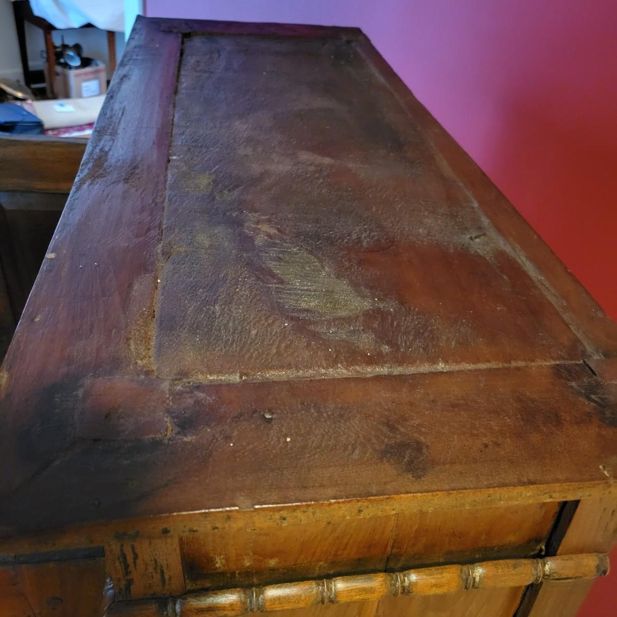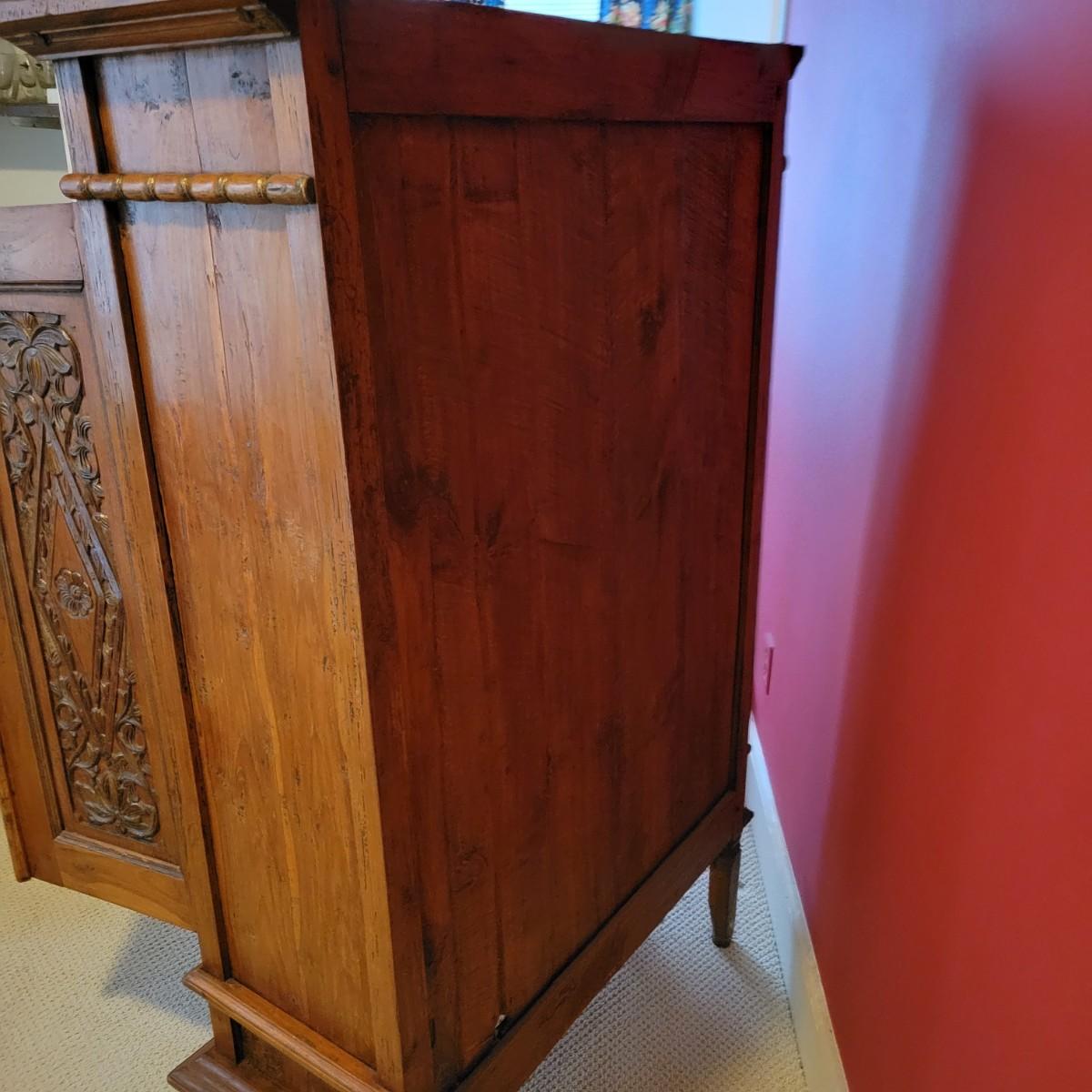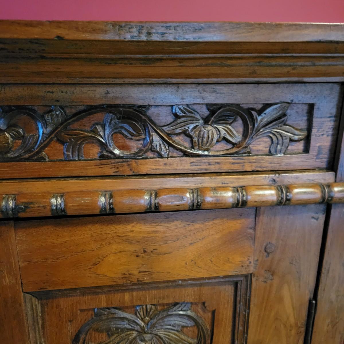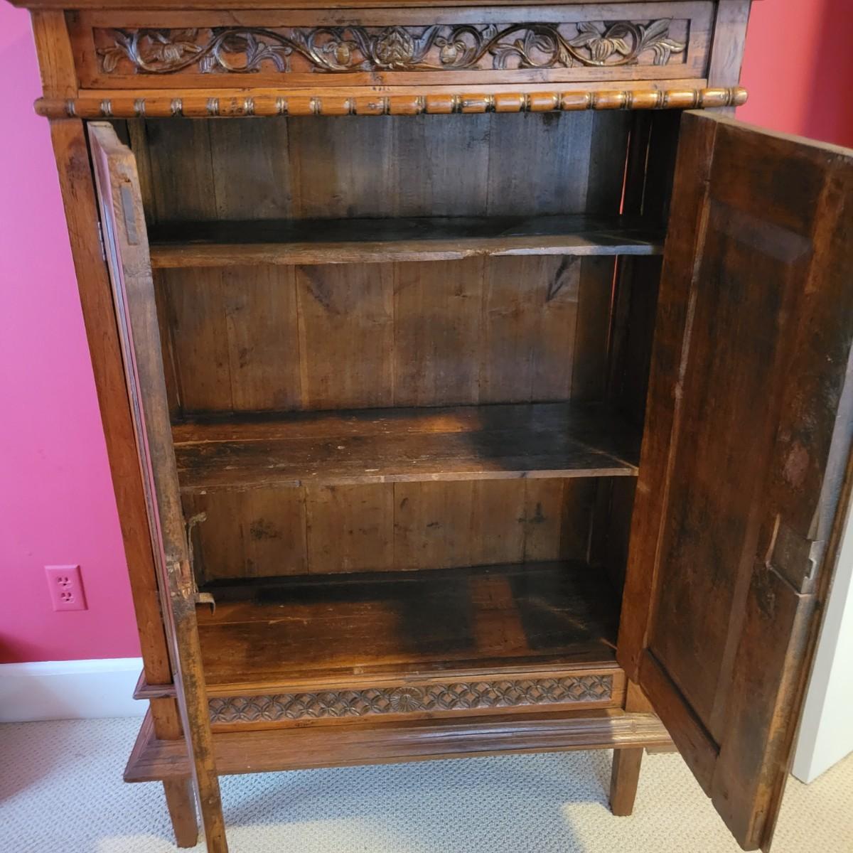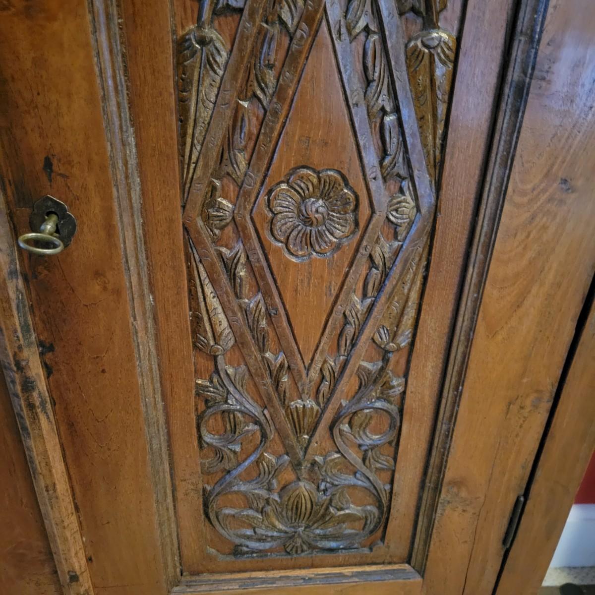 A unique carved wood cabinet that has two doors with a locking mechanism and key that does not appear to work. It measures approximately 39" x 15" x 58.5"H. Some surface dust. Local pickup only. Winning bidder must bring assistance to help move and load this item due to its weight and/or size.