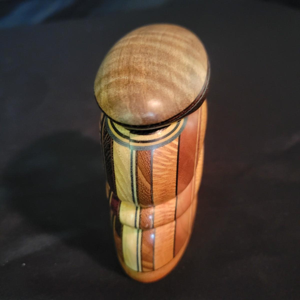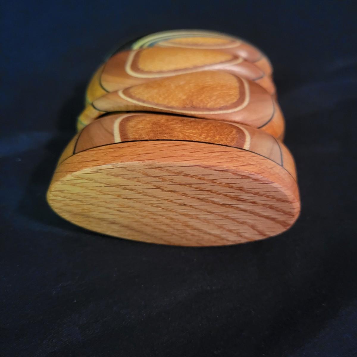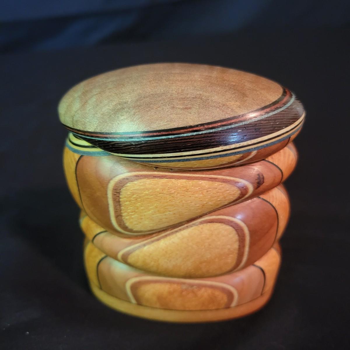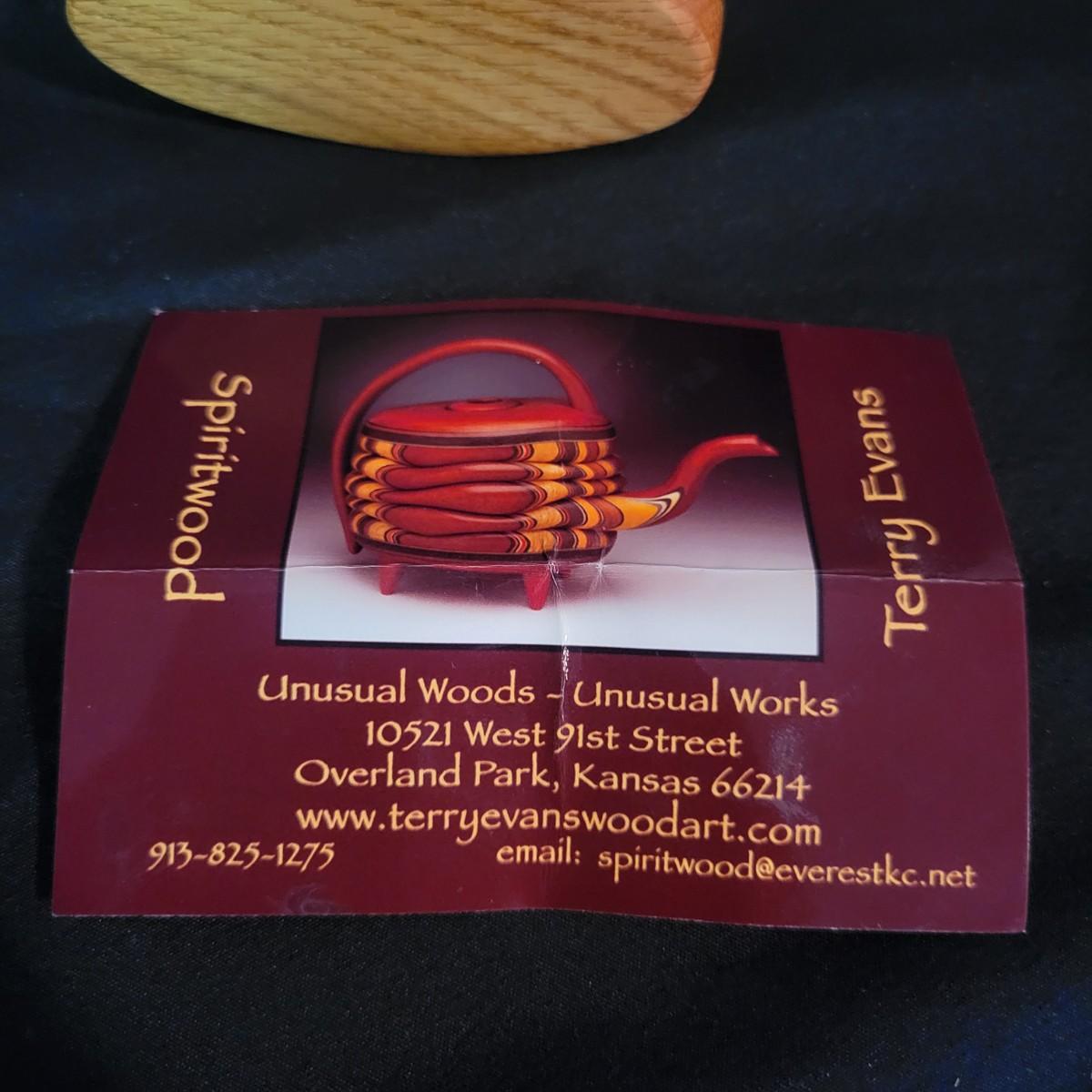 A carved wooden box by artist Terry Evans of Spiritwood studios. The included card indicates that this unique box is made of eight different types of wood. It measures approximately 3.5" x 1.5" x 4"H. Shipping available