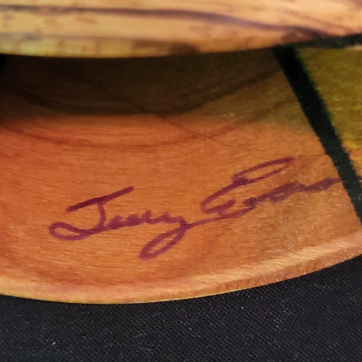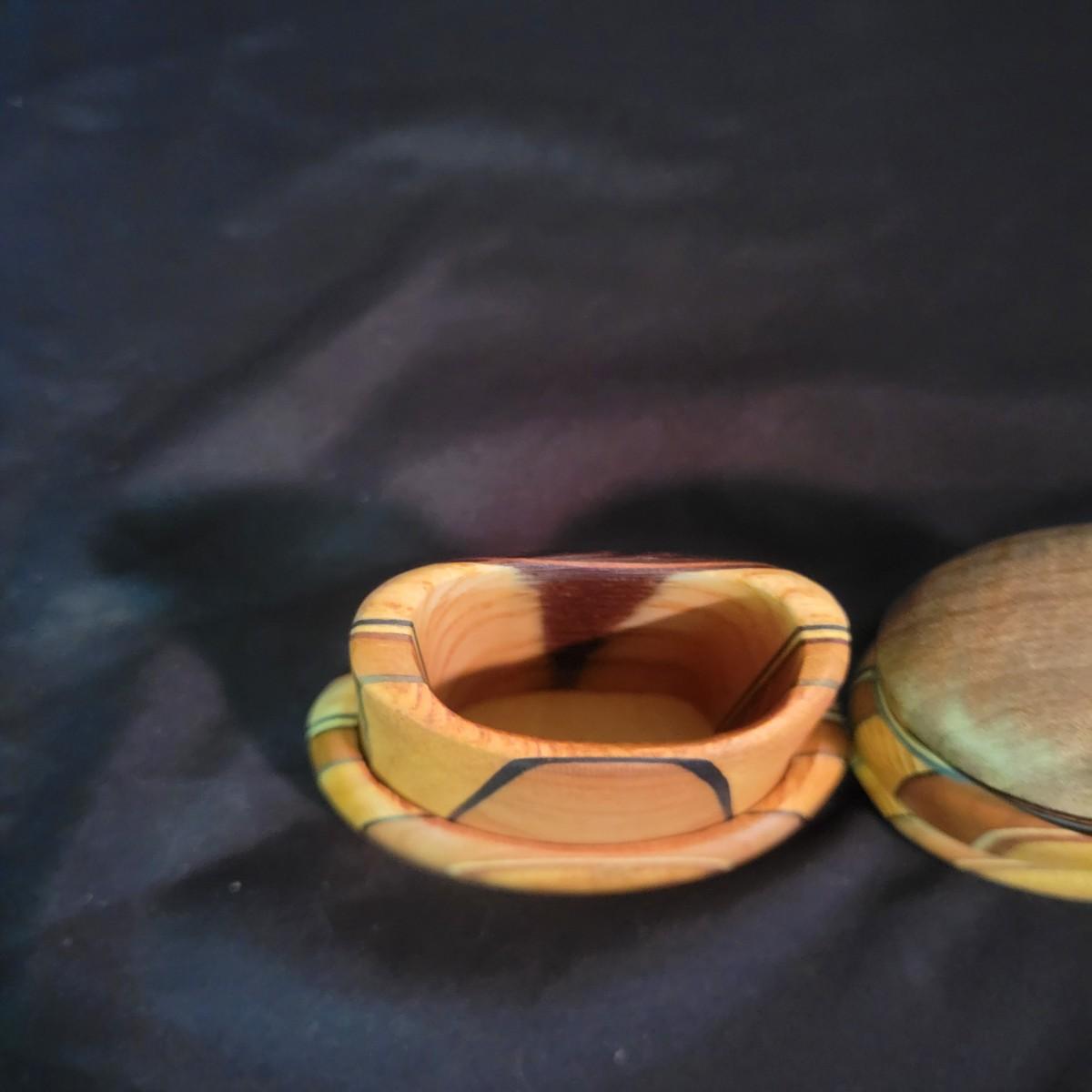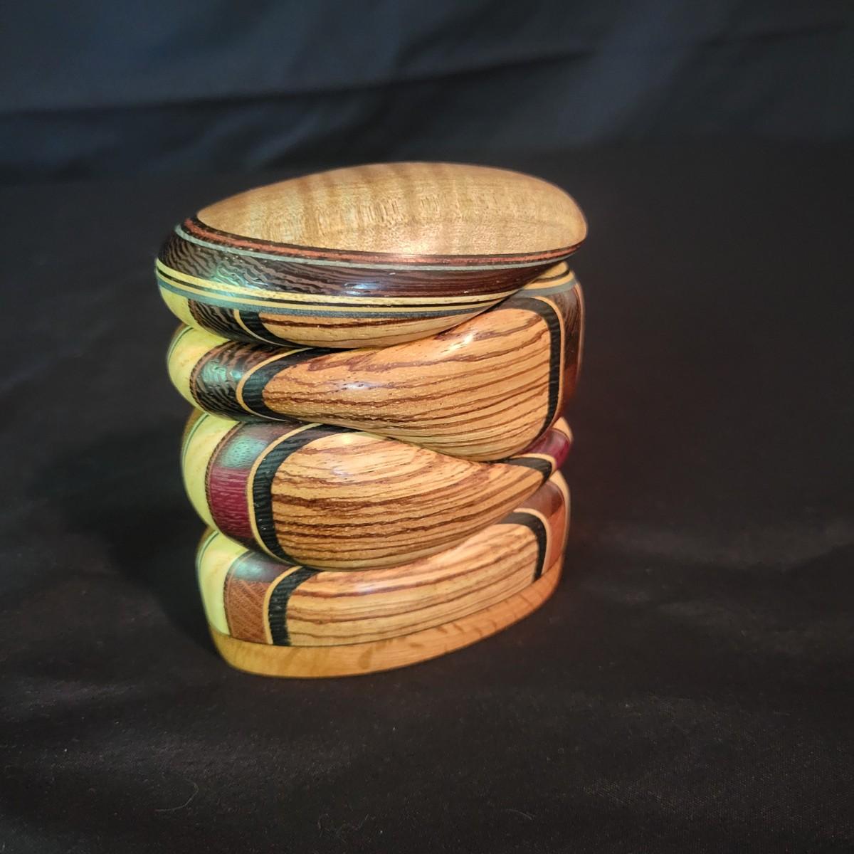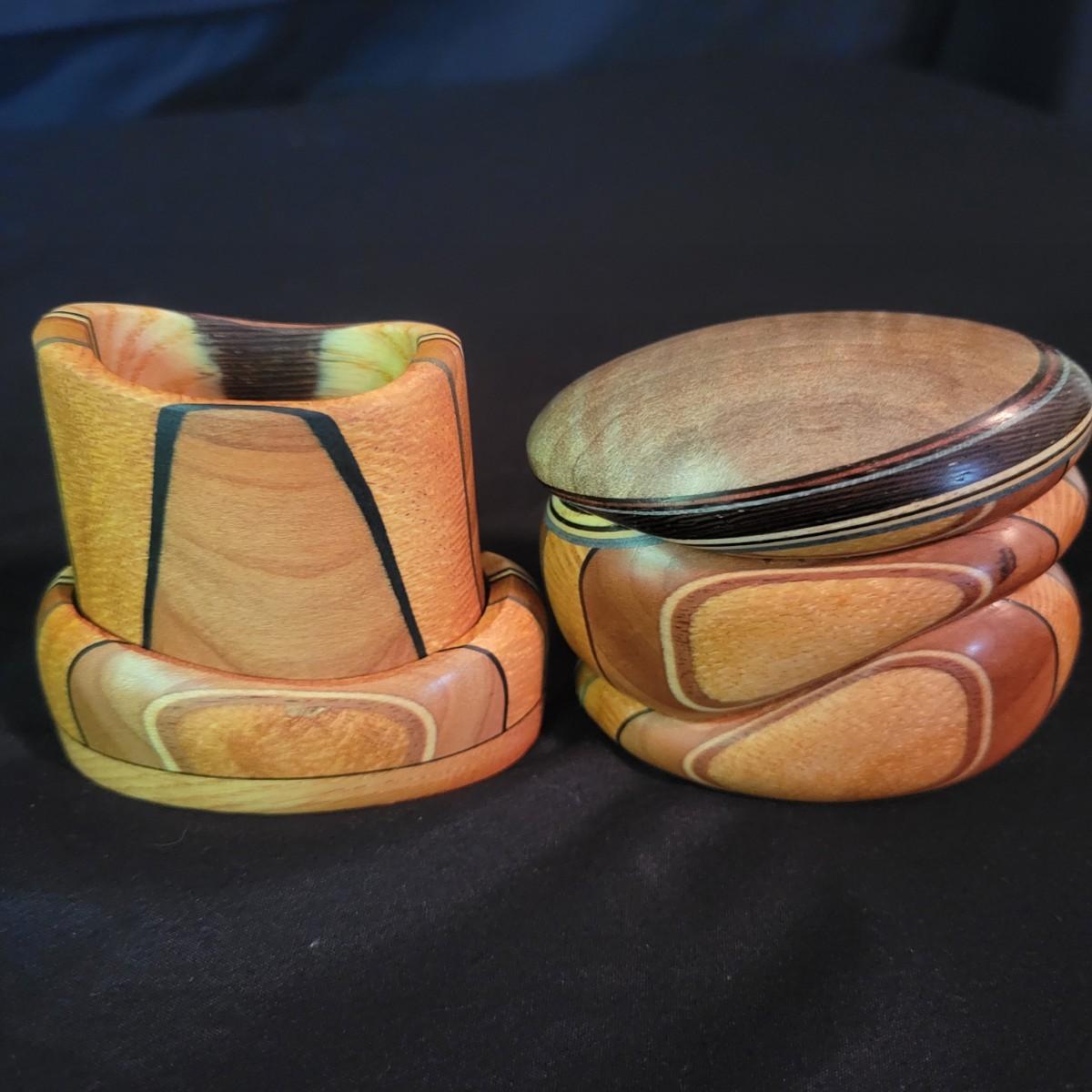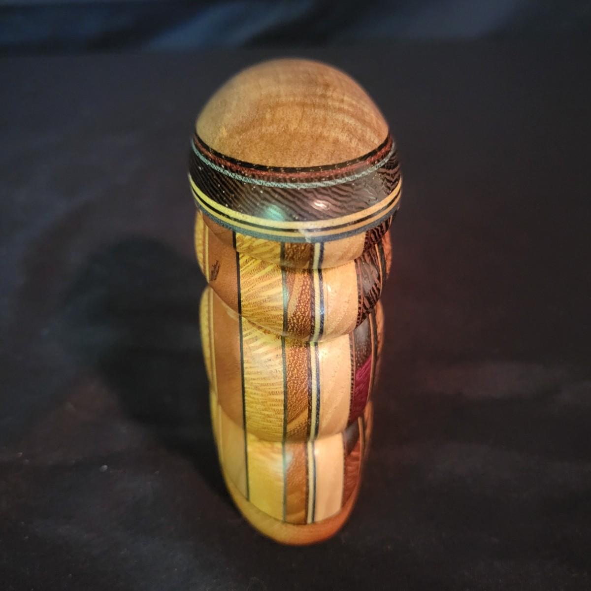 A carved wooden box by artist Terry Evans of Spiritwood studios. The included card indicates that this unique box is made of eight different types of wood. It measures approximately 3.5" x 1.5" x 4"H. Shipping available