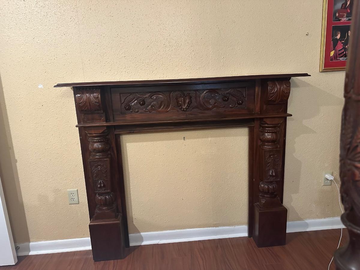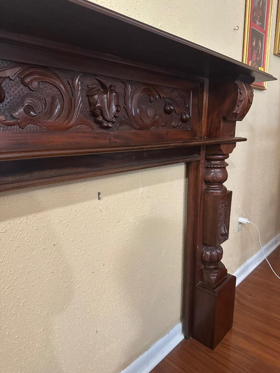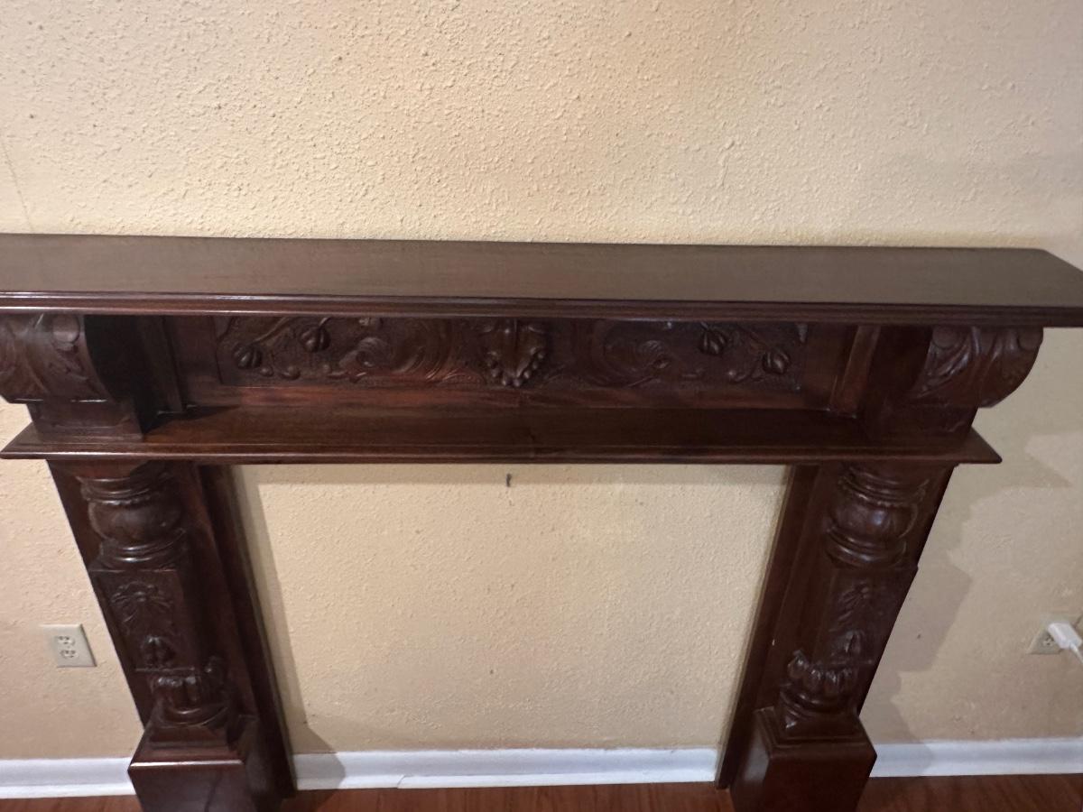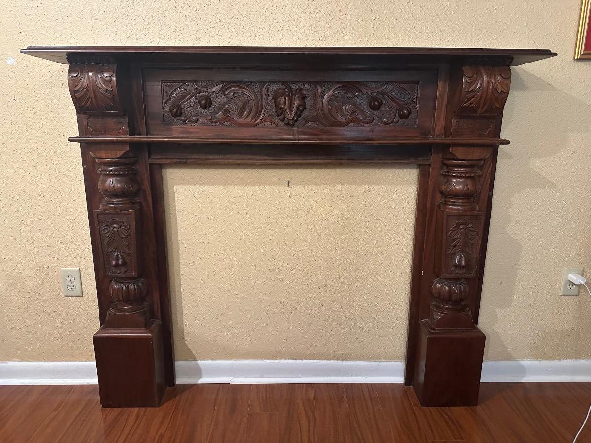 Carved wood fireplace mantel with decorative panel details and molded shelf. Light surface wear and prior mounting holes noted. Solid, heavy construction.