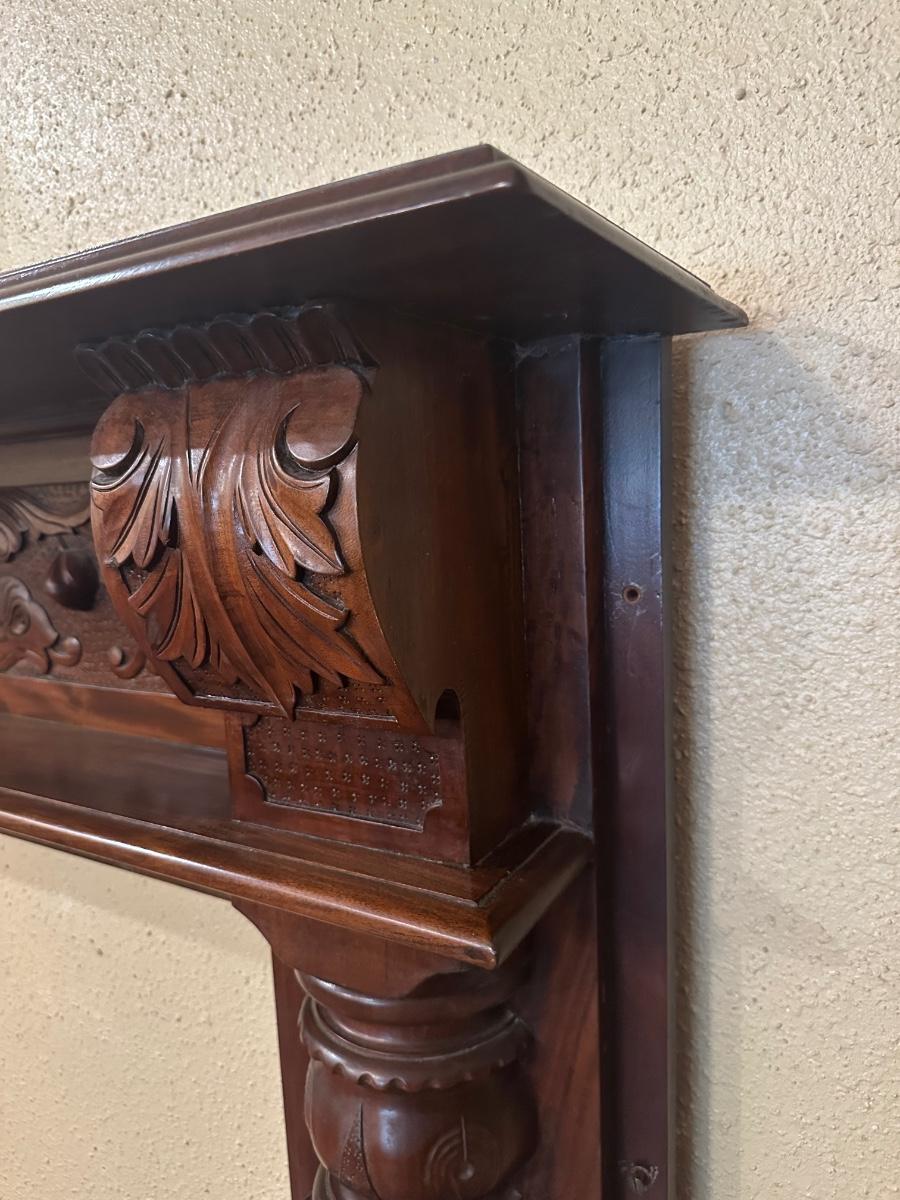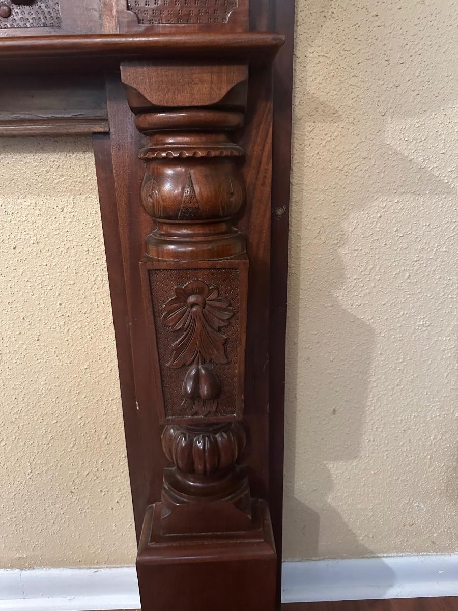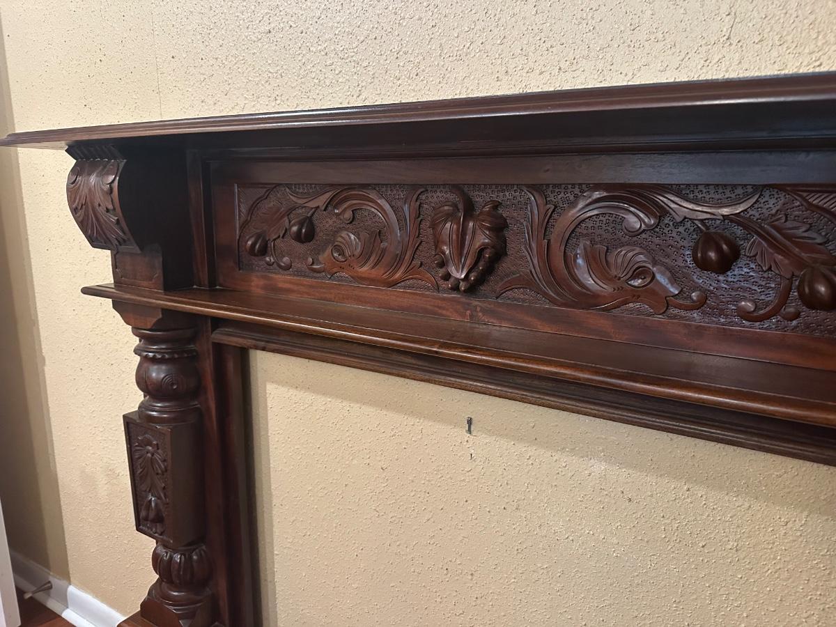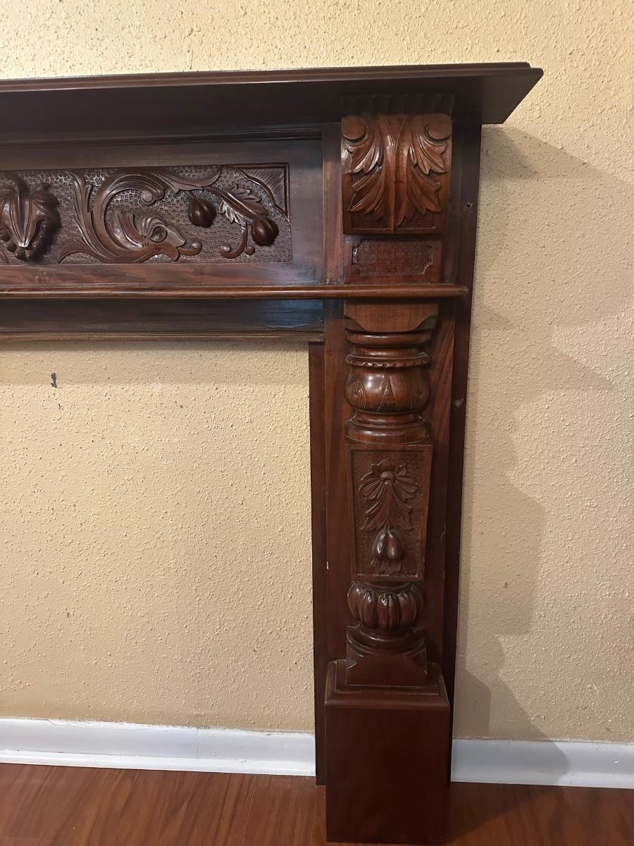 Carved wood fireplace mantel with decorative panel details and molded shelf. Light surface wear and prior mounting holes noted. Solid, heavy construction.