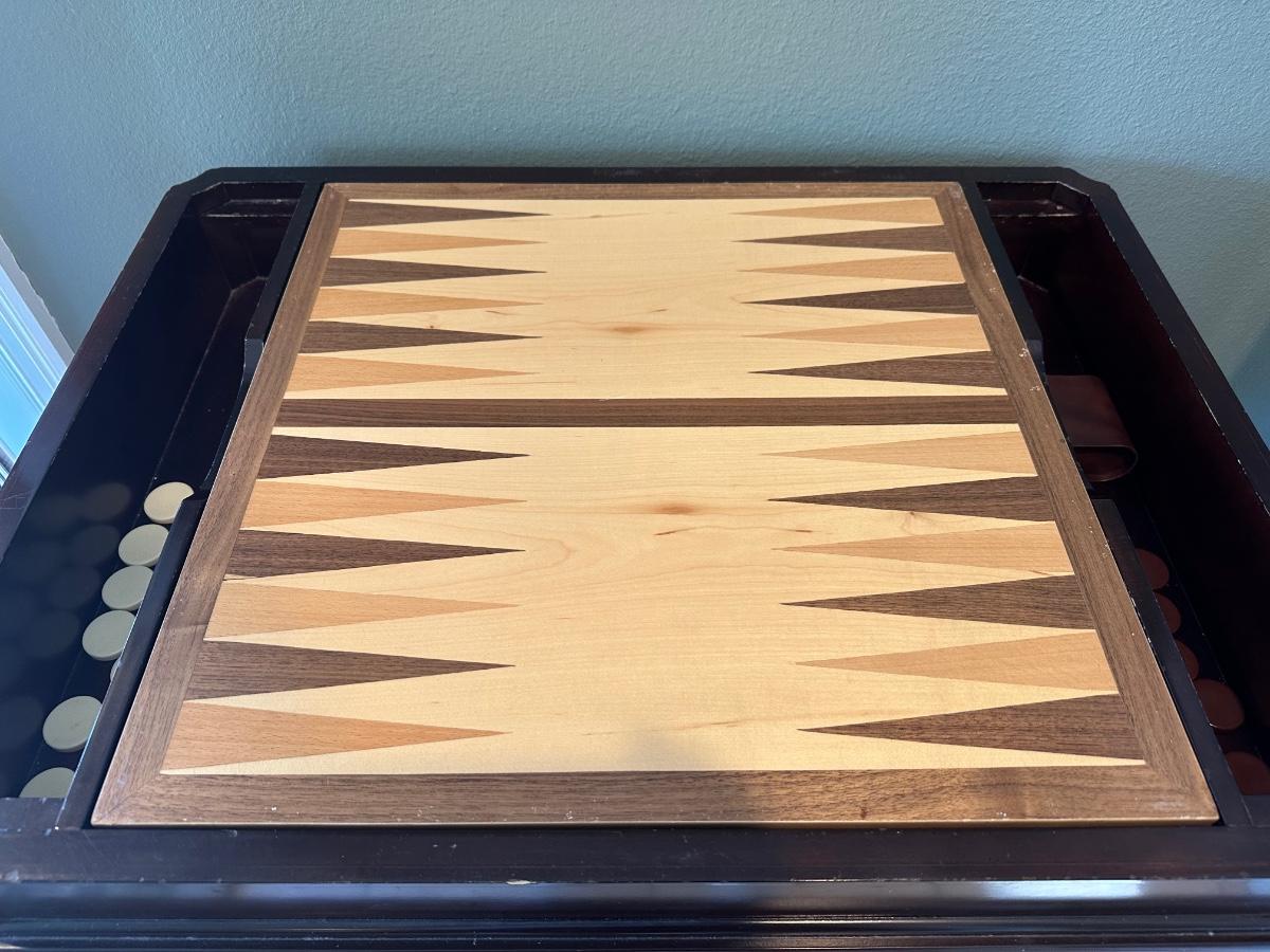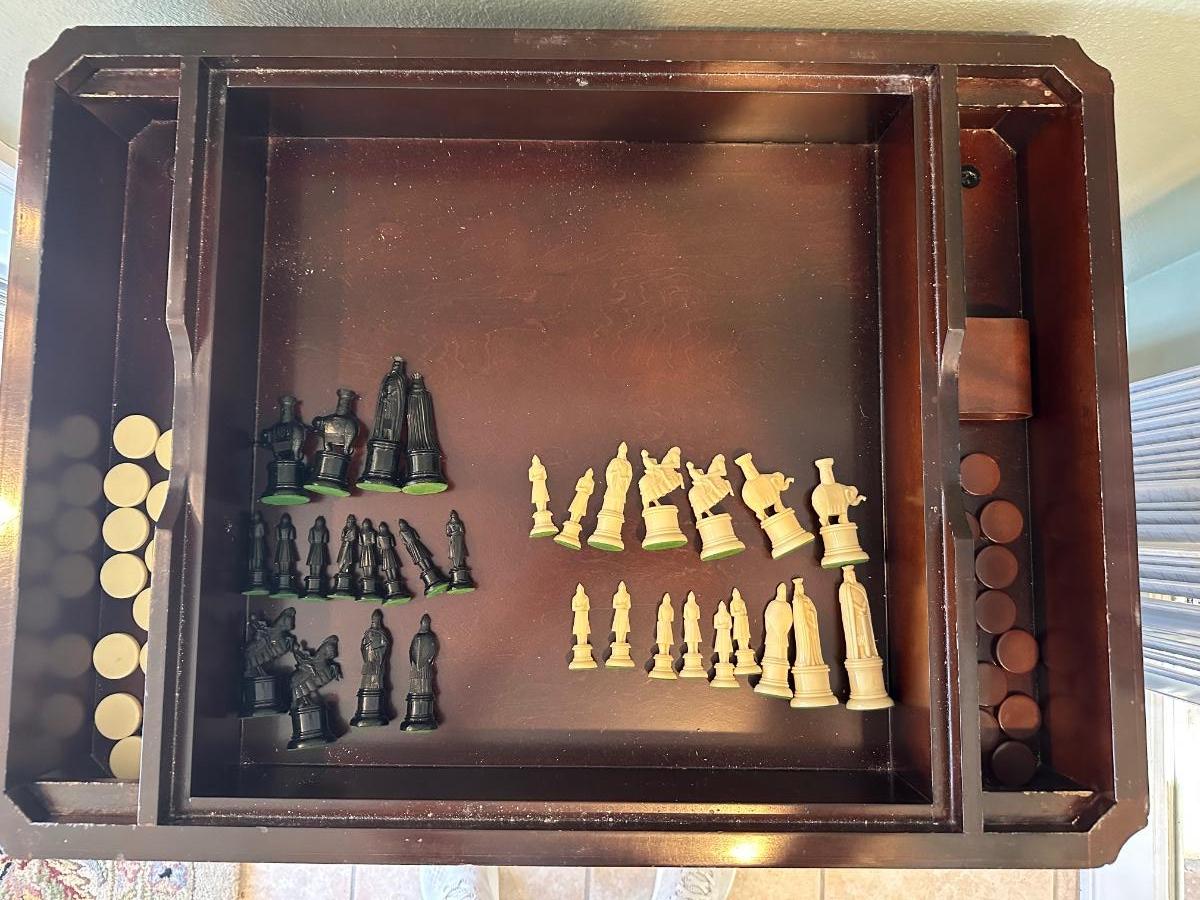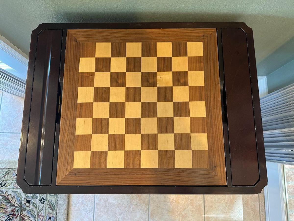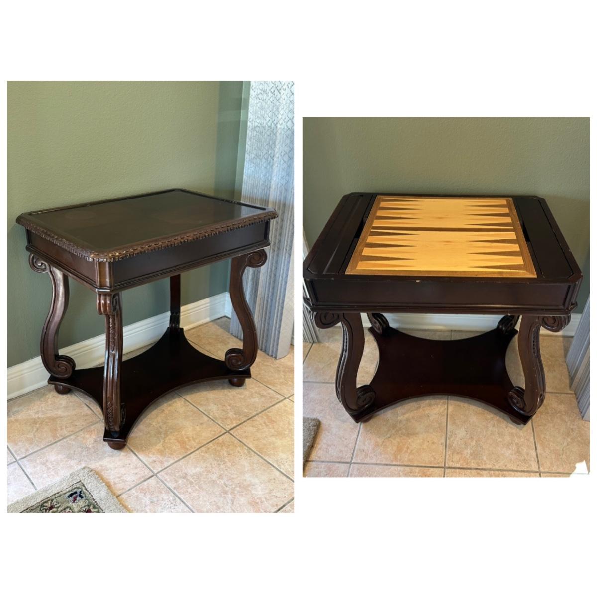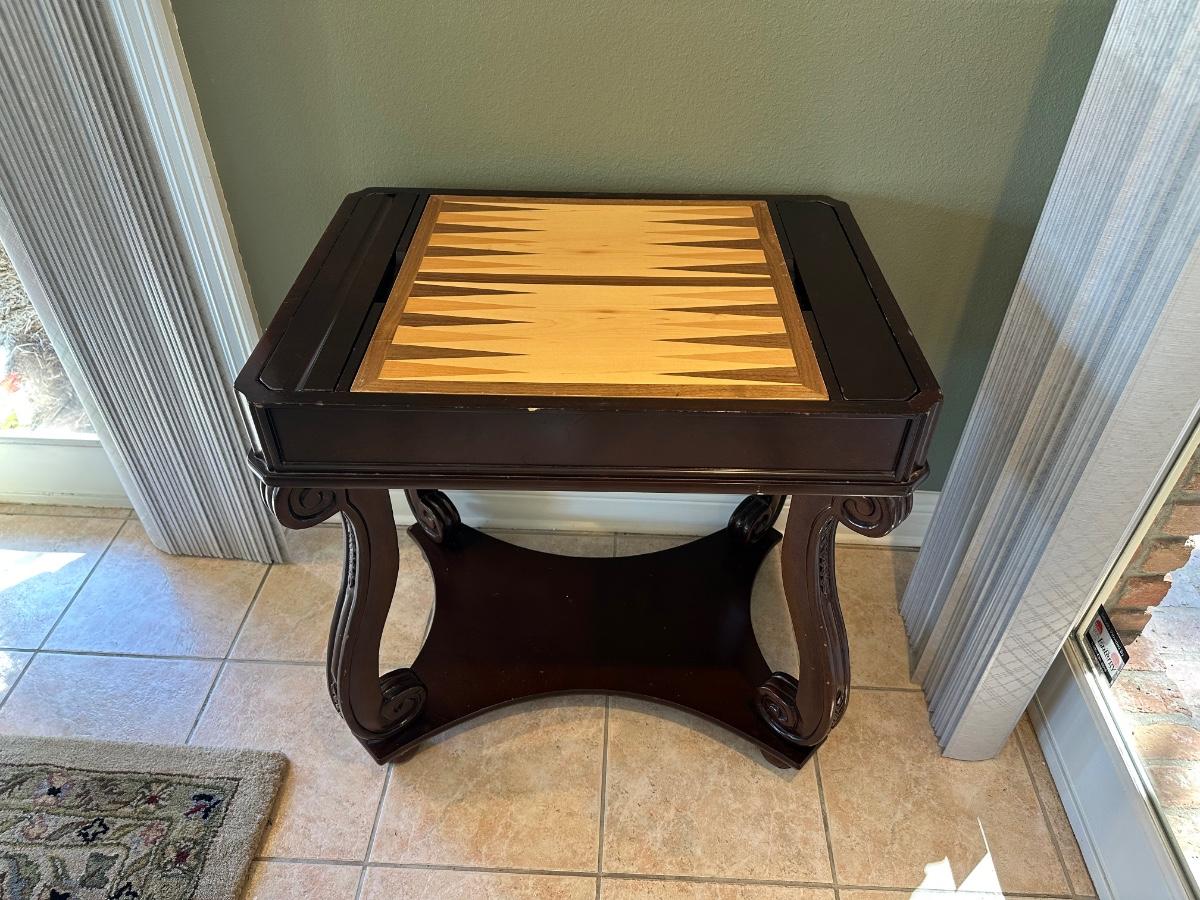 Carved Wood Game Table with Chess & Backgammon Tops.