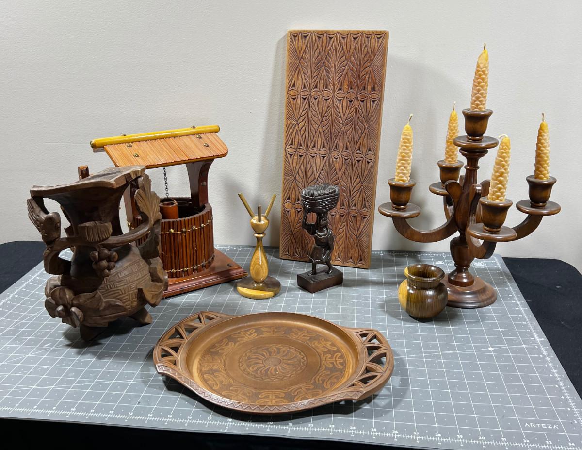 Carved Wood Lot: Wishing Well, Tray, Plaque, Jar, Grape Vase, Candle Stick Centerpiece