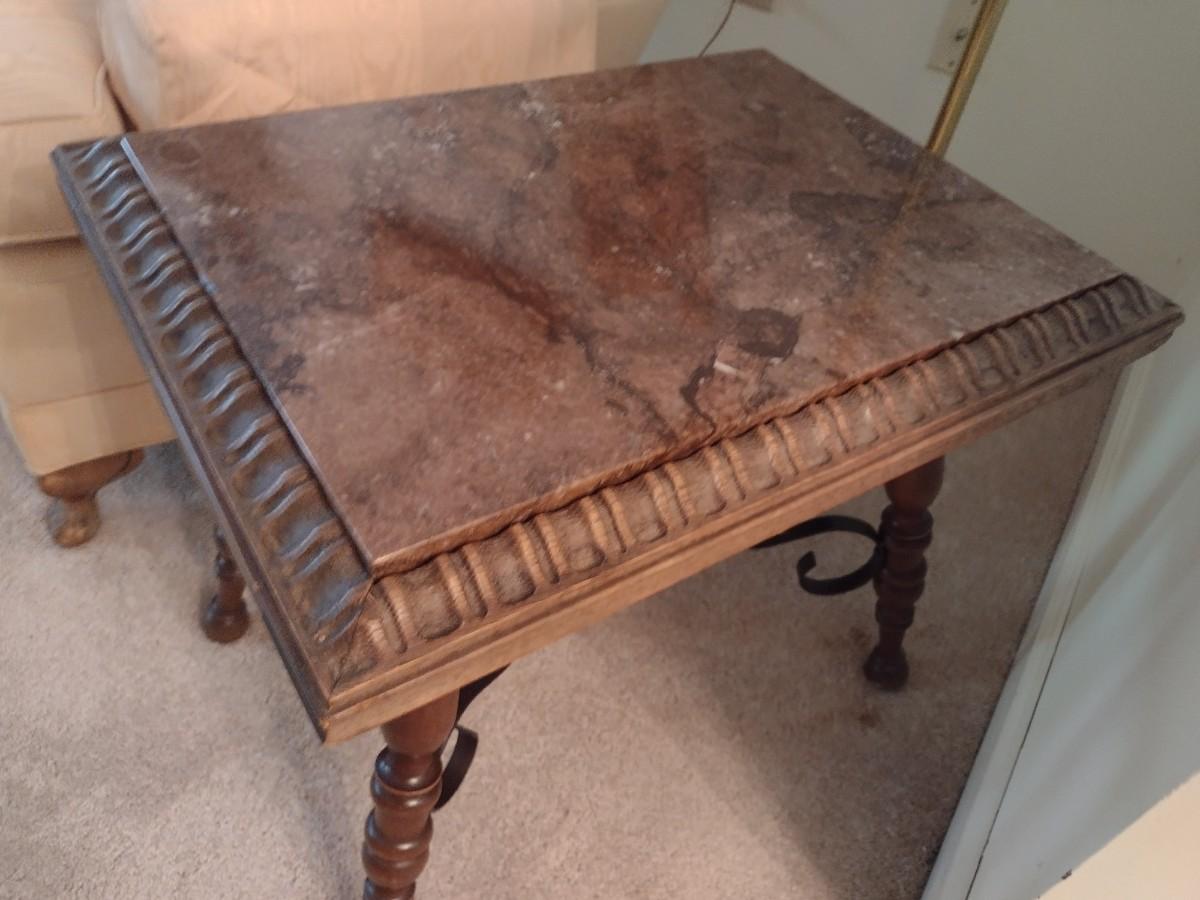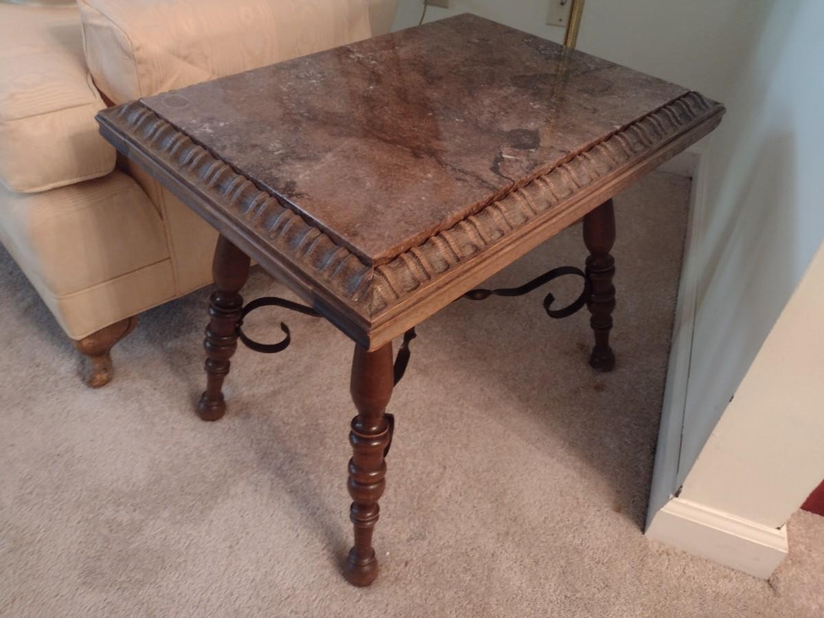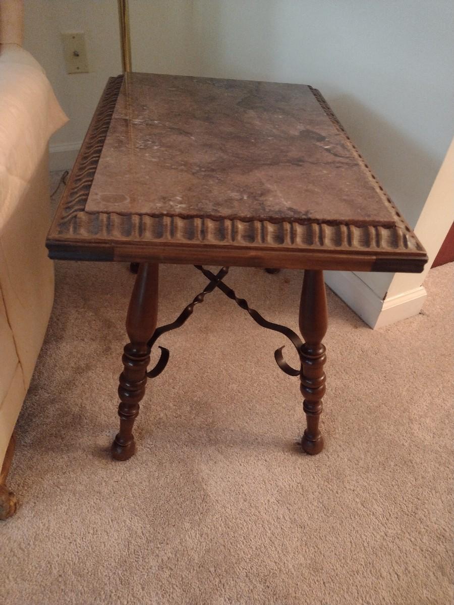 Carved Wood Marble Top Table with Wrought Metal Stretcher