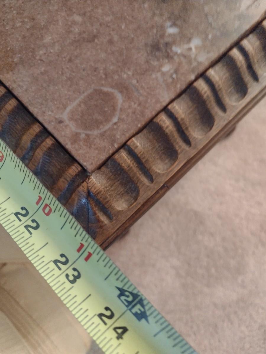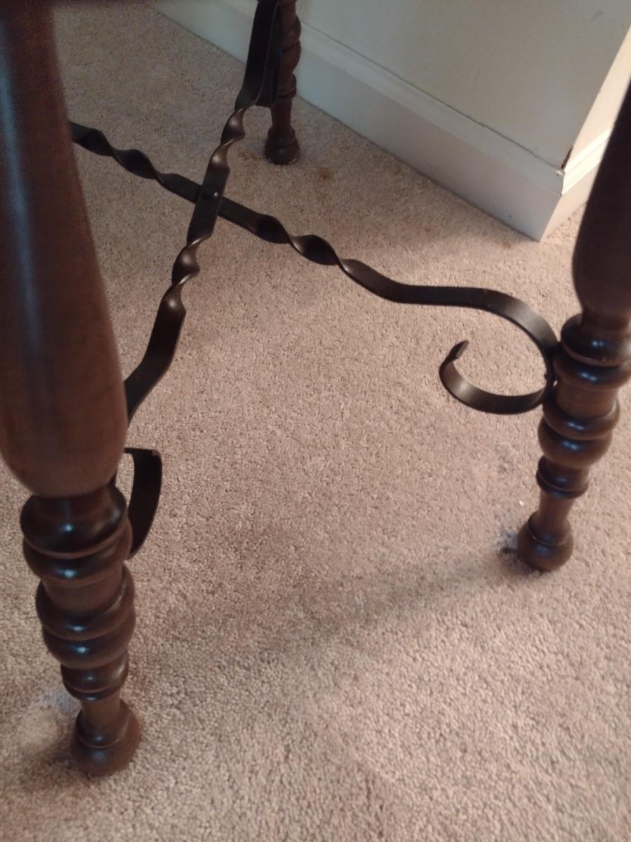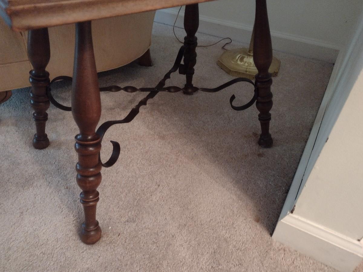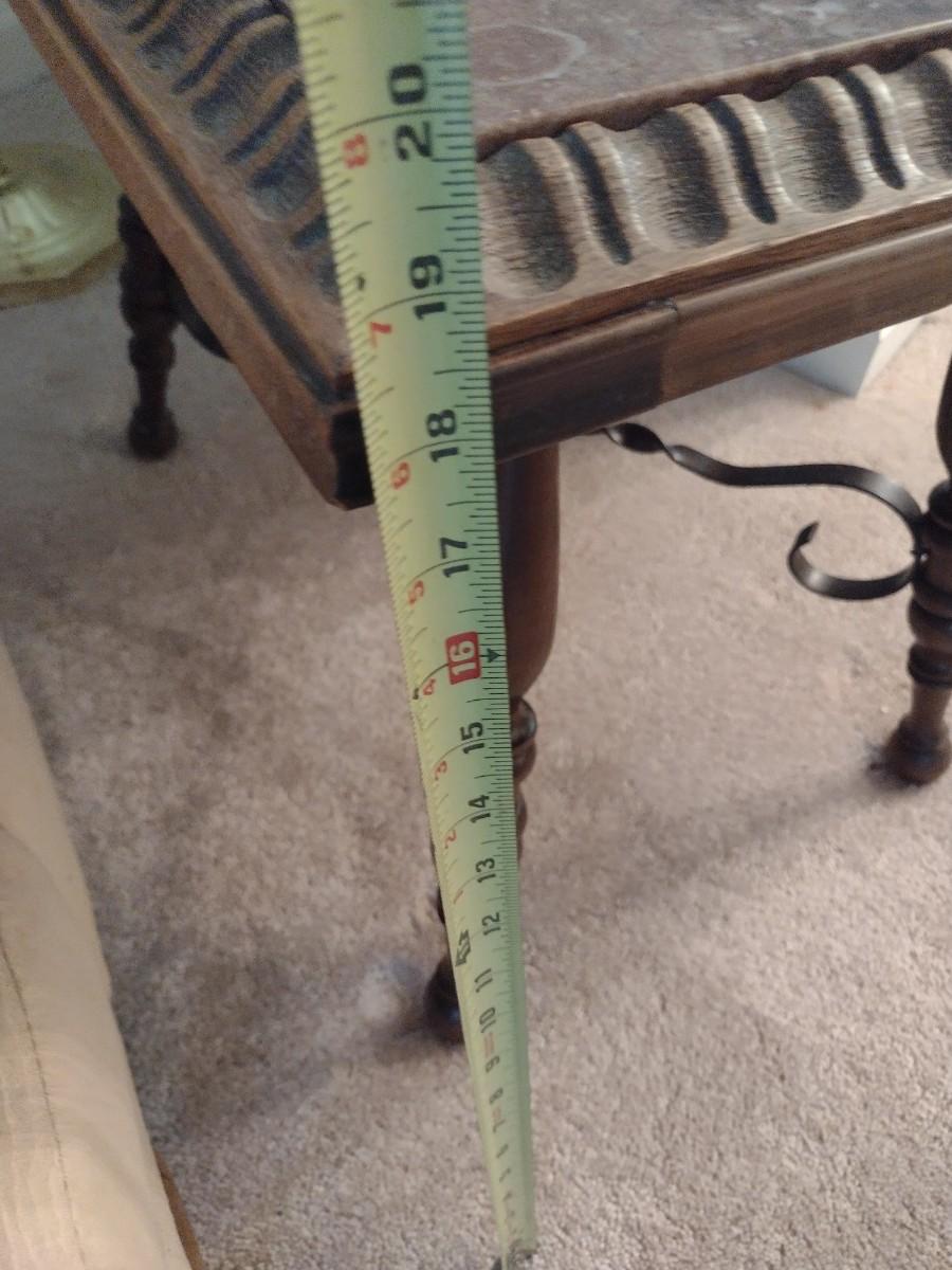 Carved Wood Marble Top Table with Wrought Metal Stretcher