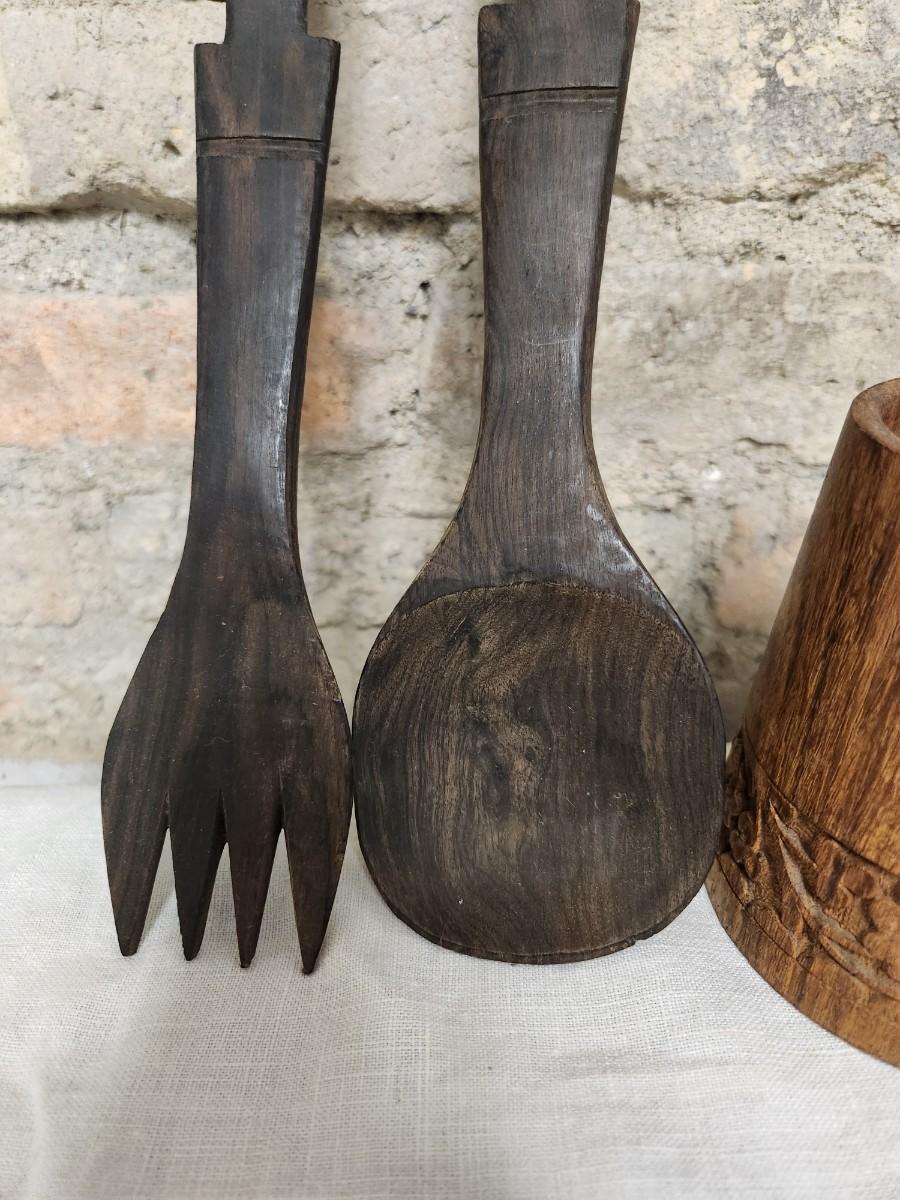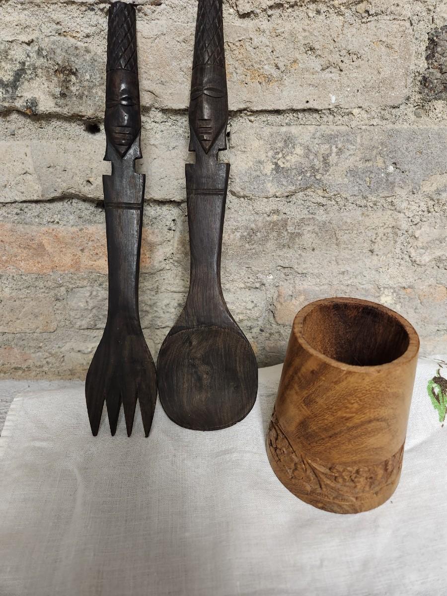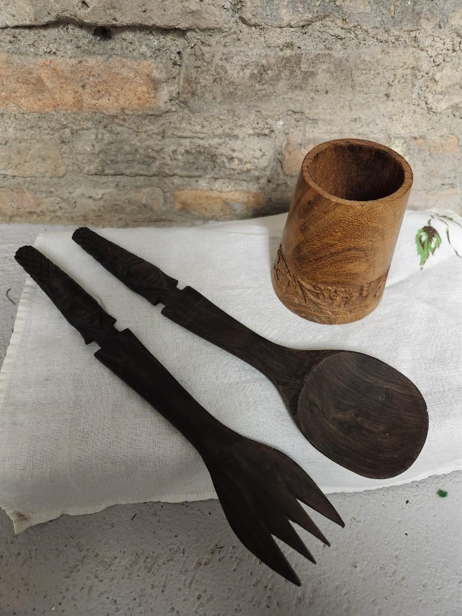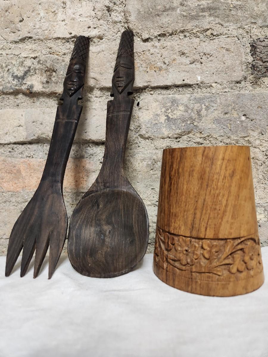The salad set is ebony carved wood and the small MCM wood holder is likely teak.