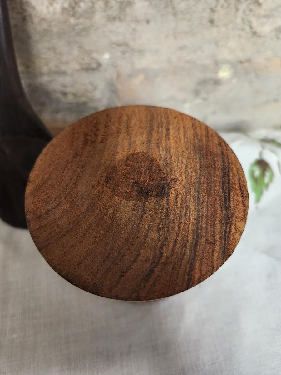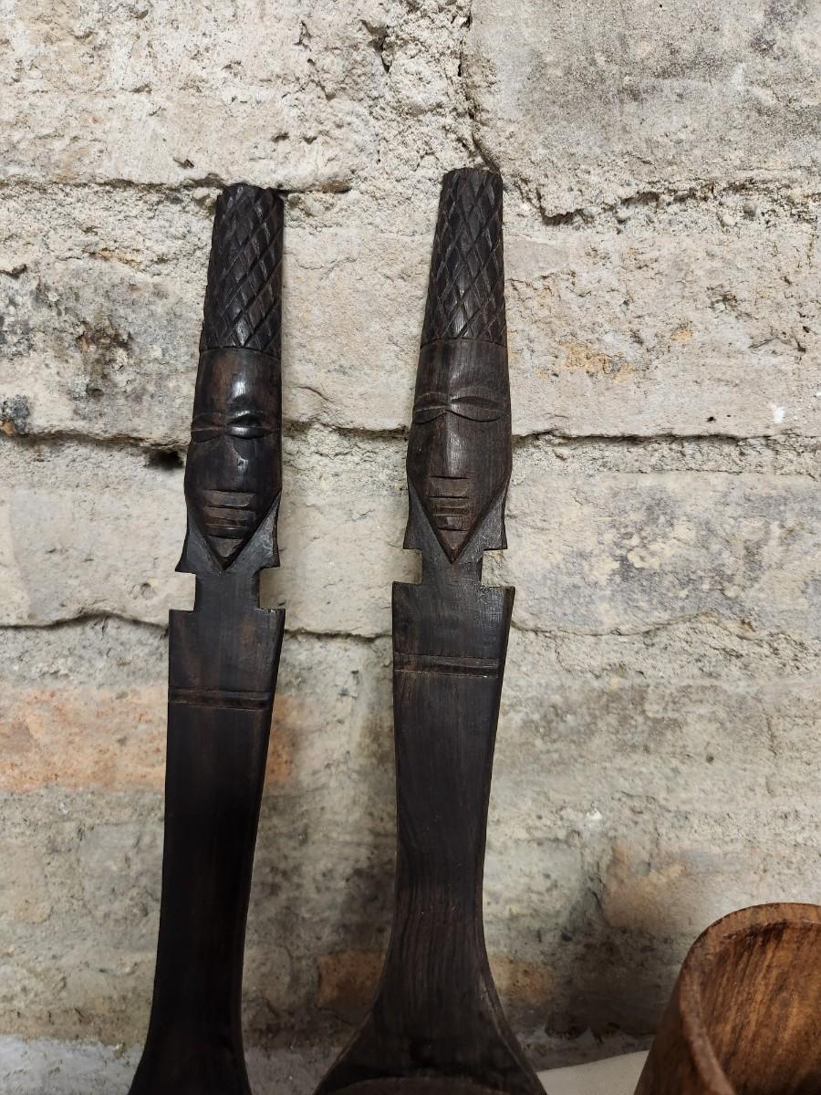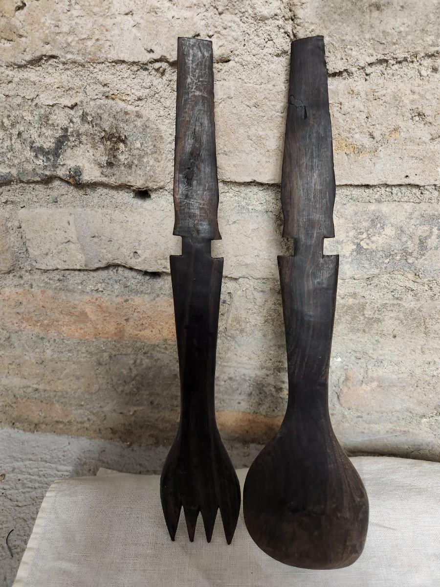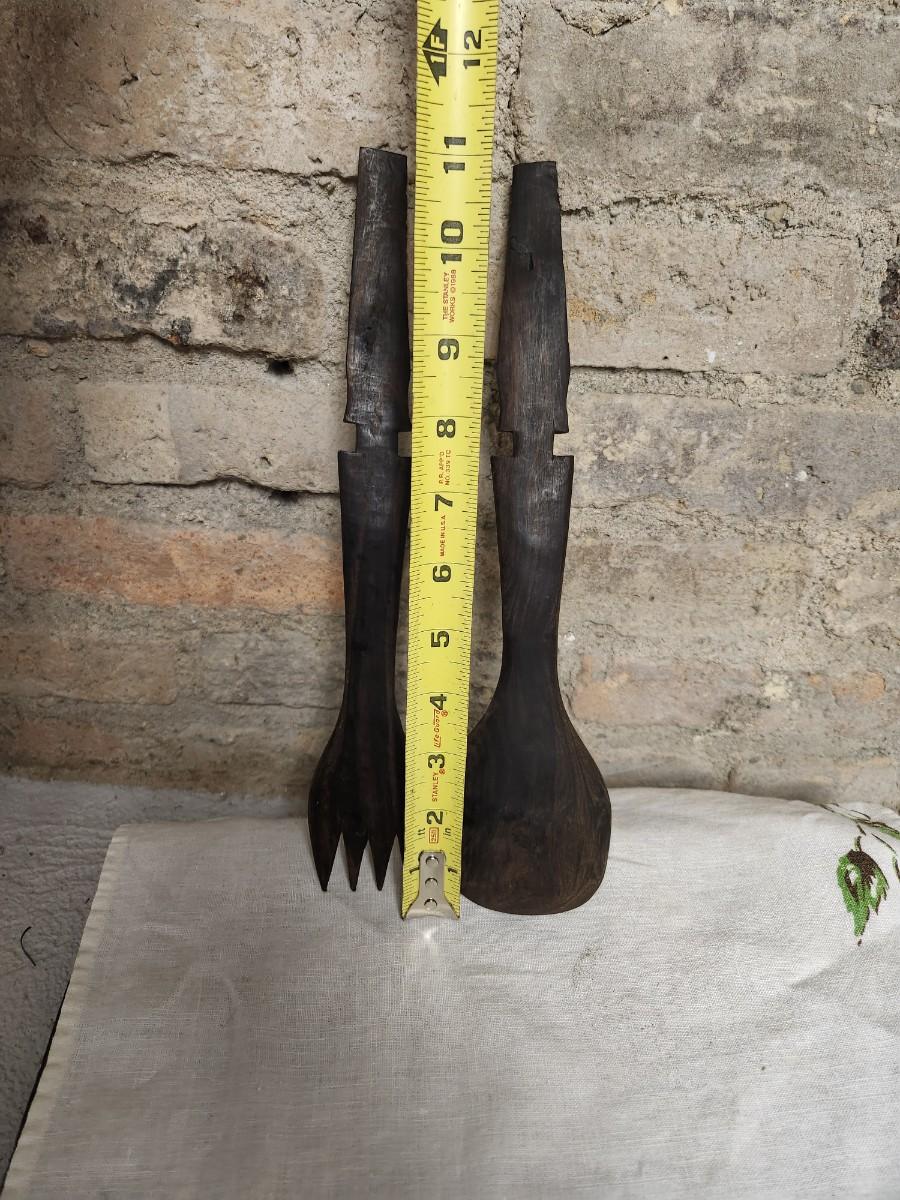 The salad set is ebony carved wood and the small MCM wood holder is likely teak.
