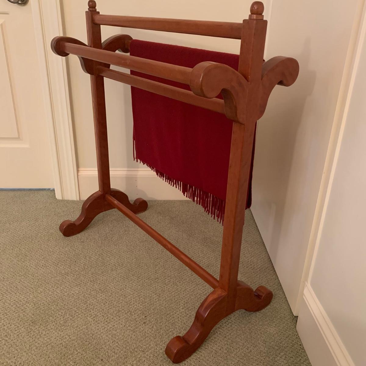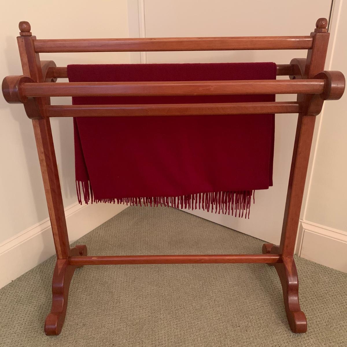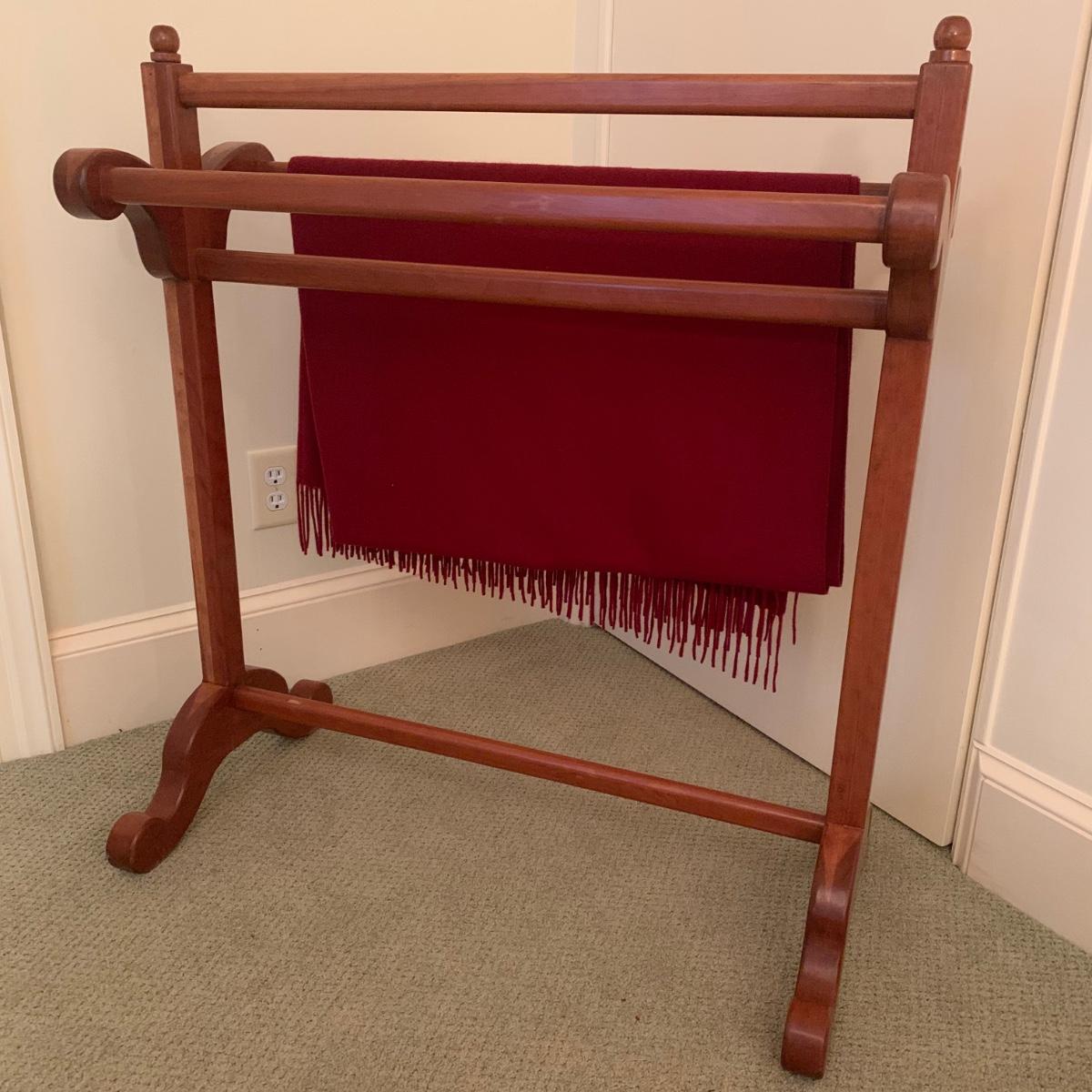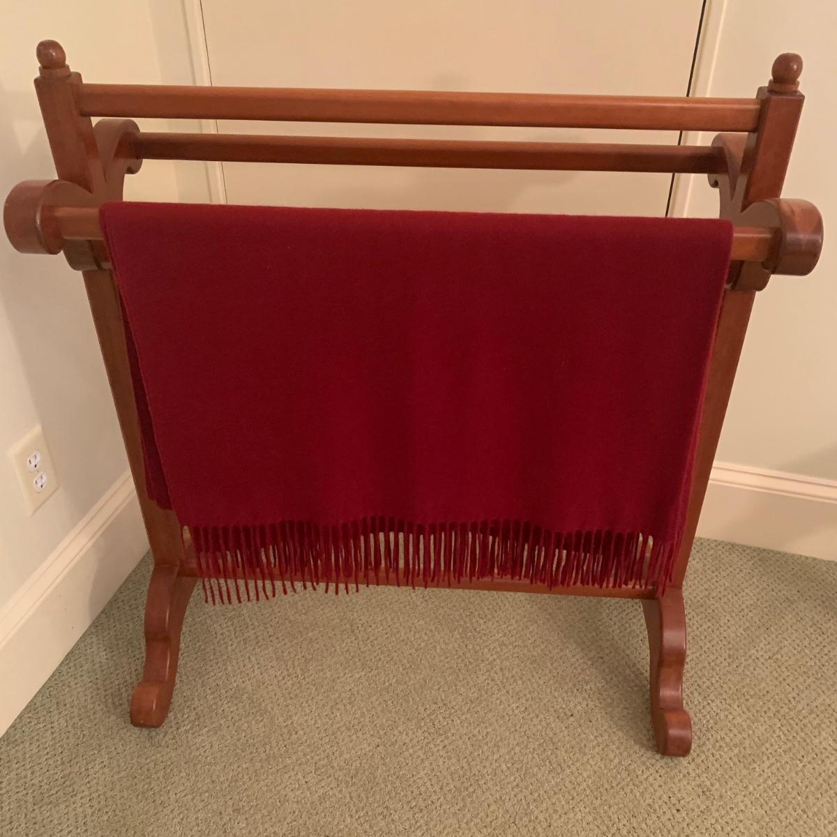 Solid wood quilt rack with small red throw blanket. Rack measures approximately 32.5” x 17” x 36”H, blanket 69" x 50". Local pickup only.