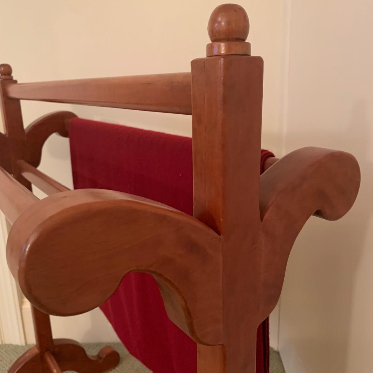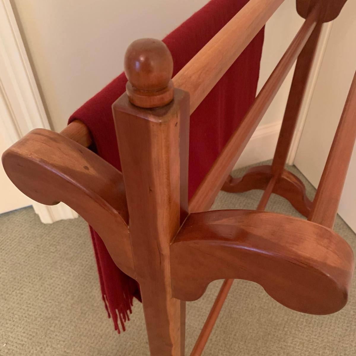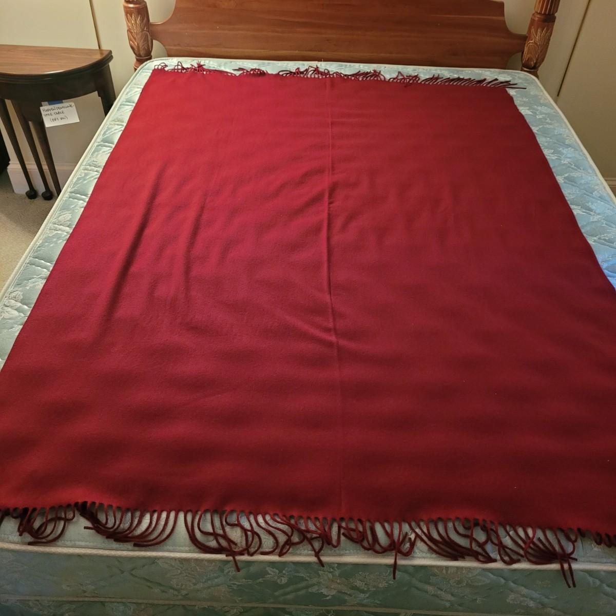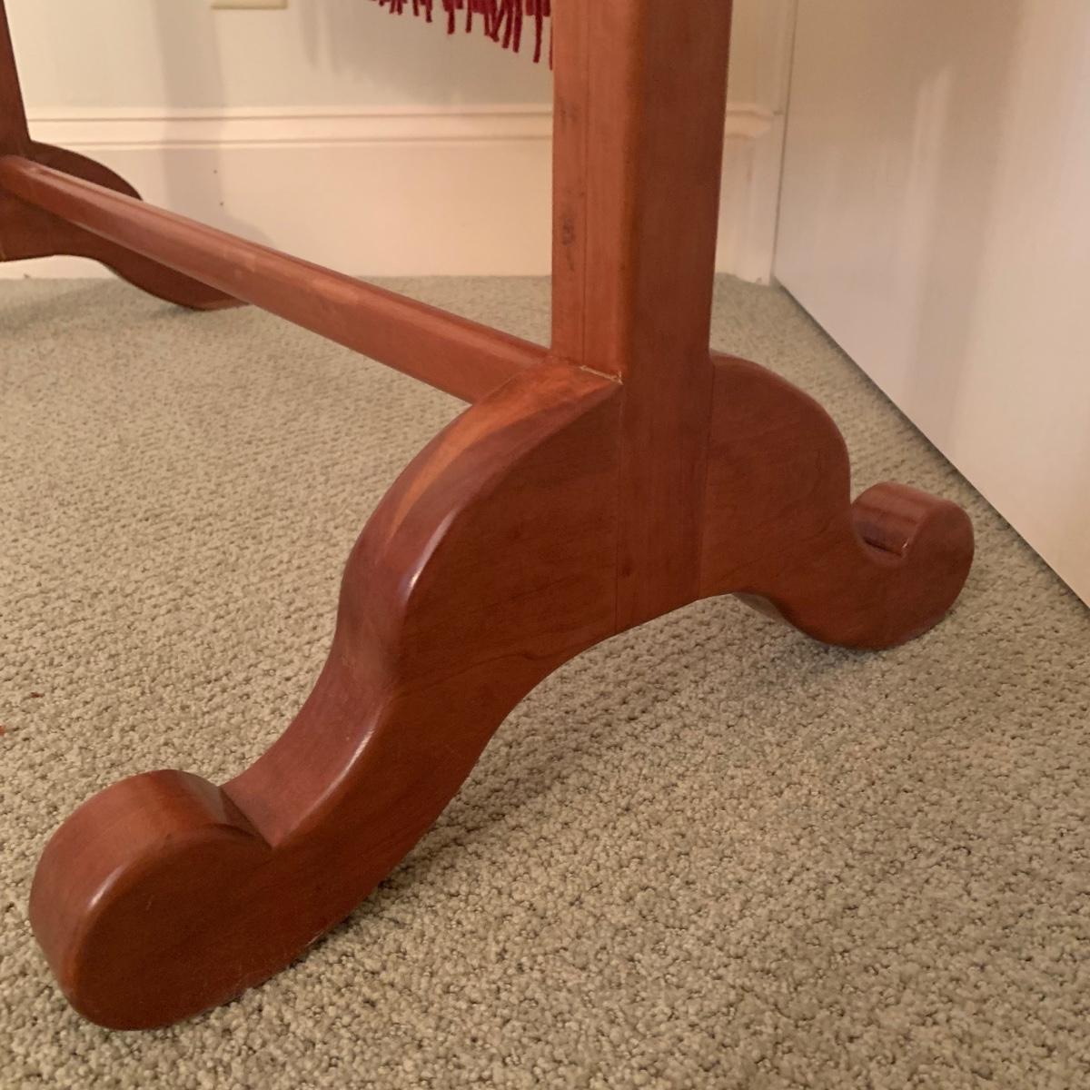 Solid wood quilt rack with small red throw blanket. Rack measures approximately 32.5” x 17” x 36”H, blanket 69" x 50". Local pickup only.