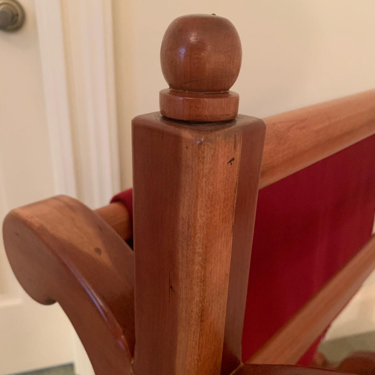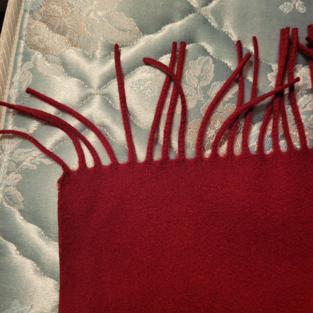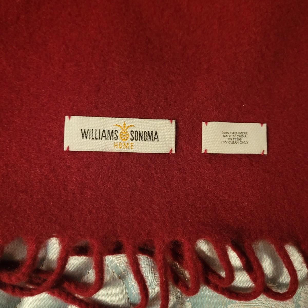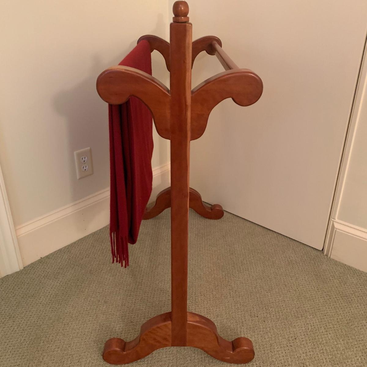 Solid wood quilt rack with small red throw blanket. Rack measures approximately 32.5” x 17” x 36”H, blanket 69" x 50". Local pickup only.