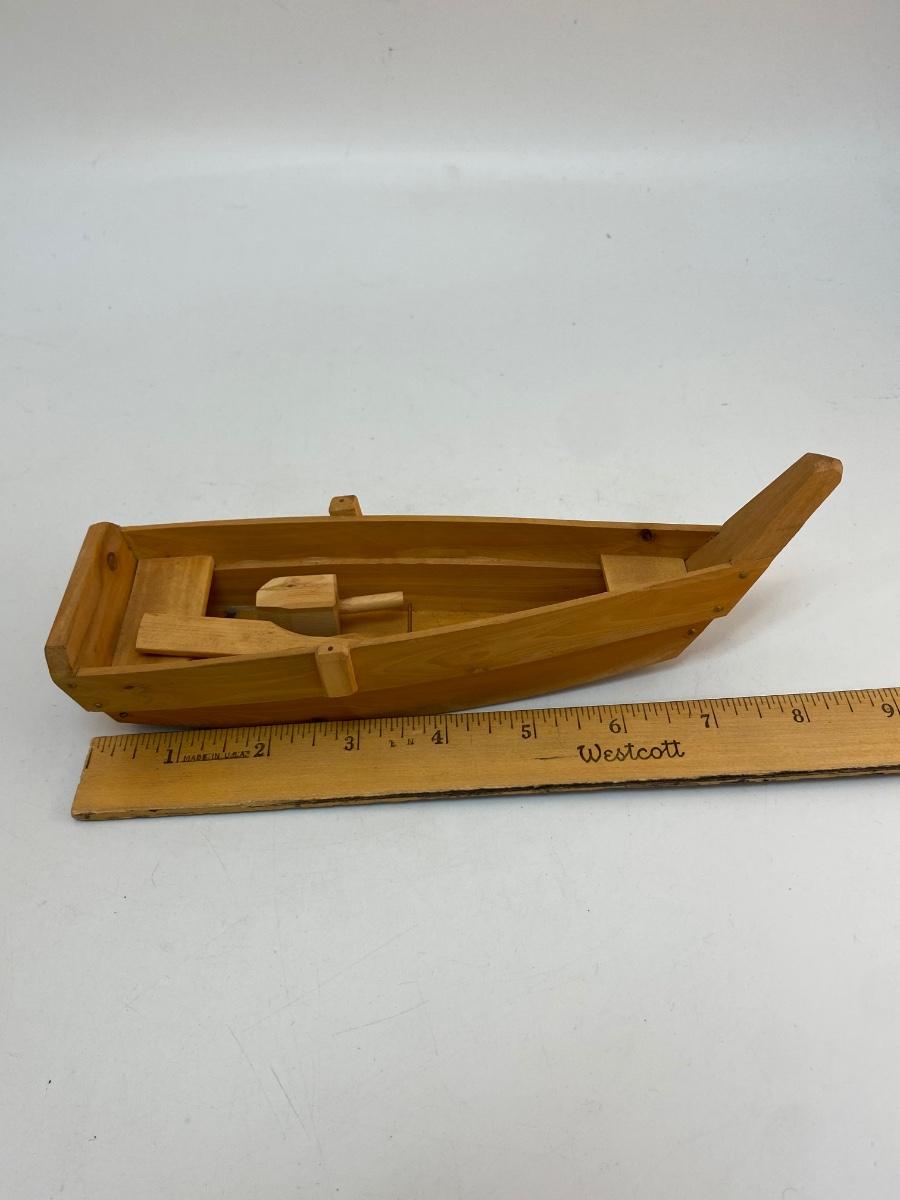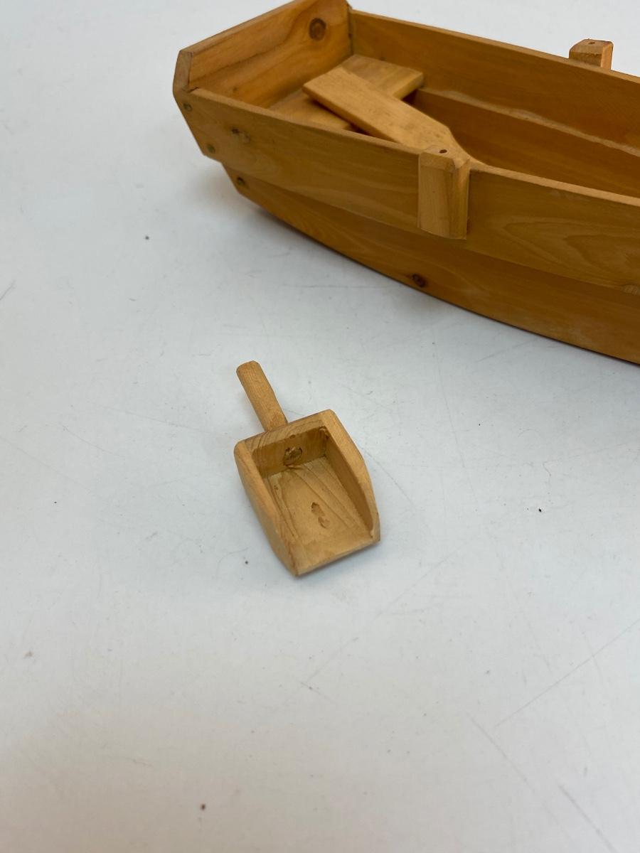 Carved Wood Rowboat Boat with Moveable Oars. Oars are on metal pins. Good condition. Includes a small wood scoop made of same wood.