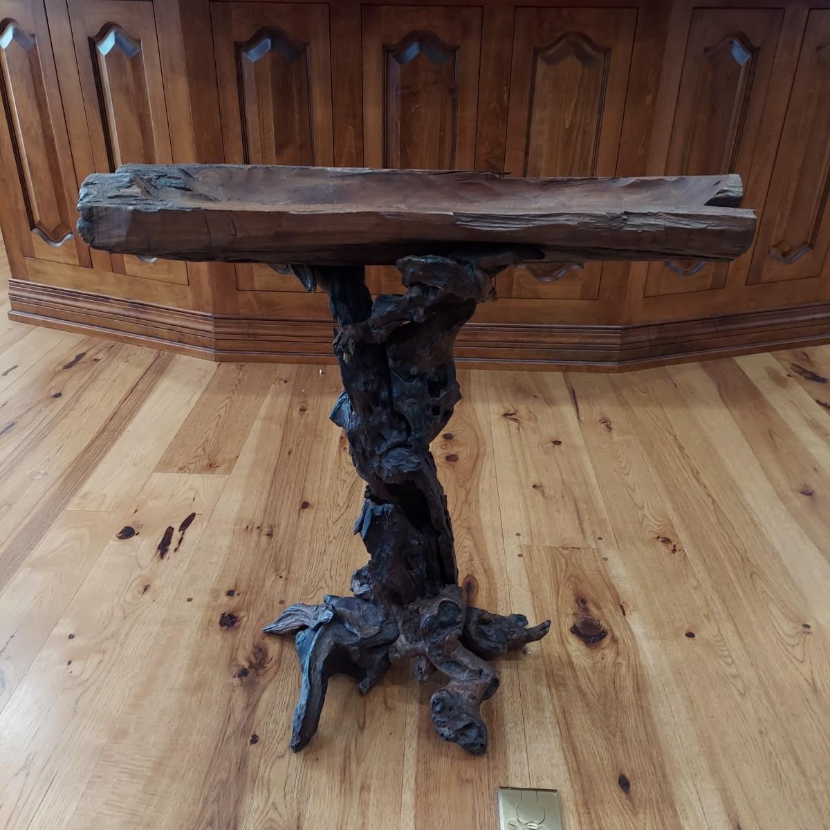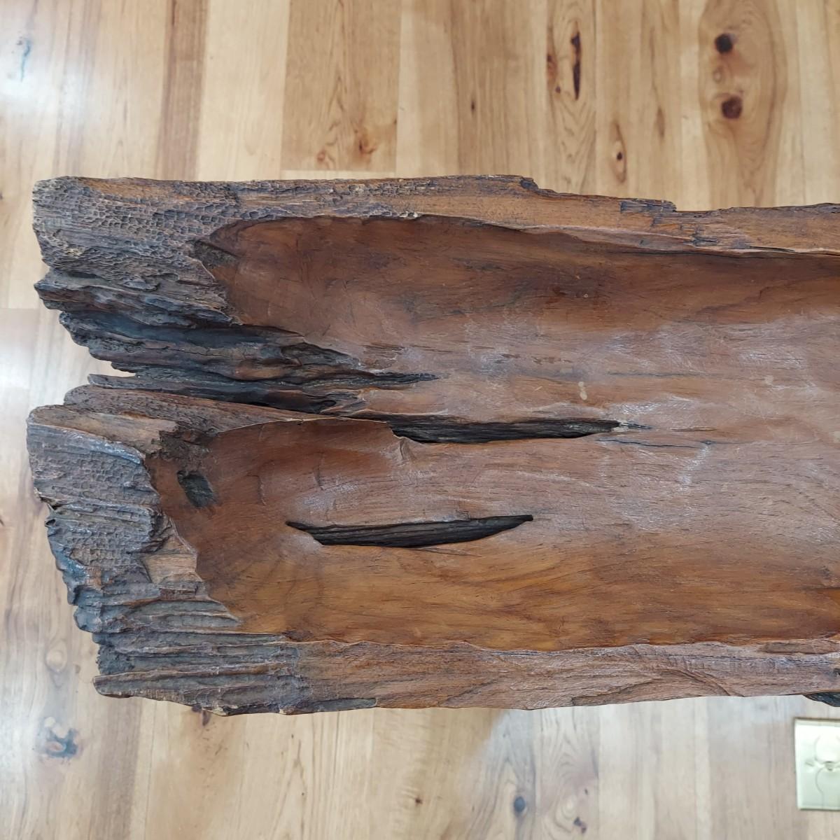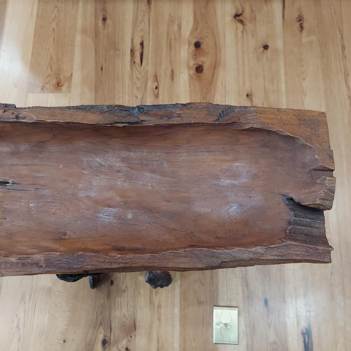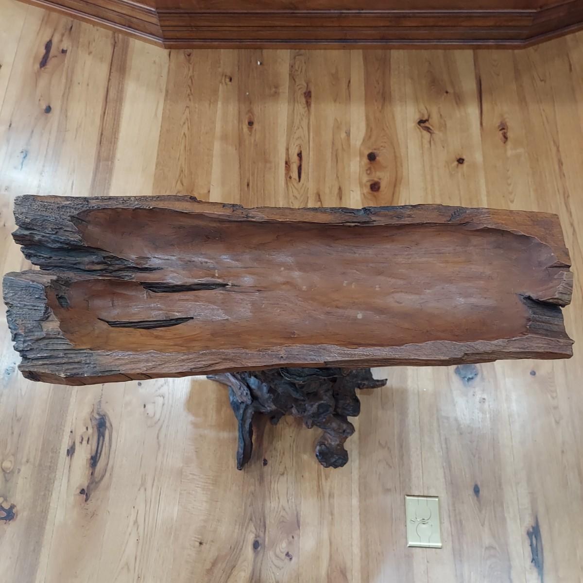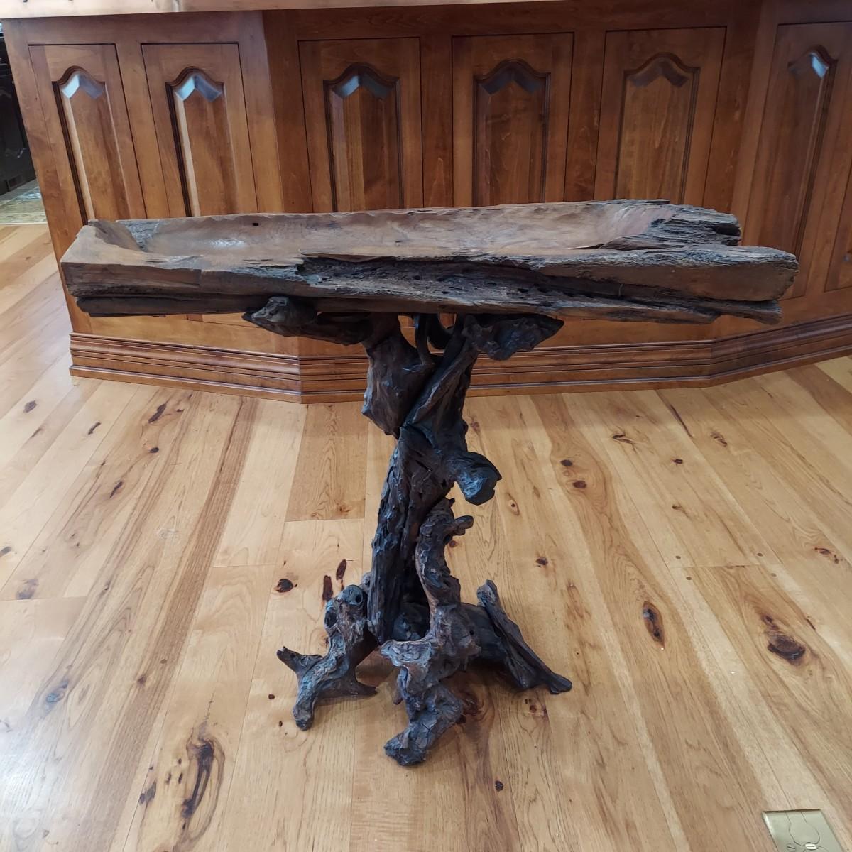 Solid wood table with carved out top. It looks like cypress but does not have any markings. Approximately 33" x 17" x 30"H. Local Pickup Only