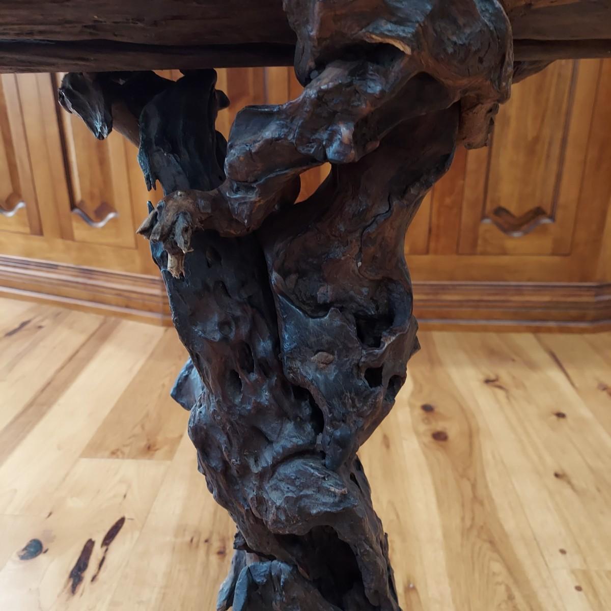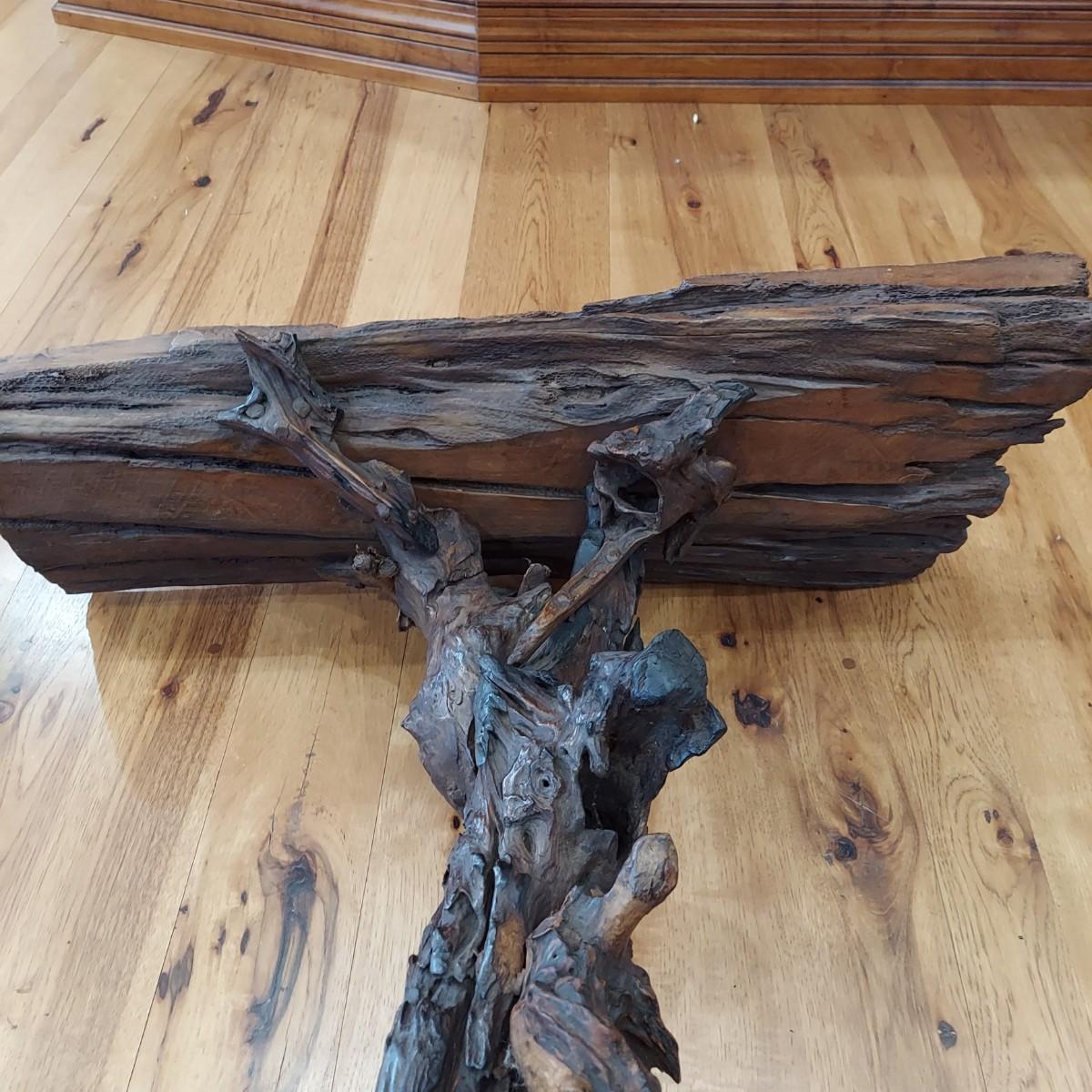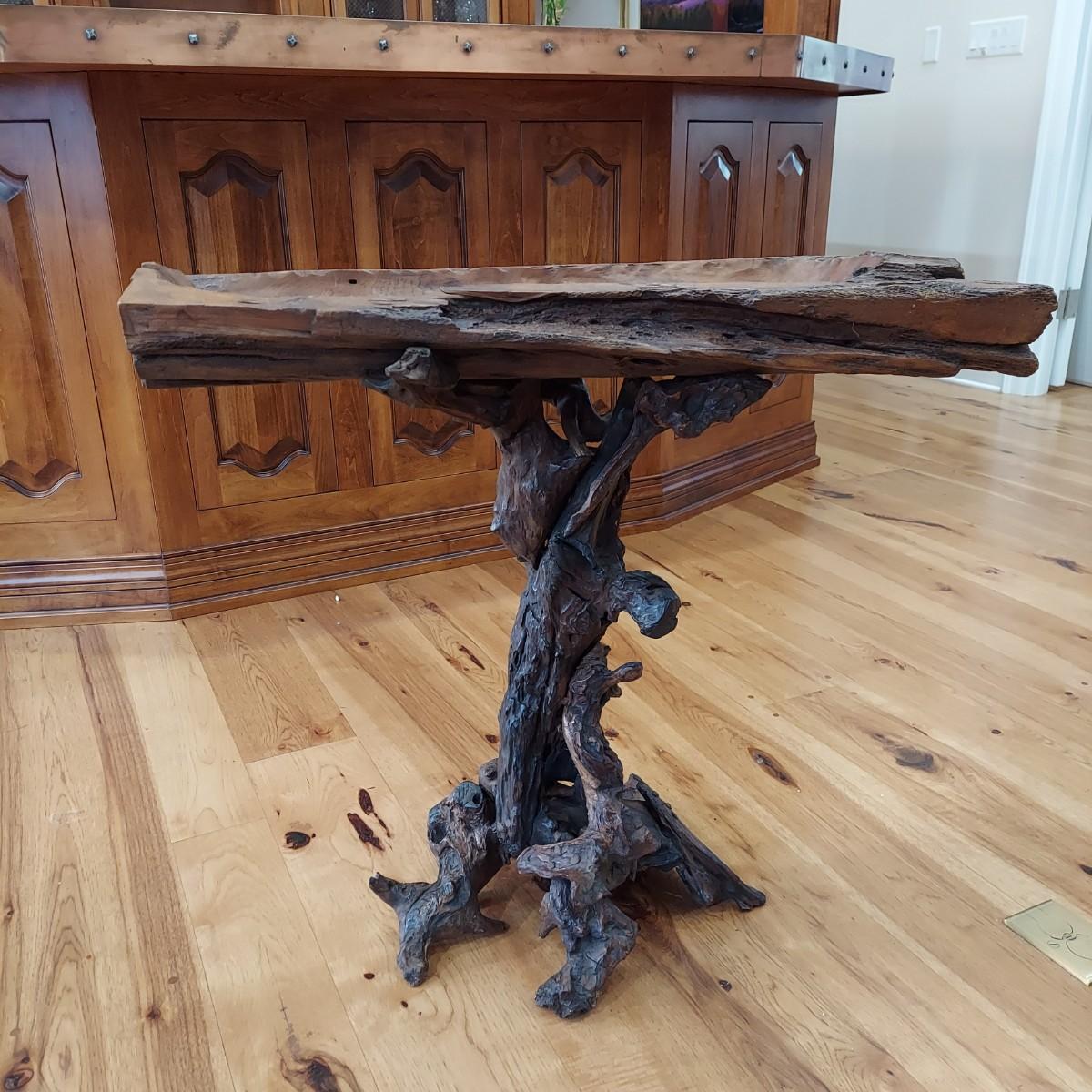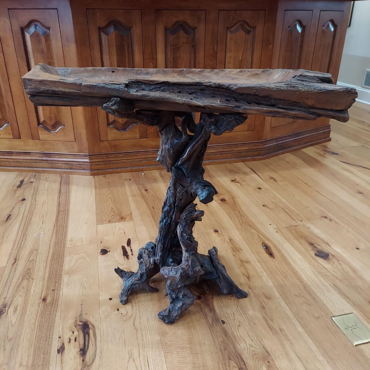 Solid wood table with carved out top. It looks like cypress but does not have any markings. Approximately 33" x 17" x 30"H. Local Pickup Only