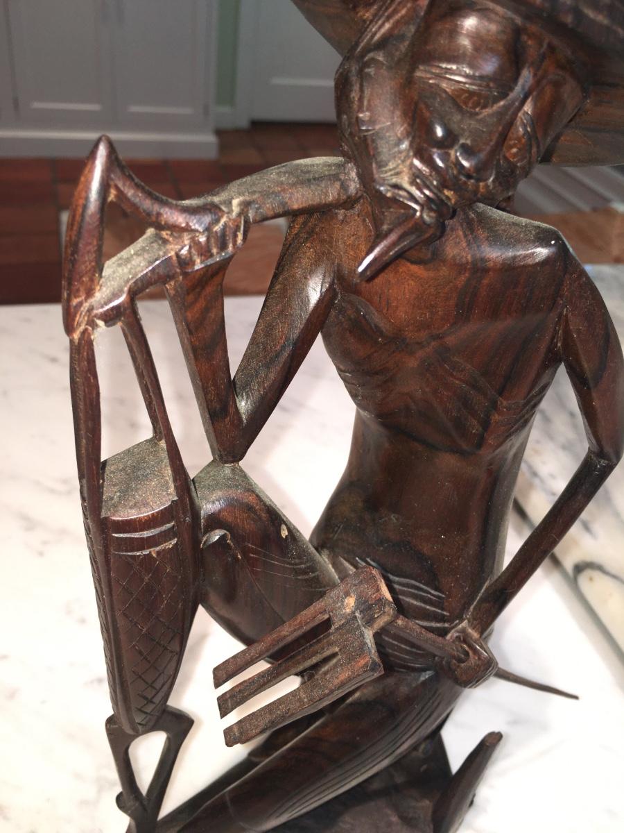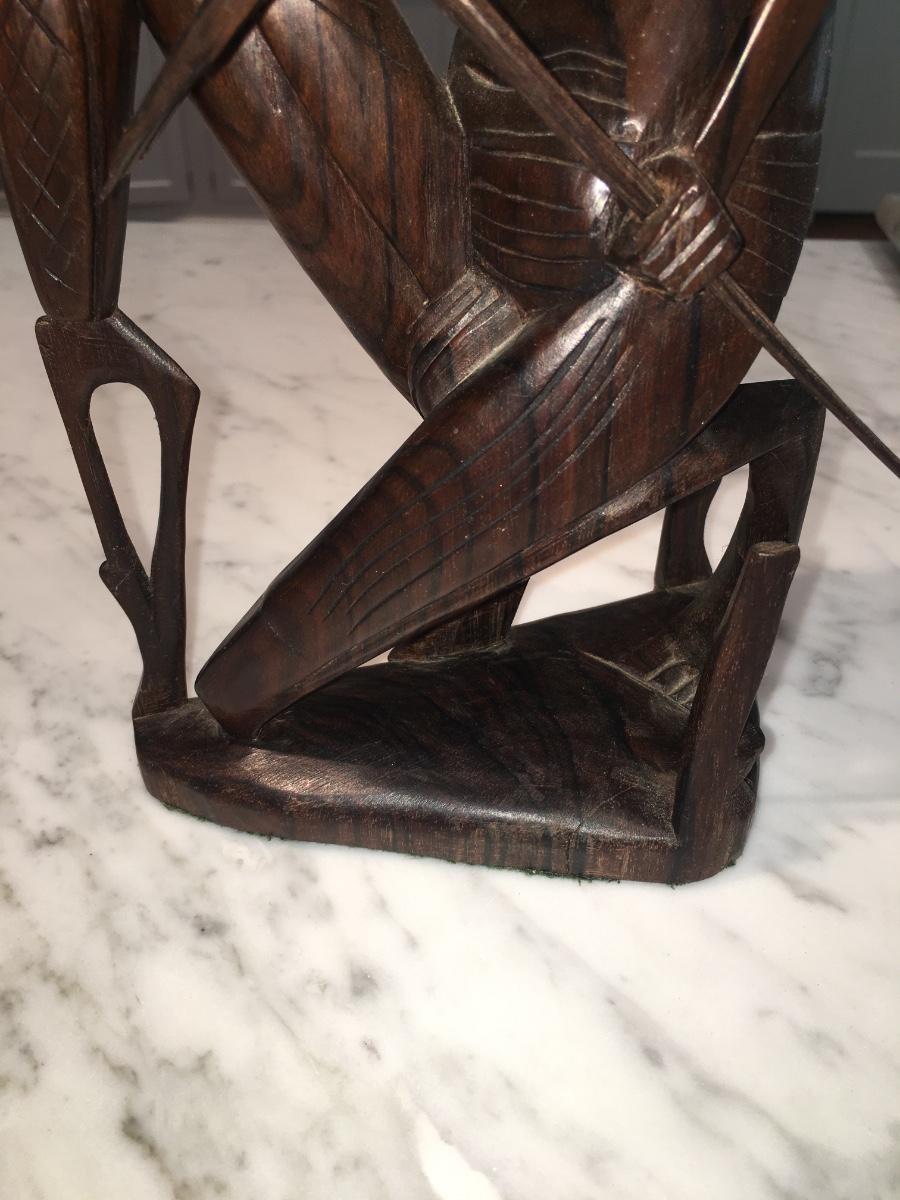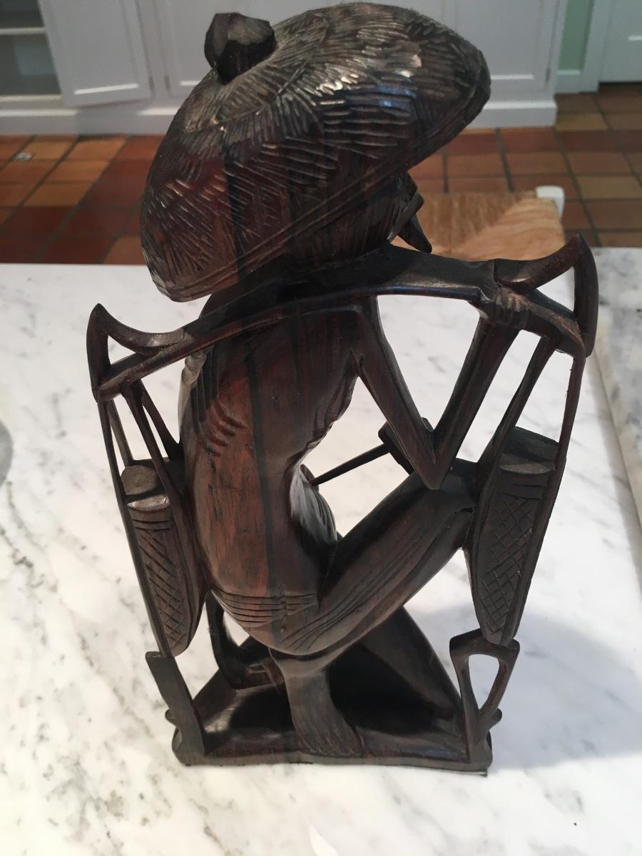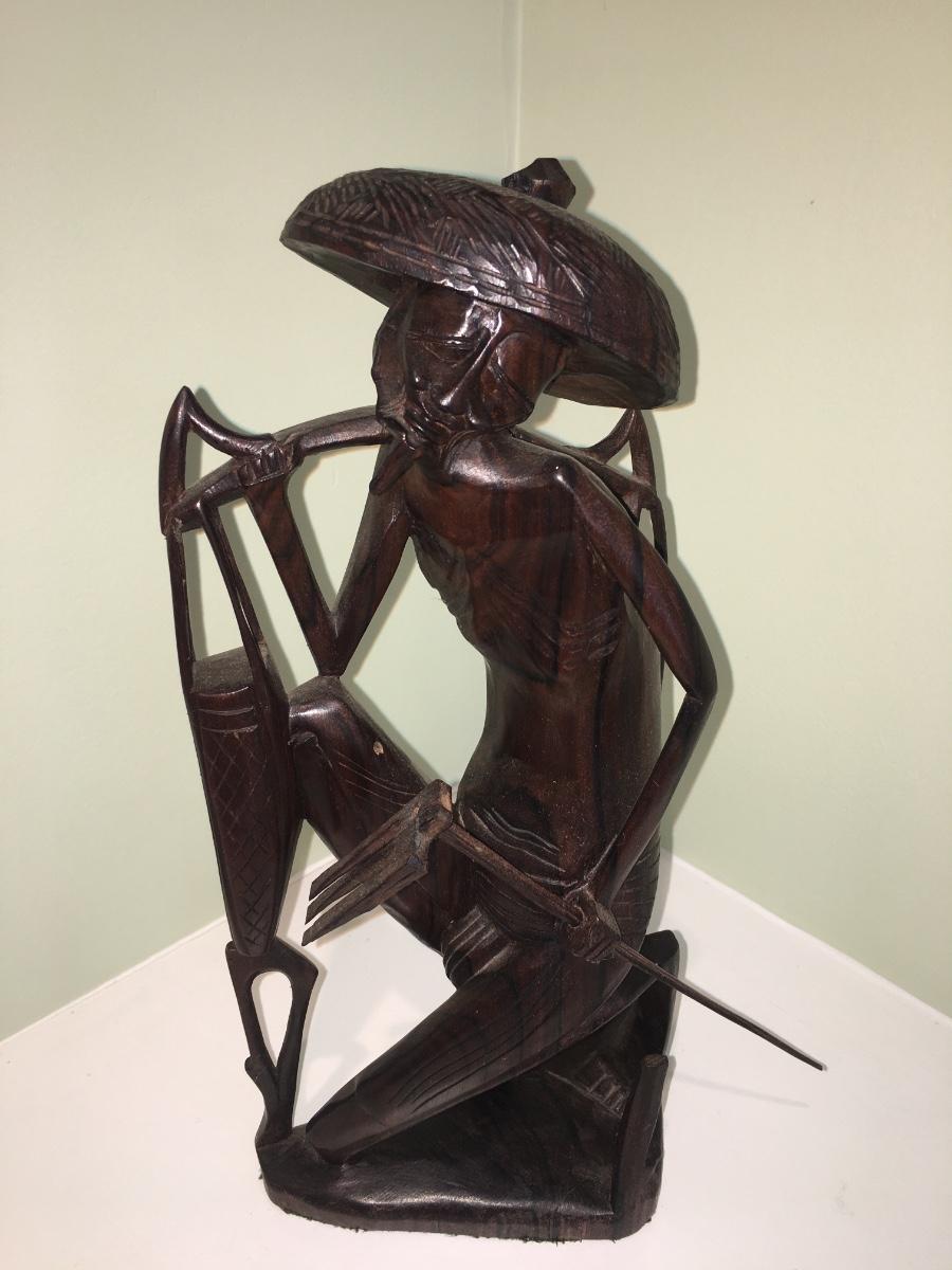 Very intricately carved statue of man wearing hat and carrying farming tool. No signs of damage. Signed on bottom.