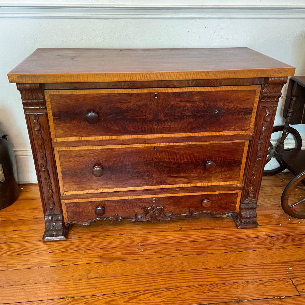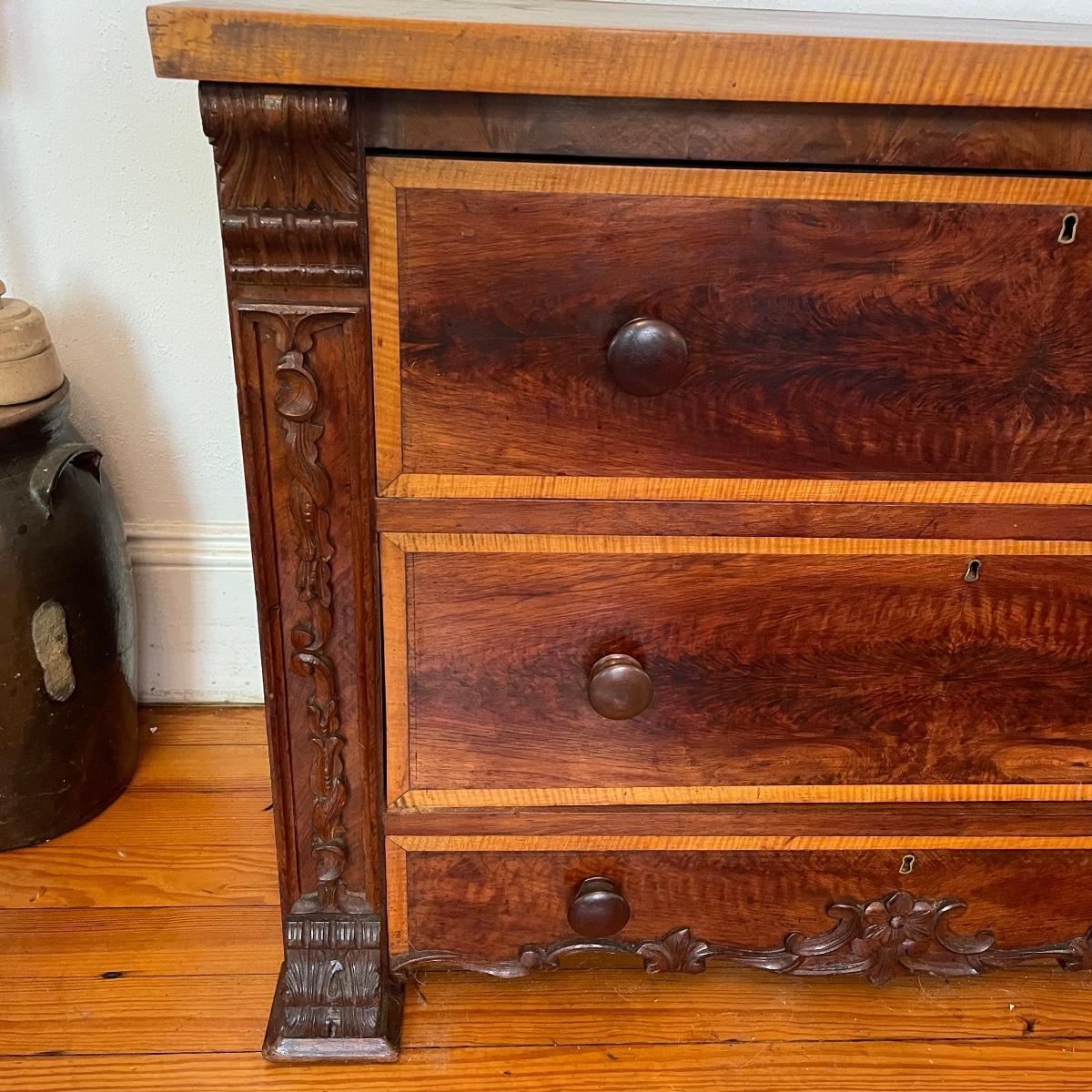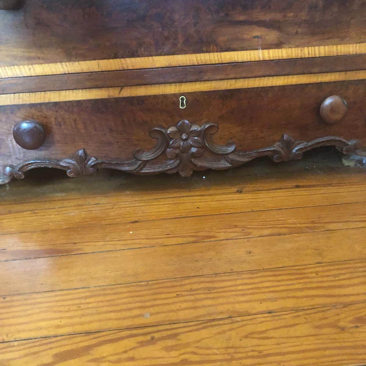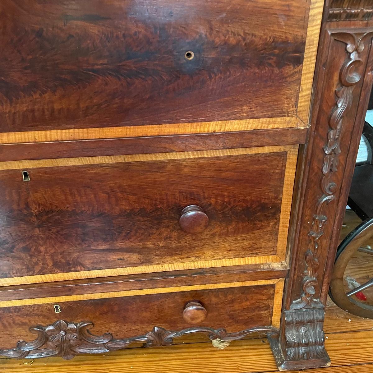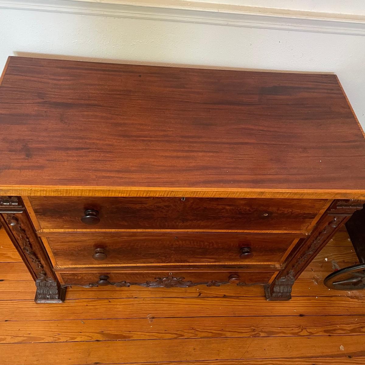 This dresser has three dovetailed drawer with wooden pulls (note one pull needs to put back on) and some intricate carved details. No keys for the 3 locks.