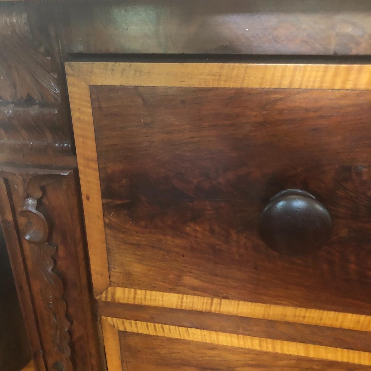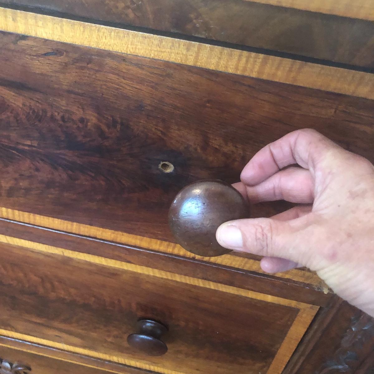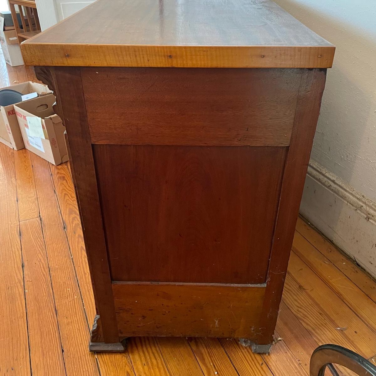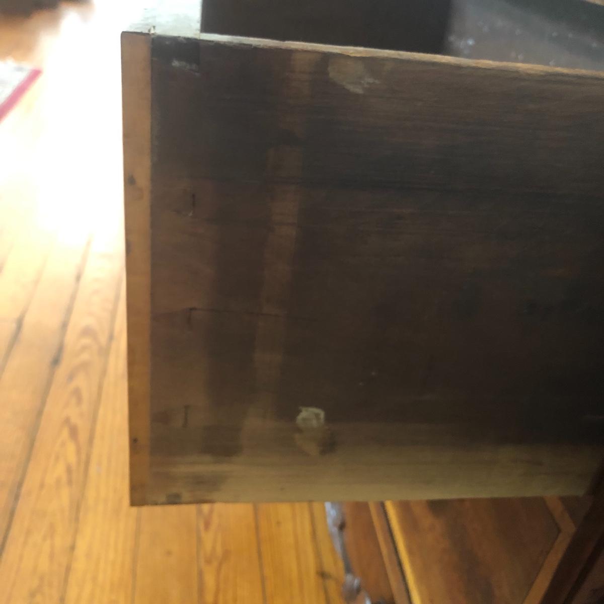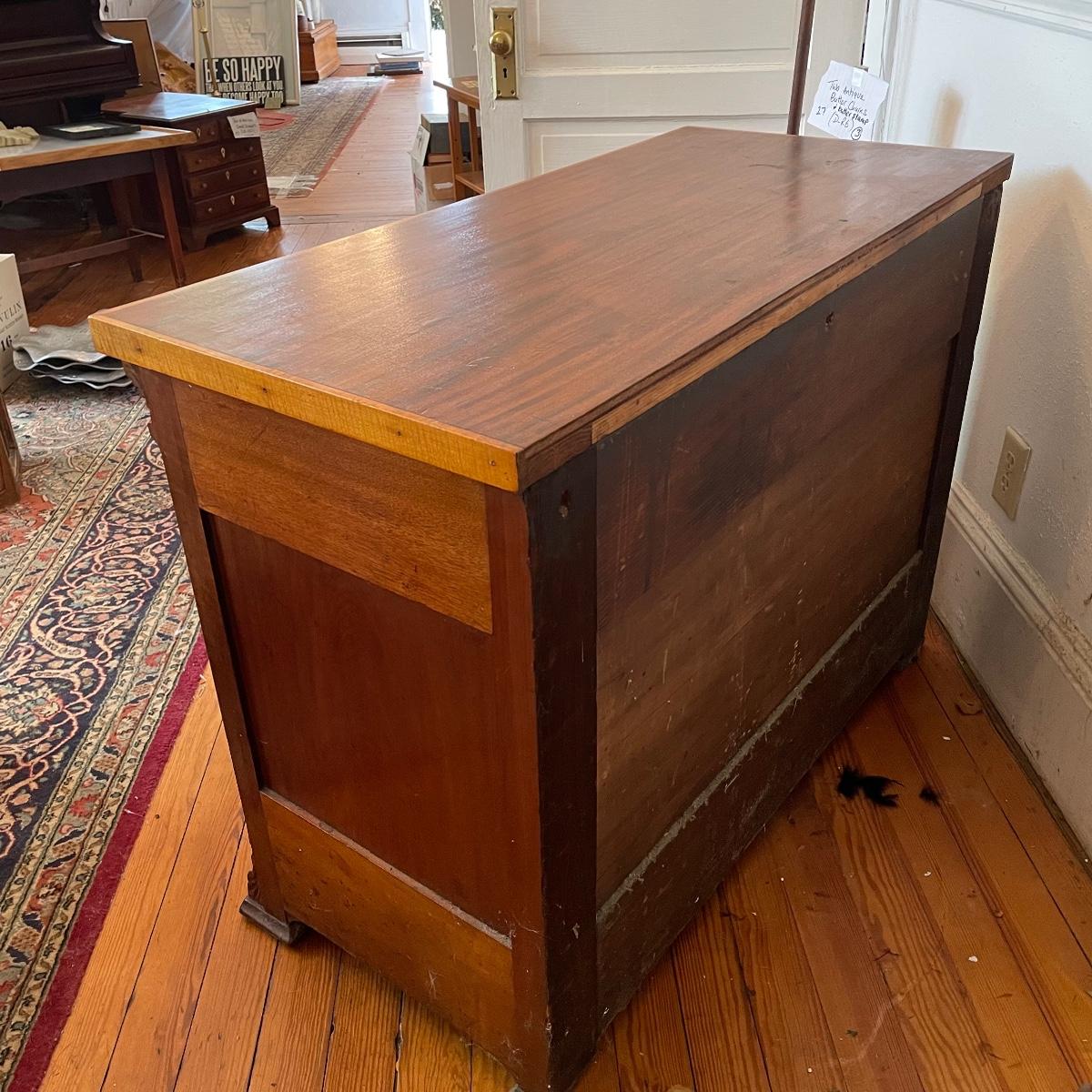 This dresser has three dovetailed drawer with wooden pulls (note one pull needs to put back on) and some intricate carved details. No keys for the 3 locks.