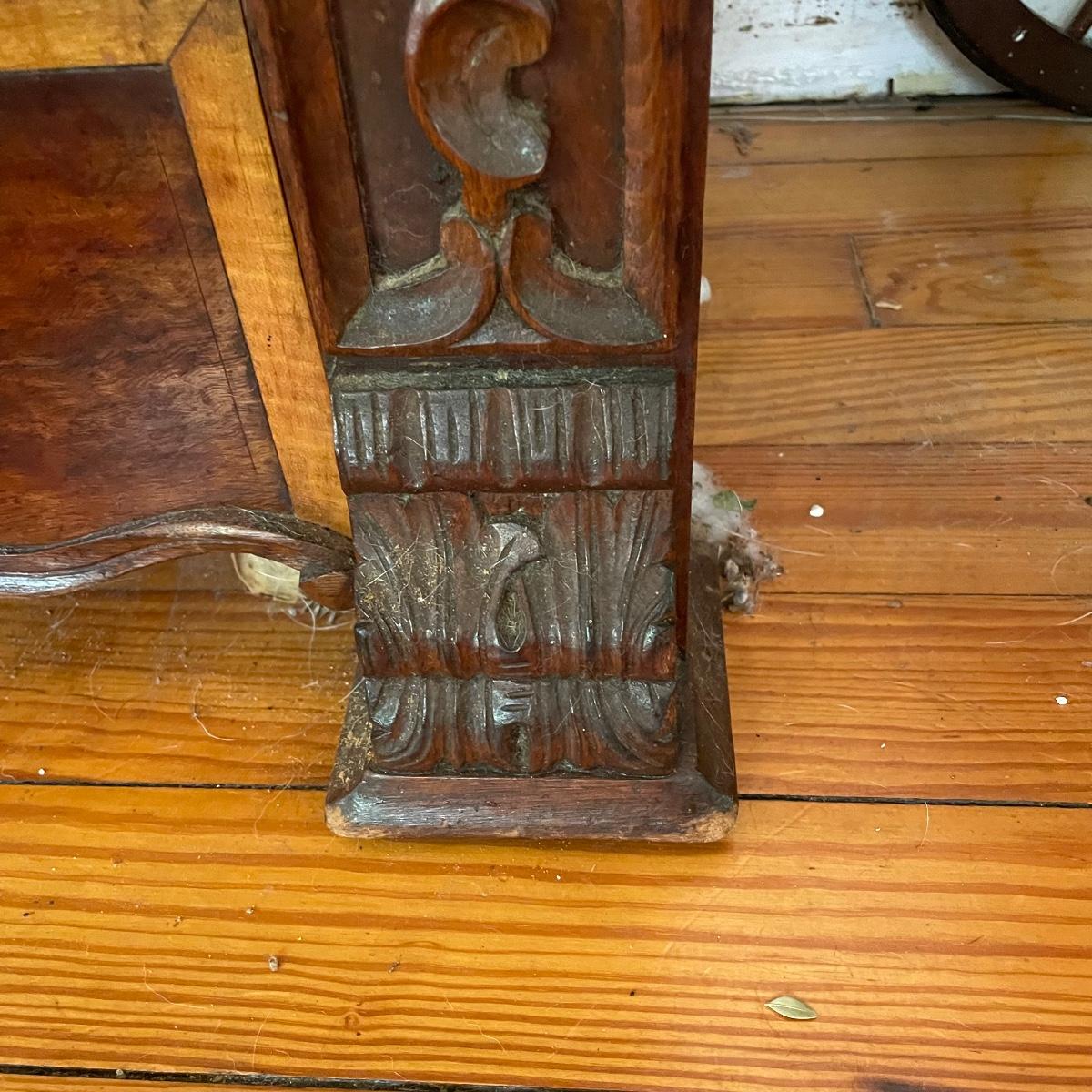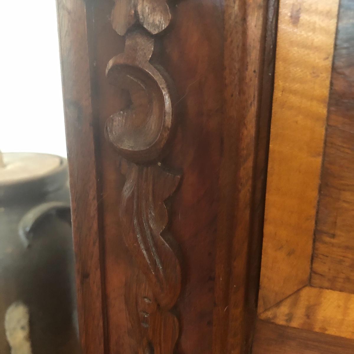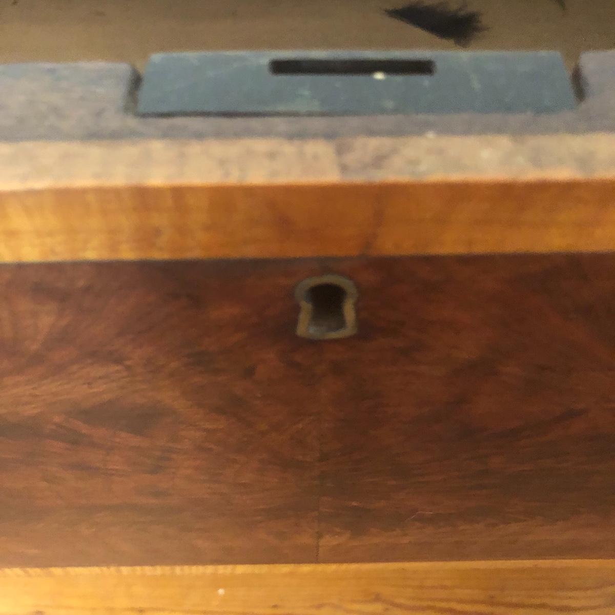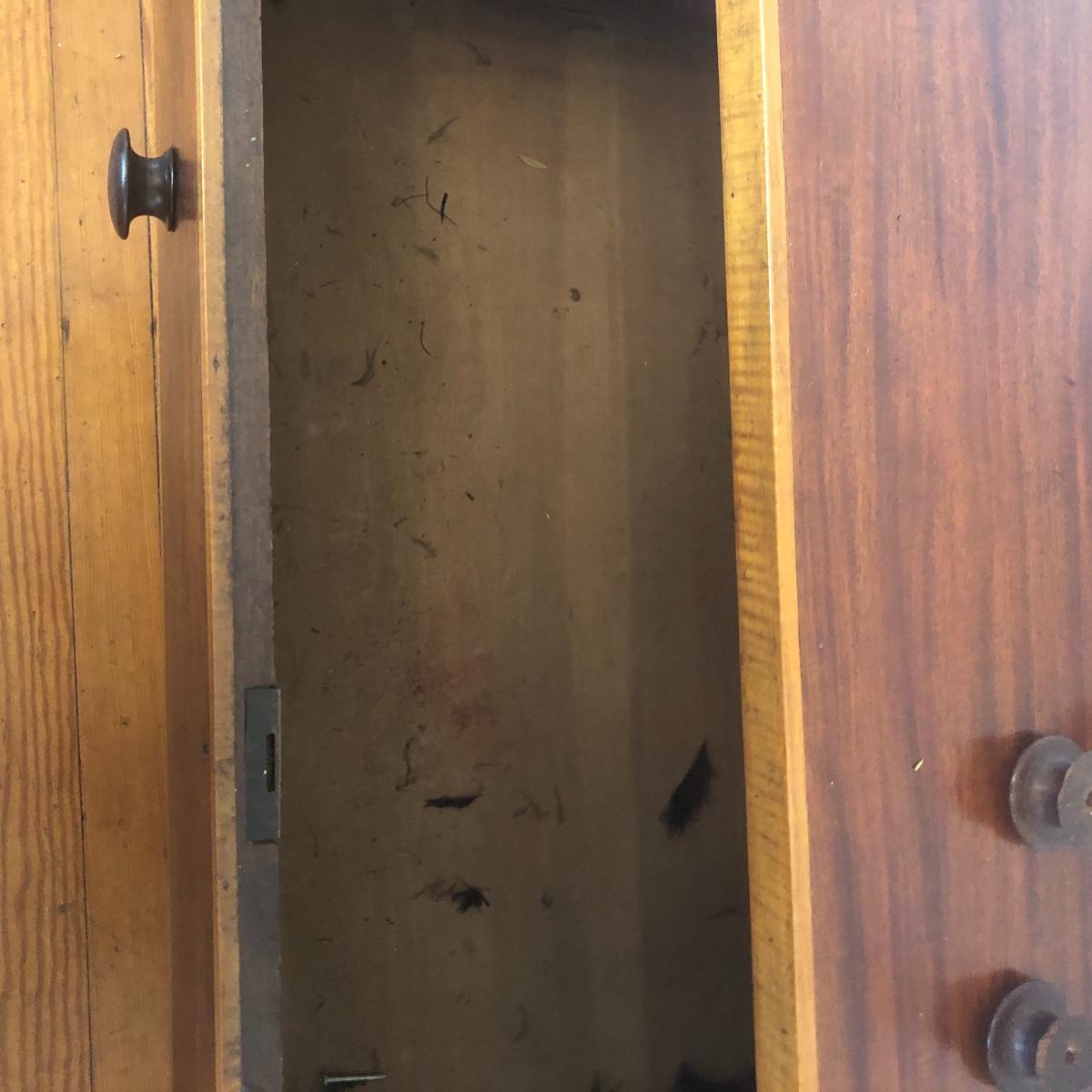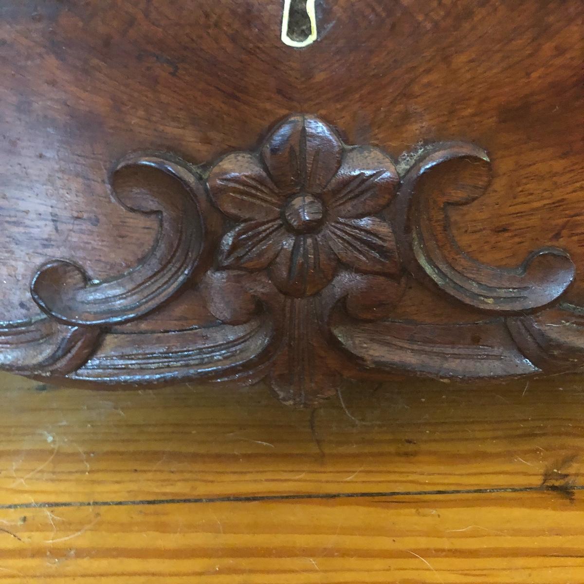 This dresser has three dovetailed drawer with wooden pulls (note one pull needs to put back on) and some intricate carved details. No keys for the 3 locks.