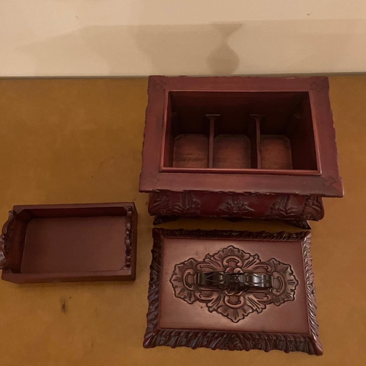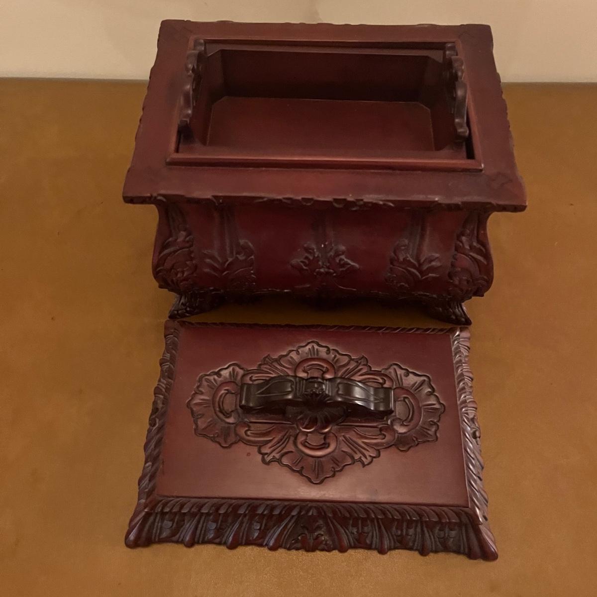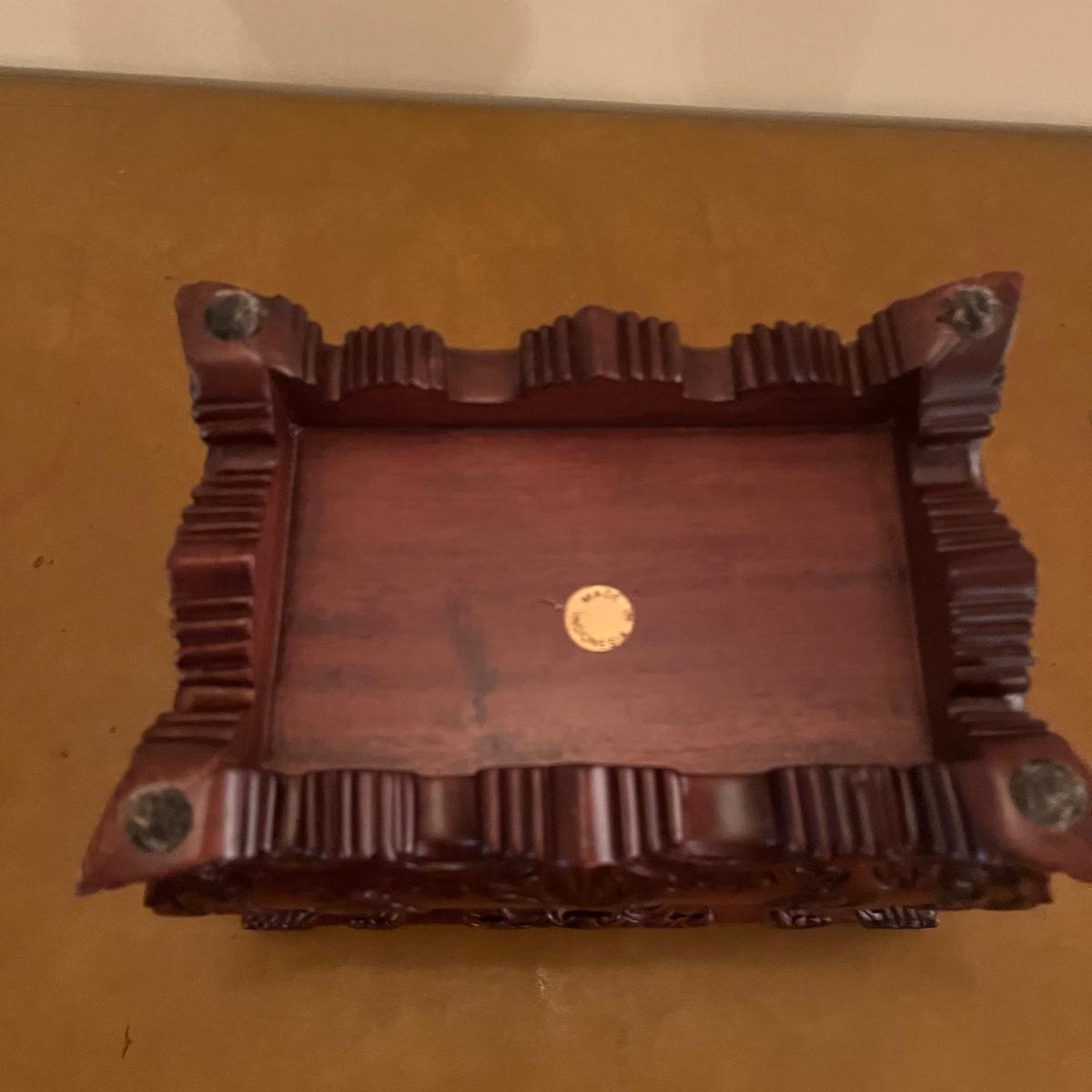 Lot includes a carved wooden box with lid and insert. Box is made in Indonesia. and measures 5.5” x 8” x 6.25”.