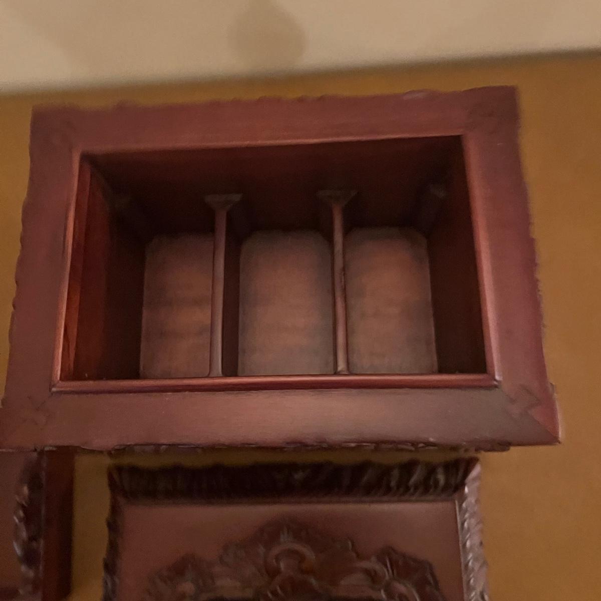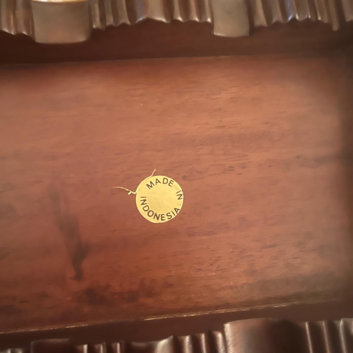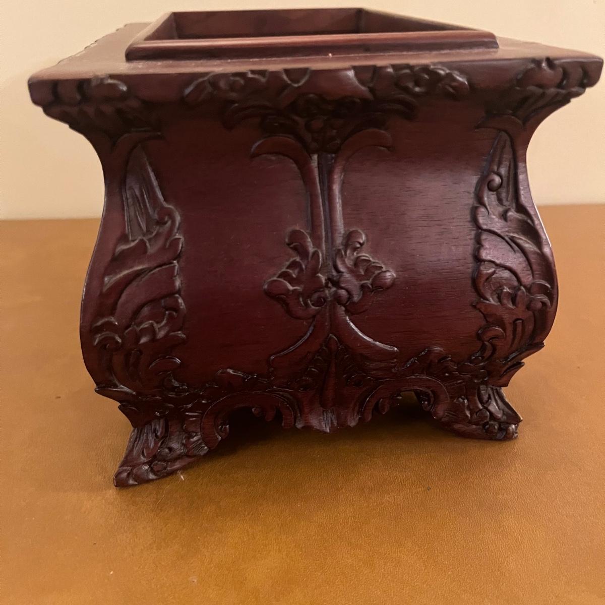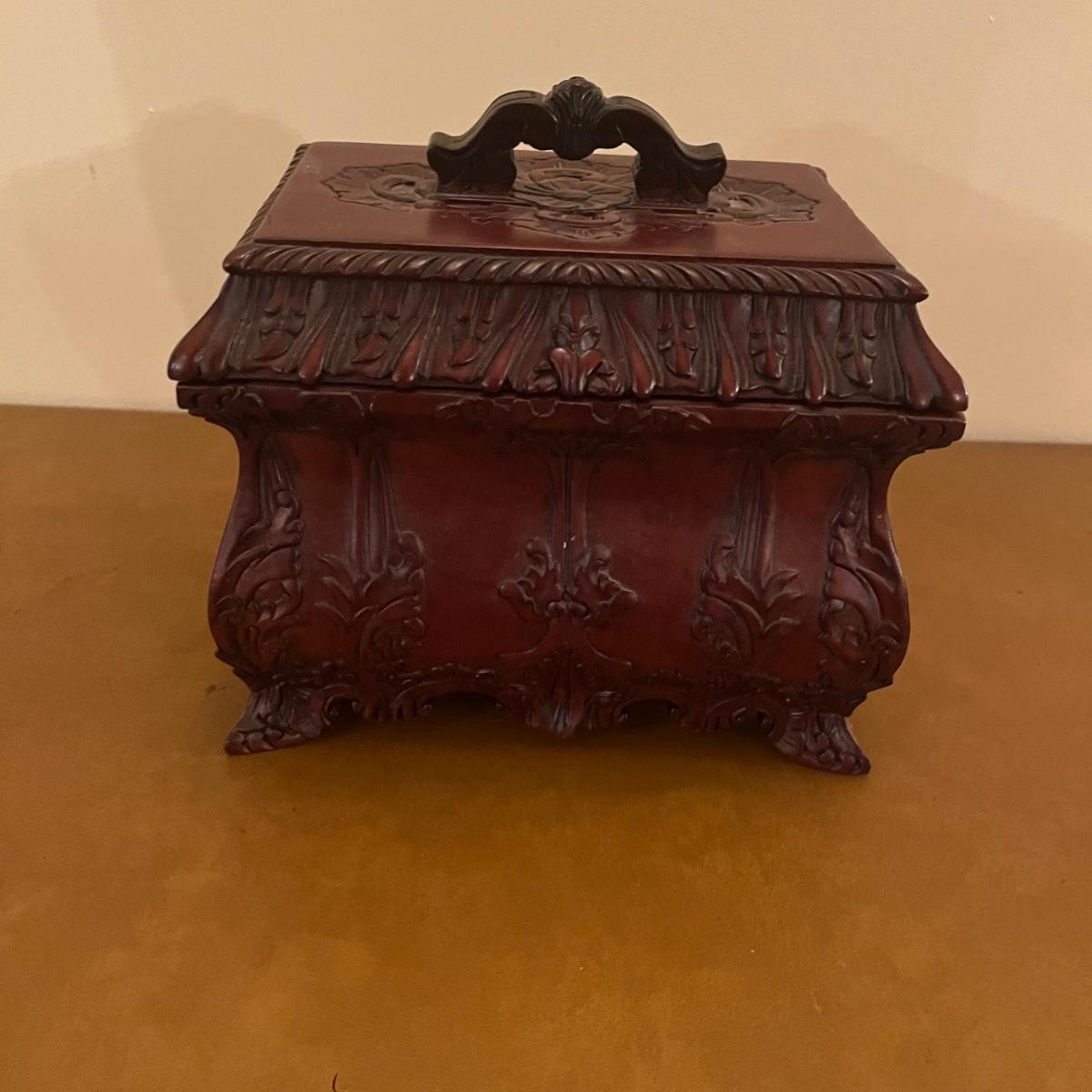 Lot includes a carved wooden box with lid and insert. Box is made in Indonesia. and measures 5.5” x 8” x 6.25”.