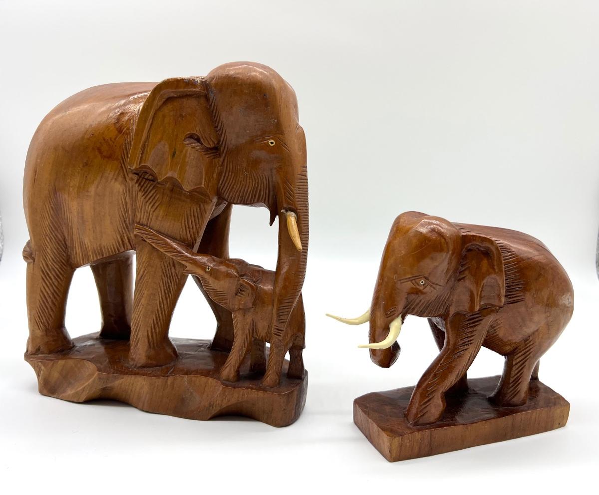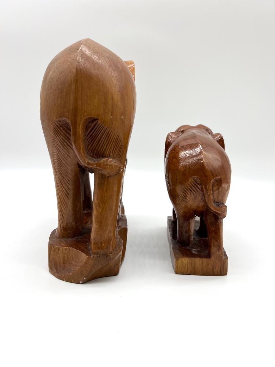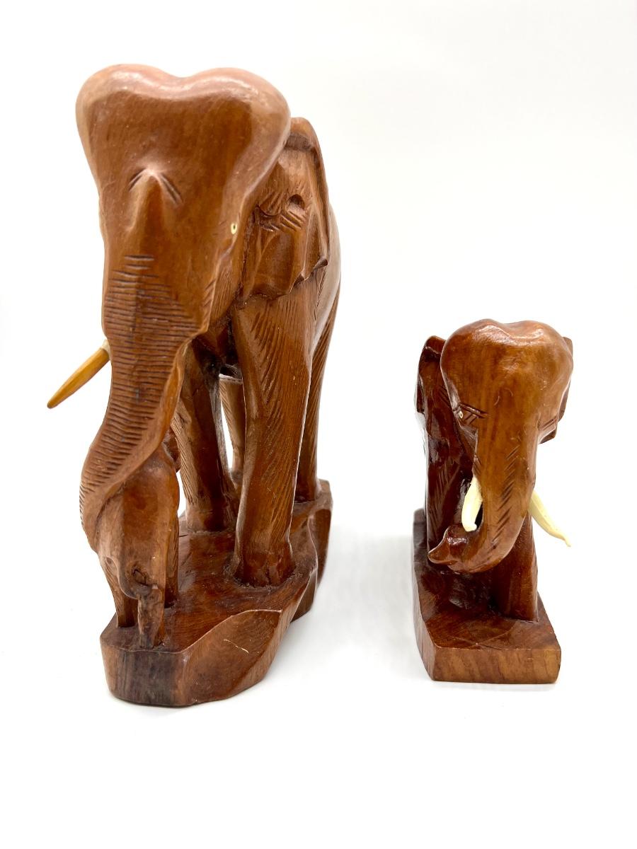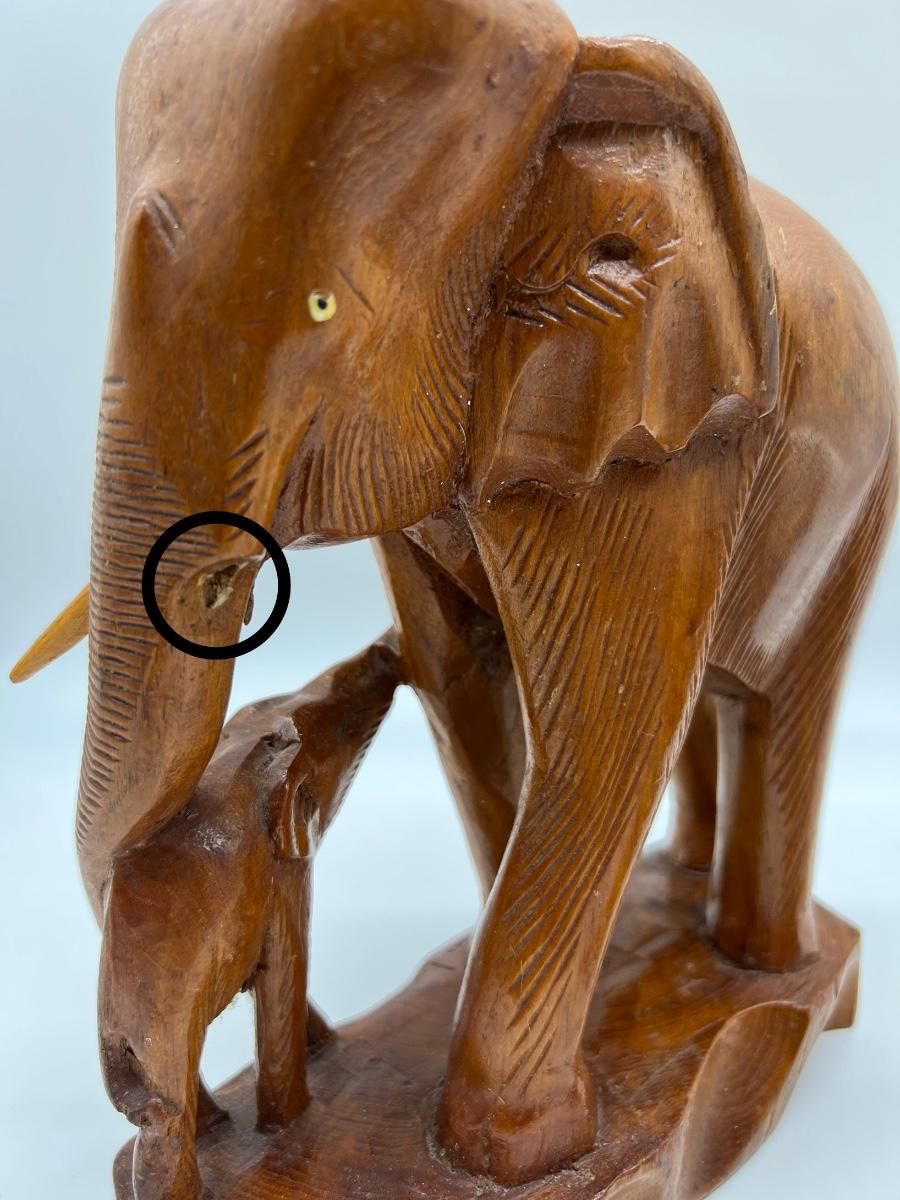 Carved wooden elephant pair. Tallest measures 10 inches tall, 4 inches wide and 9 inches long. Smaller measures 6 inches tall, 2 1/2 wide and 6 inches long. The larger elephant is missing a tusk and the other has been repaired with glue, see picture