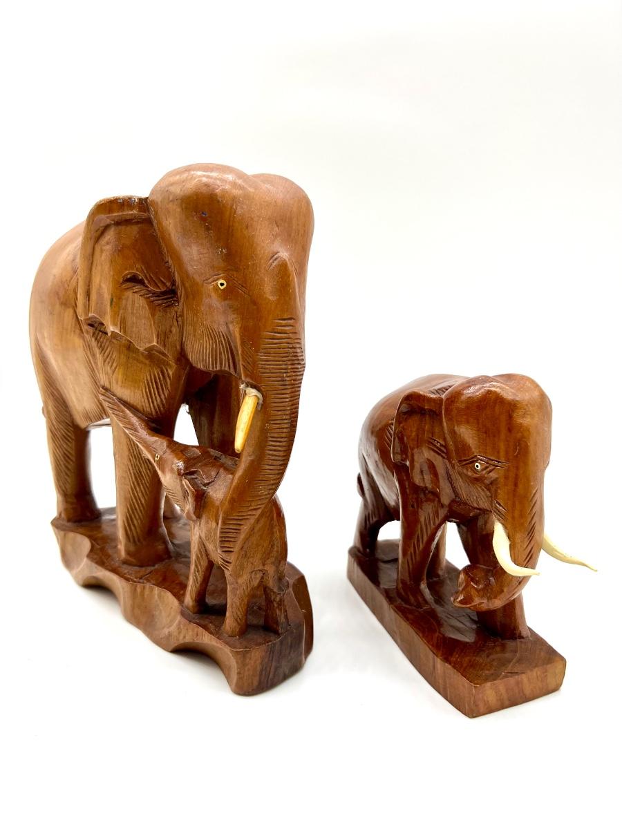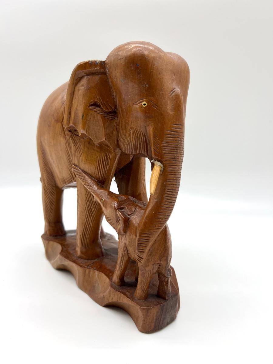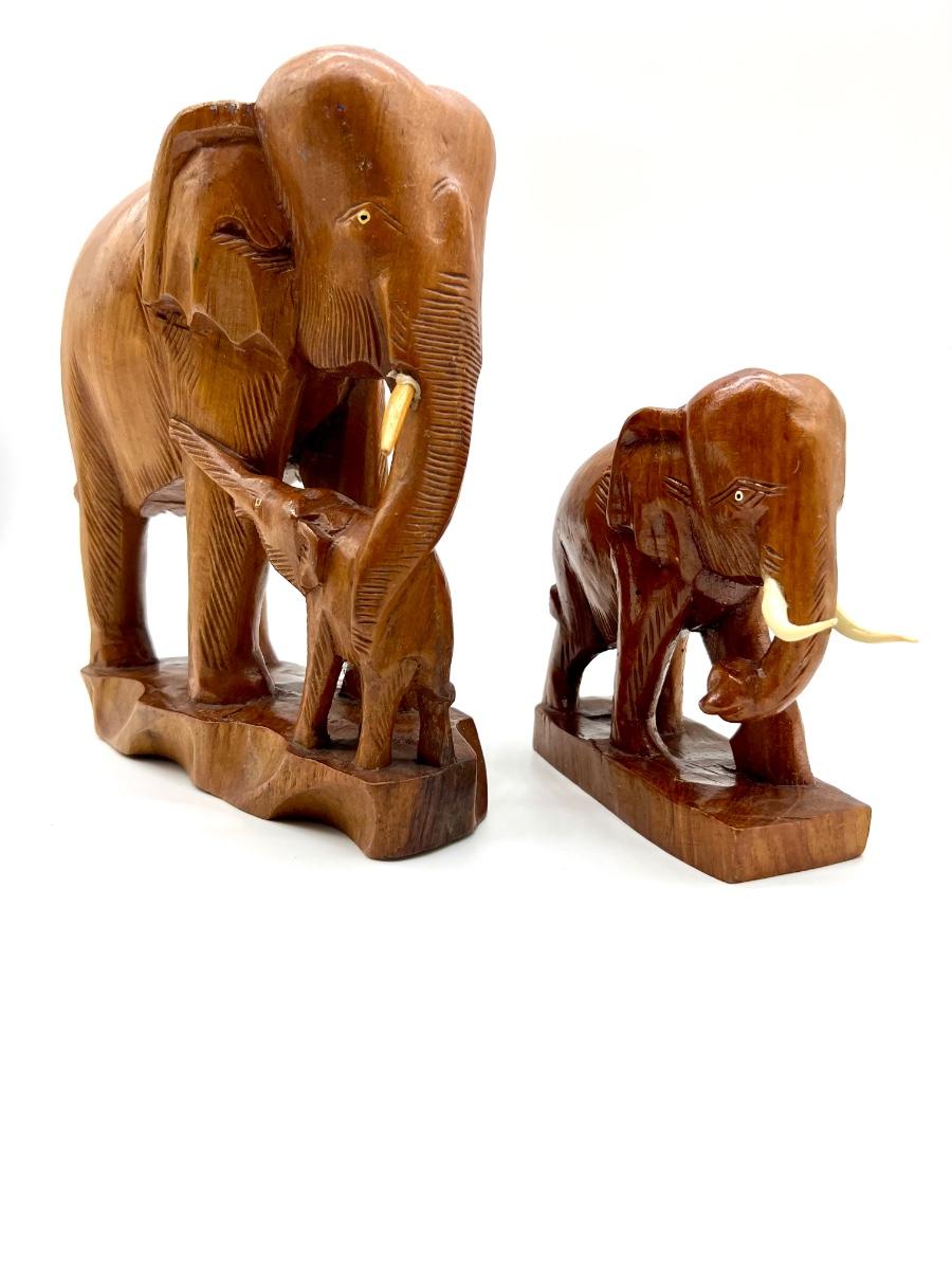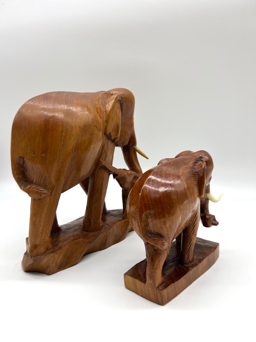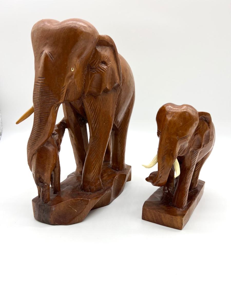Carved wooden elephant pair. Tallest measures 10 inches tall, 4 inches wide and 9 inches long. Smaller measures 6 inches tall, 2 1/2 wide and 6 inches long. The larger elephant is missing a tusk and the other has been repaired with glue, see picture
