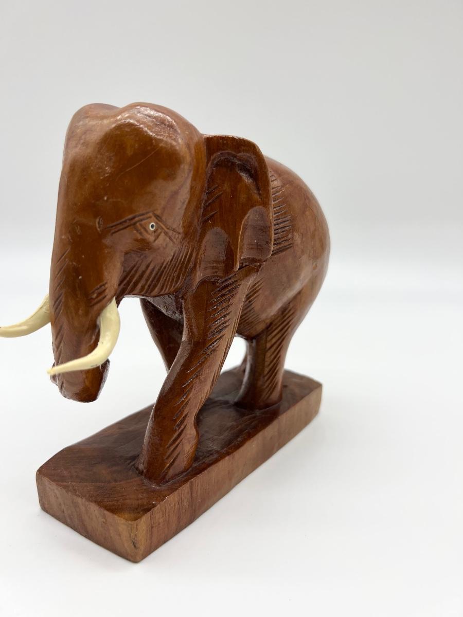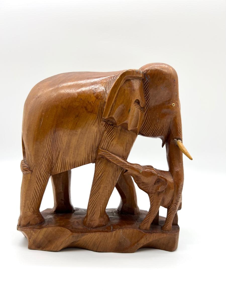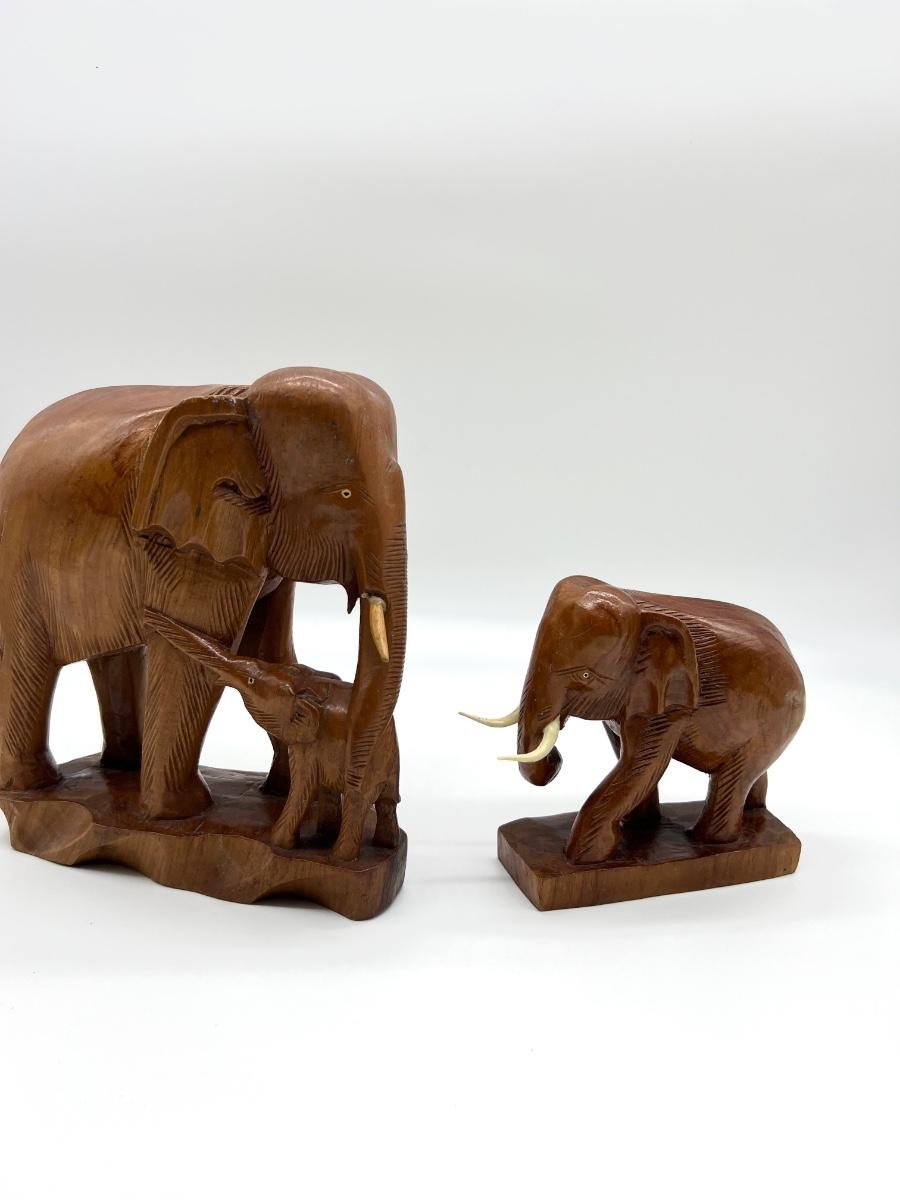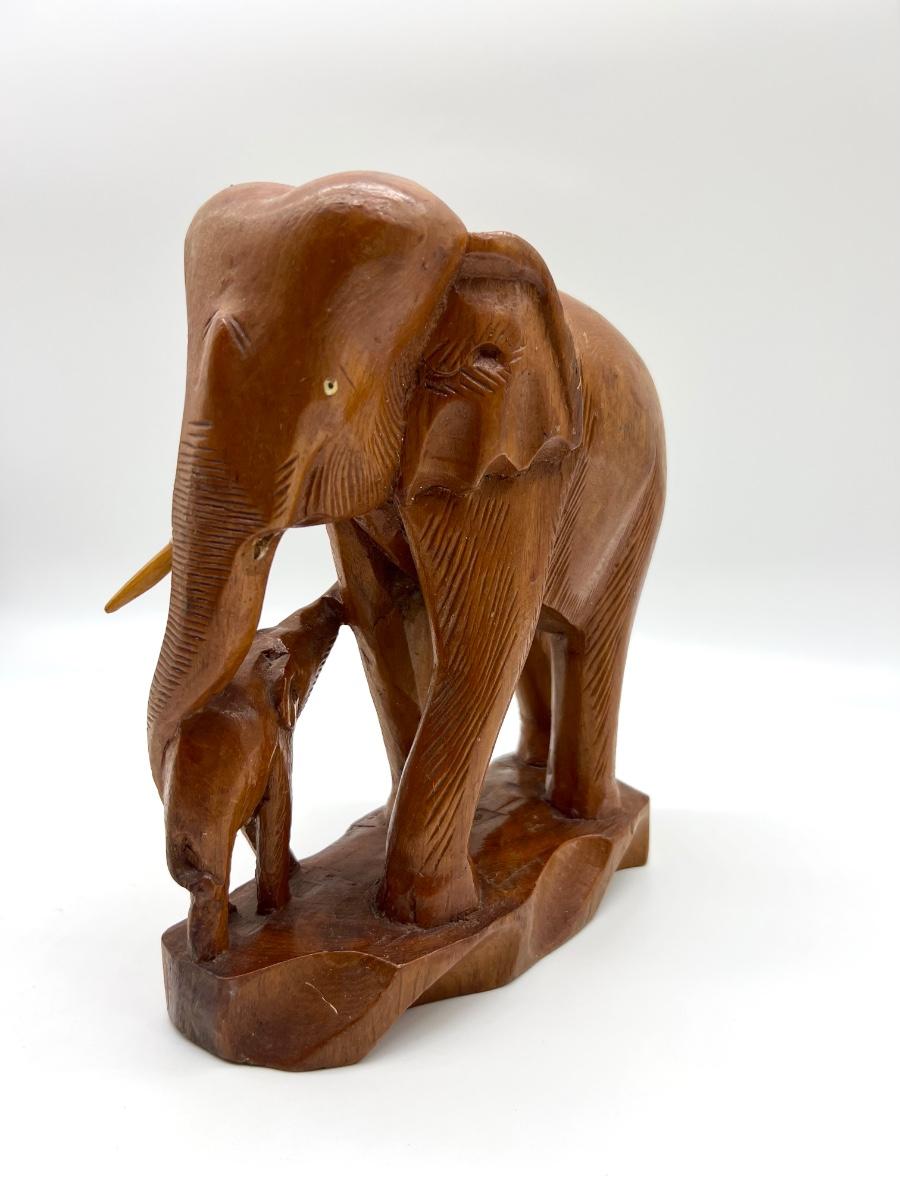 Carved wooden elephant pair. Tallest measures 10 inches tall, 4 inches wide and 9 inches long. Smaller measures 6 inches tall, 2 1/2 wide and 6 inches long. The larger elephant is missing a tusk and the other has been repaired with glue, see picture