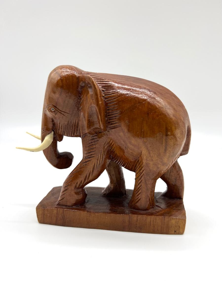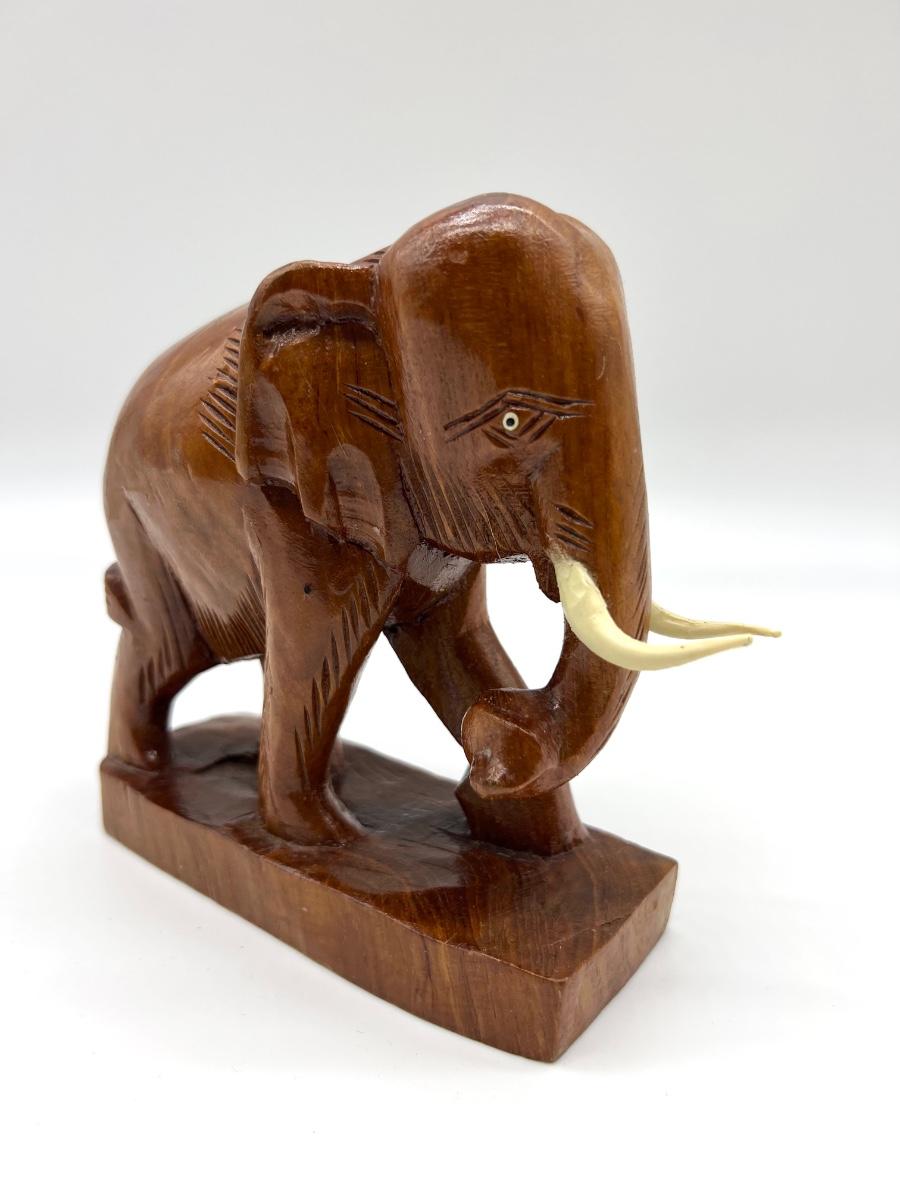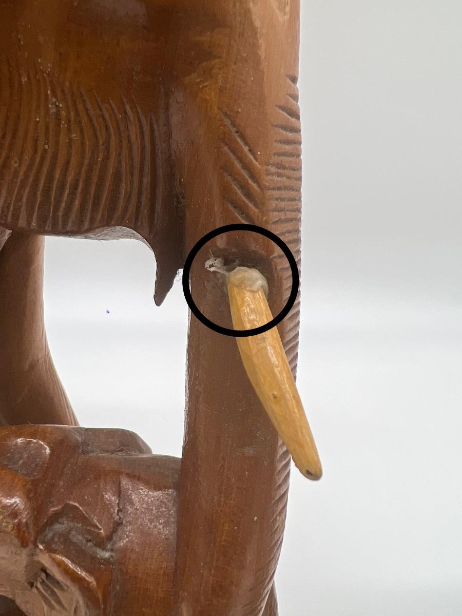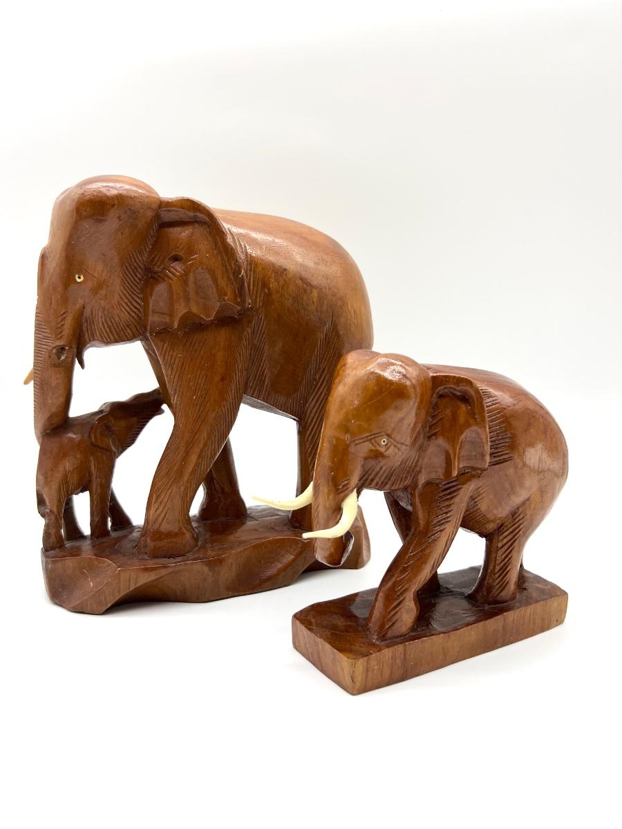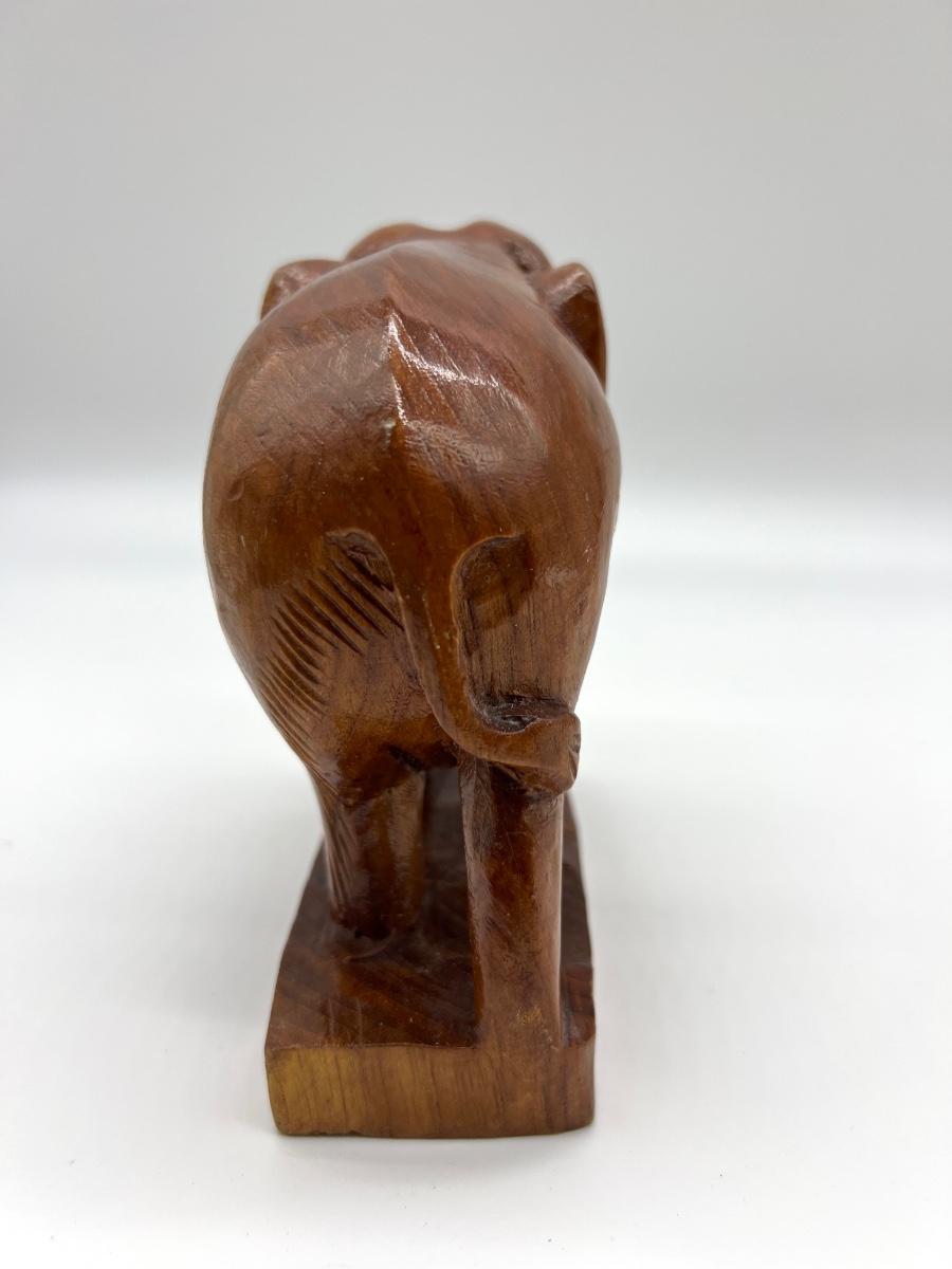 Carved wooden elephant pair. Tallest measures 10 inches tall, 4 inches wide and 9 inches long. Smaller measures 6 inches tall, 2 1/2 wide and 6 inches long. The larger elephant is missing a tusk and the other has been repaired with glue, see picture