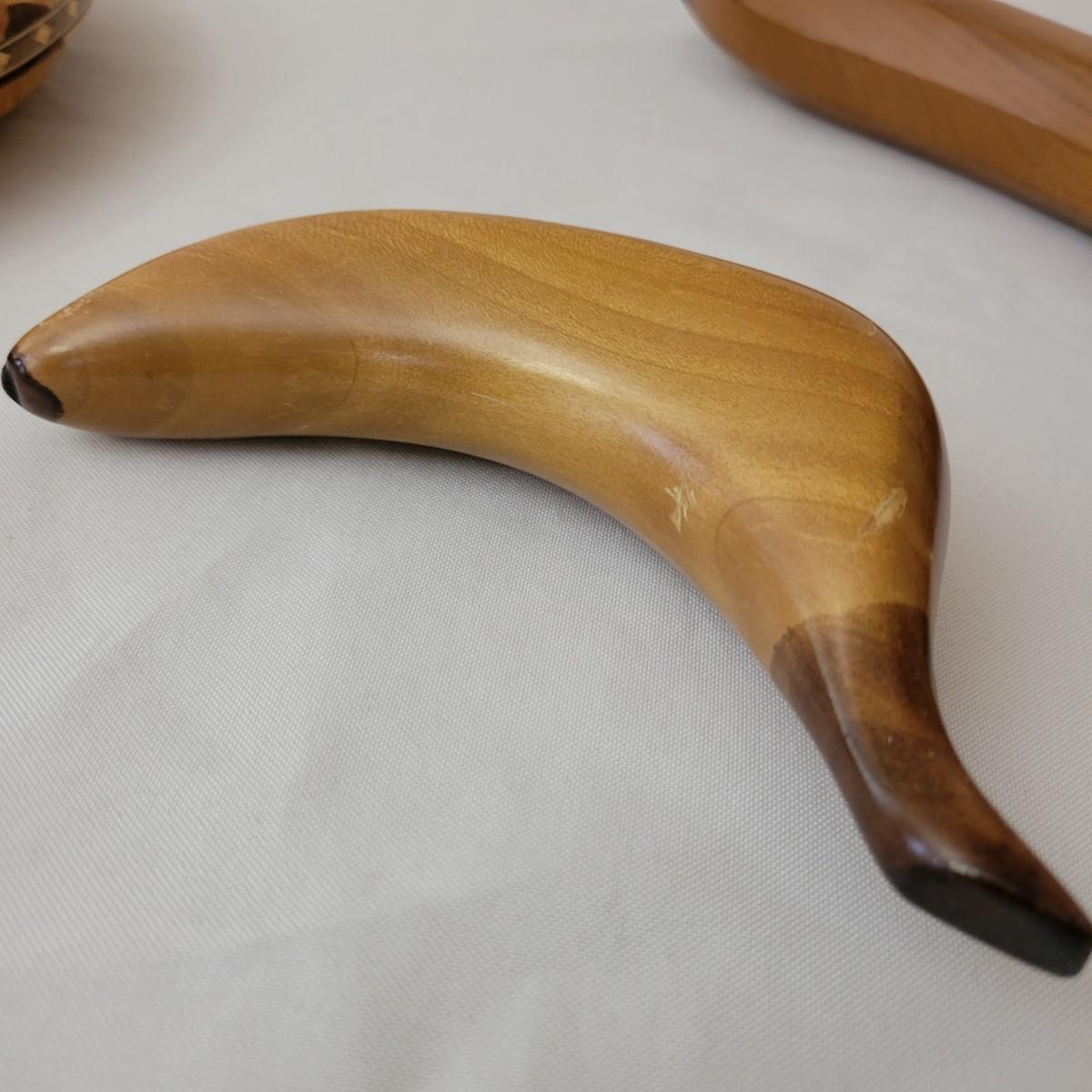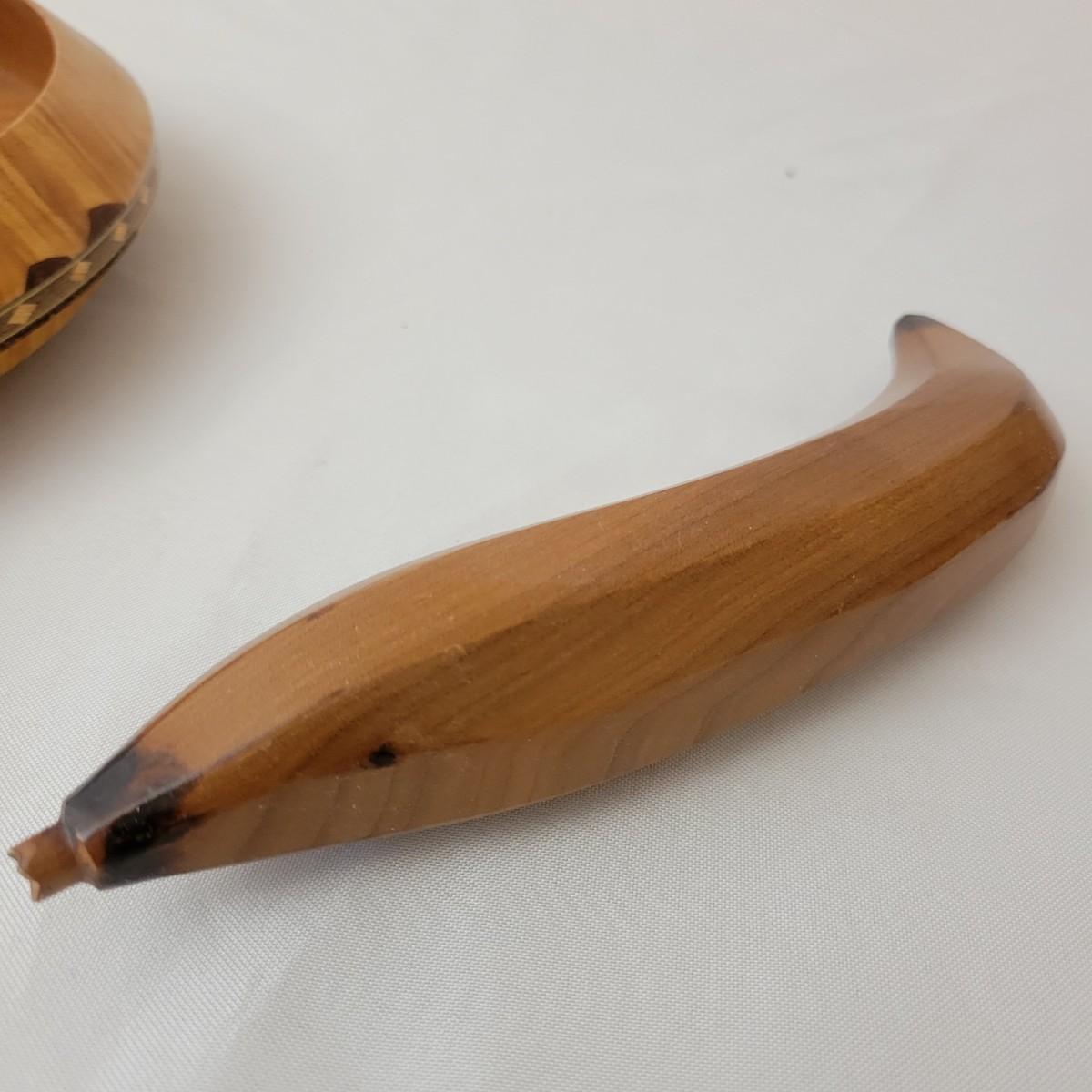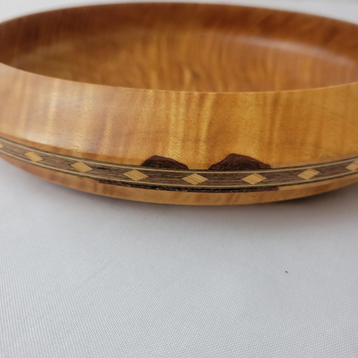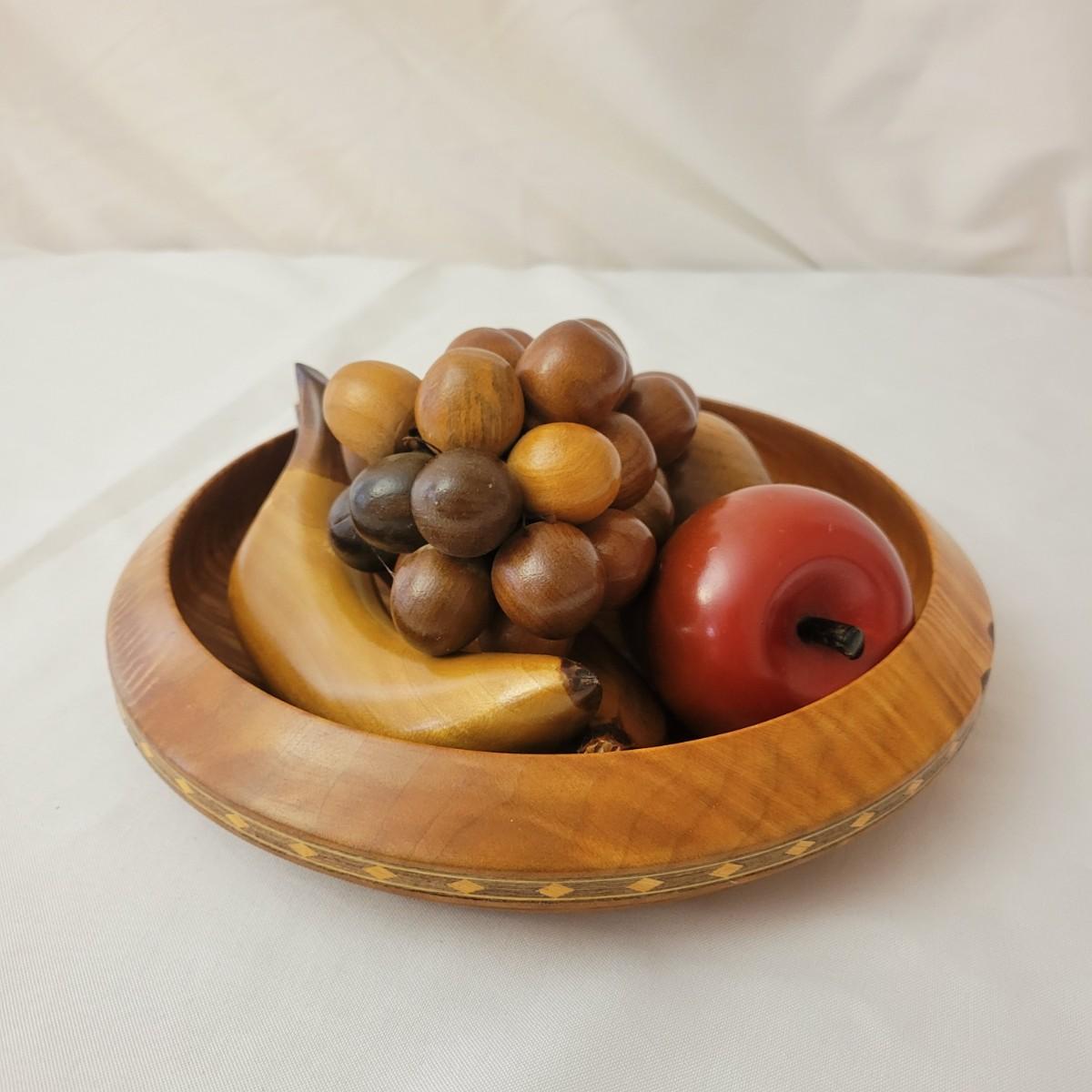 A carved wooden bowl with an inlay that is initialed on the bottom. There are six carved pieces of fruit included. The bowl itself measures approximately 10"D x 2"H. Some of the fruit has some minor scratches. Shipping available