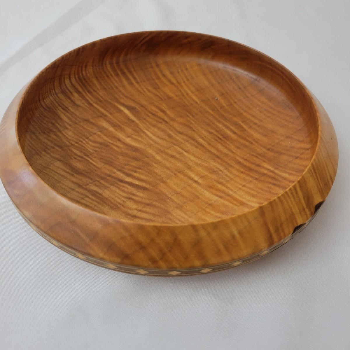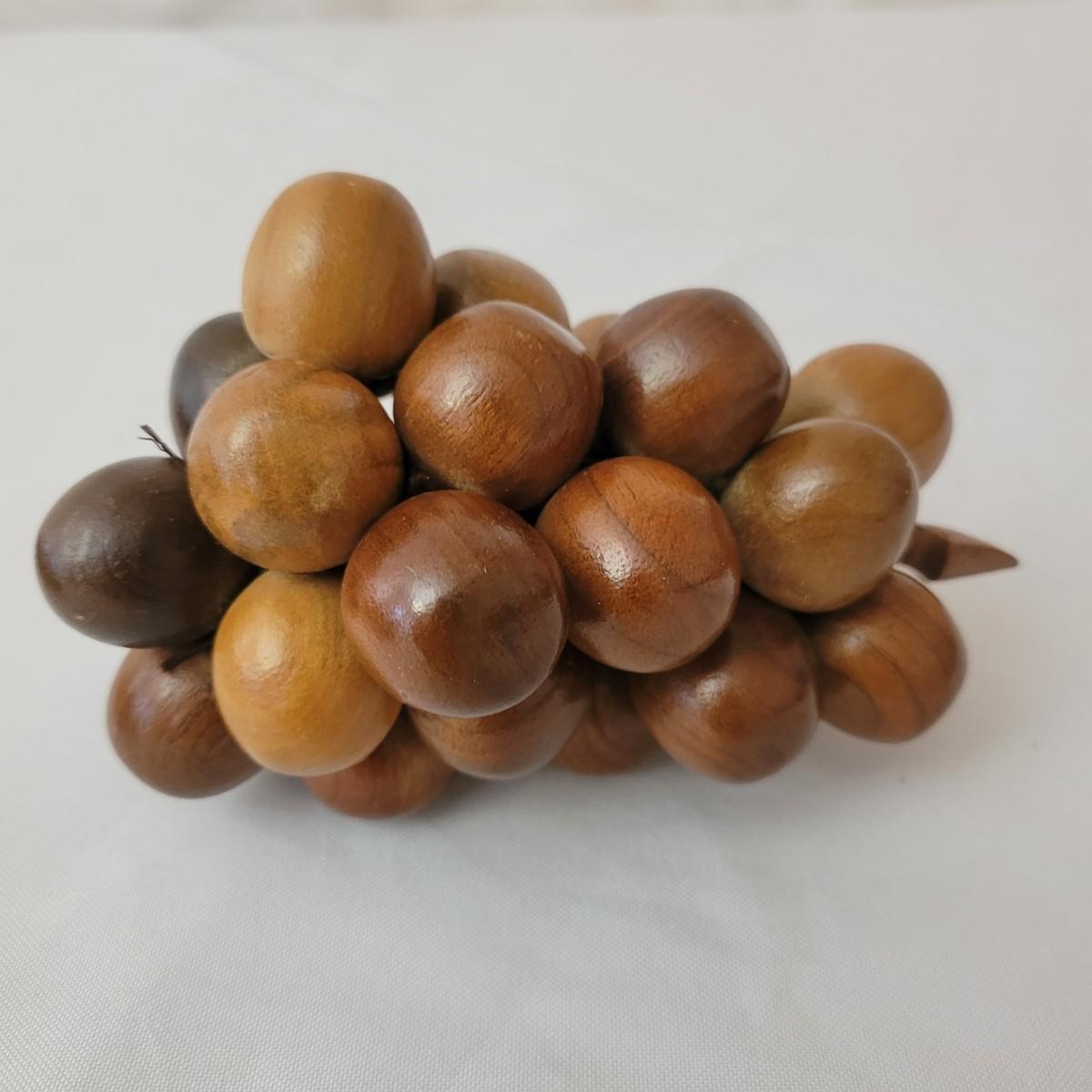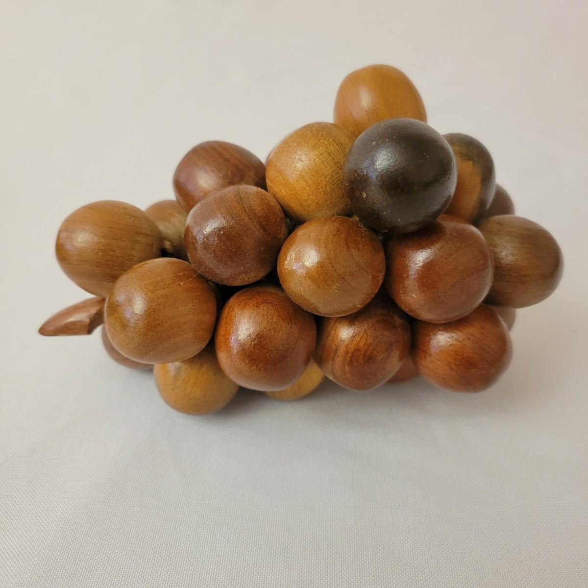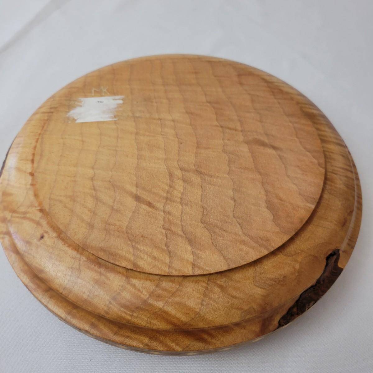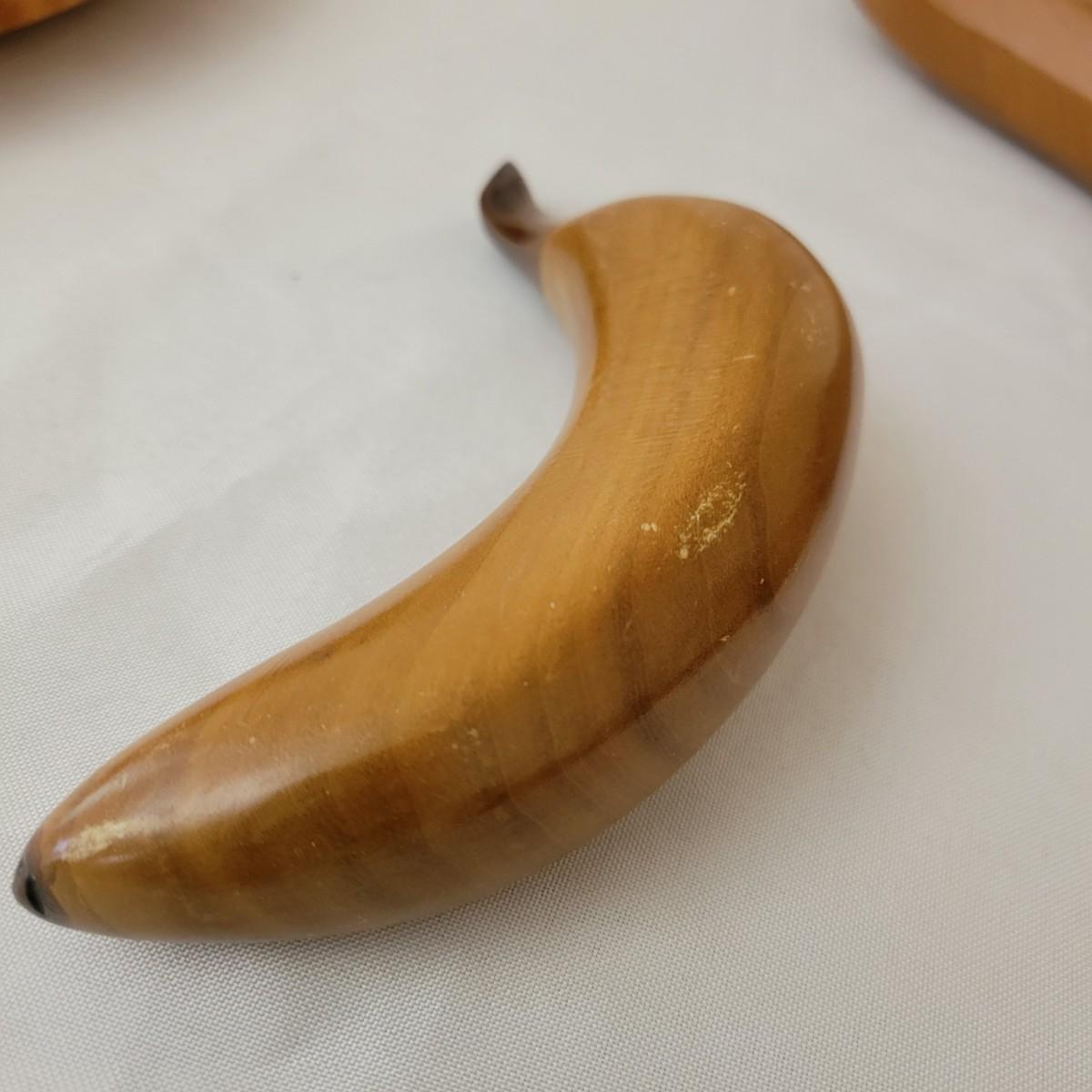 A carved wooden bowl with an inlay that is initialed on the bottom. There are six carved pieces of fruit included. The bowl itself measures approximately 10"D x 2"H. Some of the fruit has some minor scratches. Shipping available