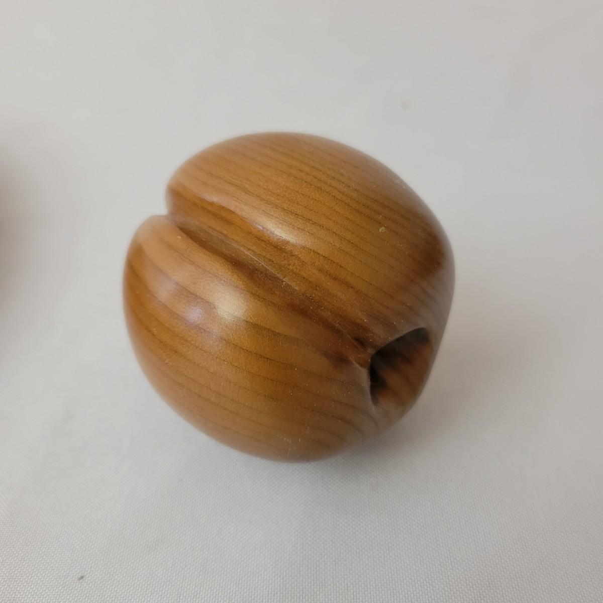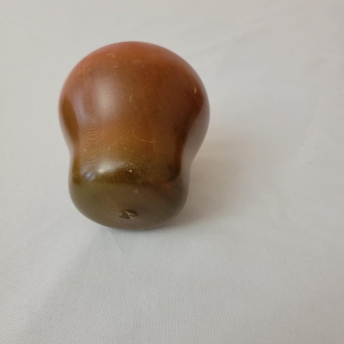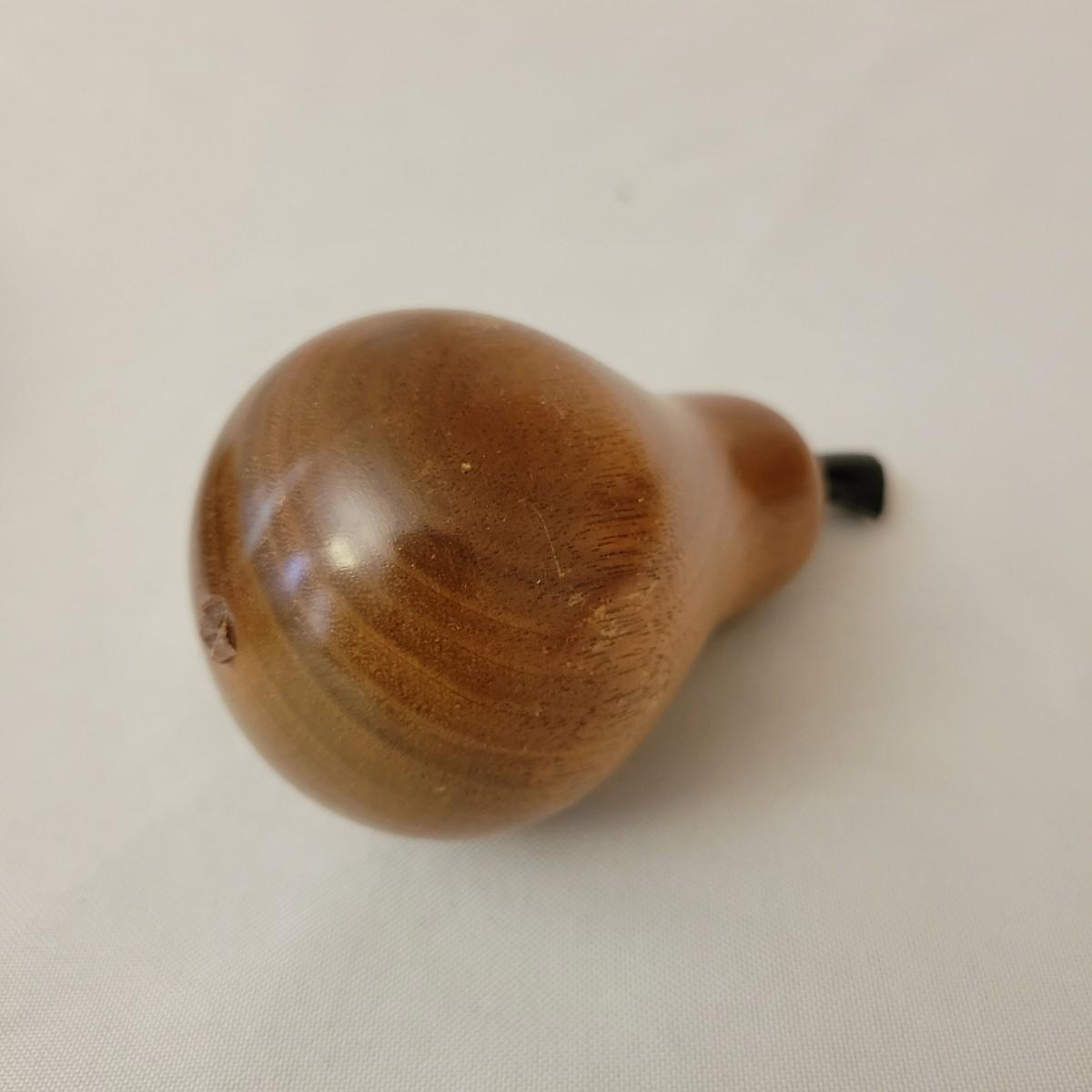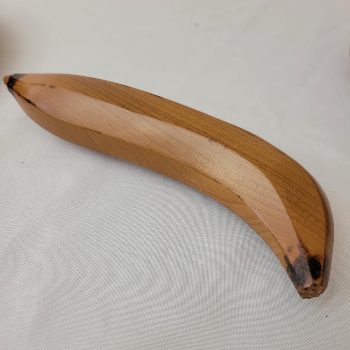 A carved wooden bowl with an inlay that is initialed on the bottom. There are six carved pieces of fruit included. The bowl itself measures approximately 10"D x 2"H. Some of the fruit has some minor scratches. Shipping available