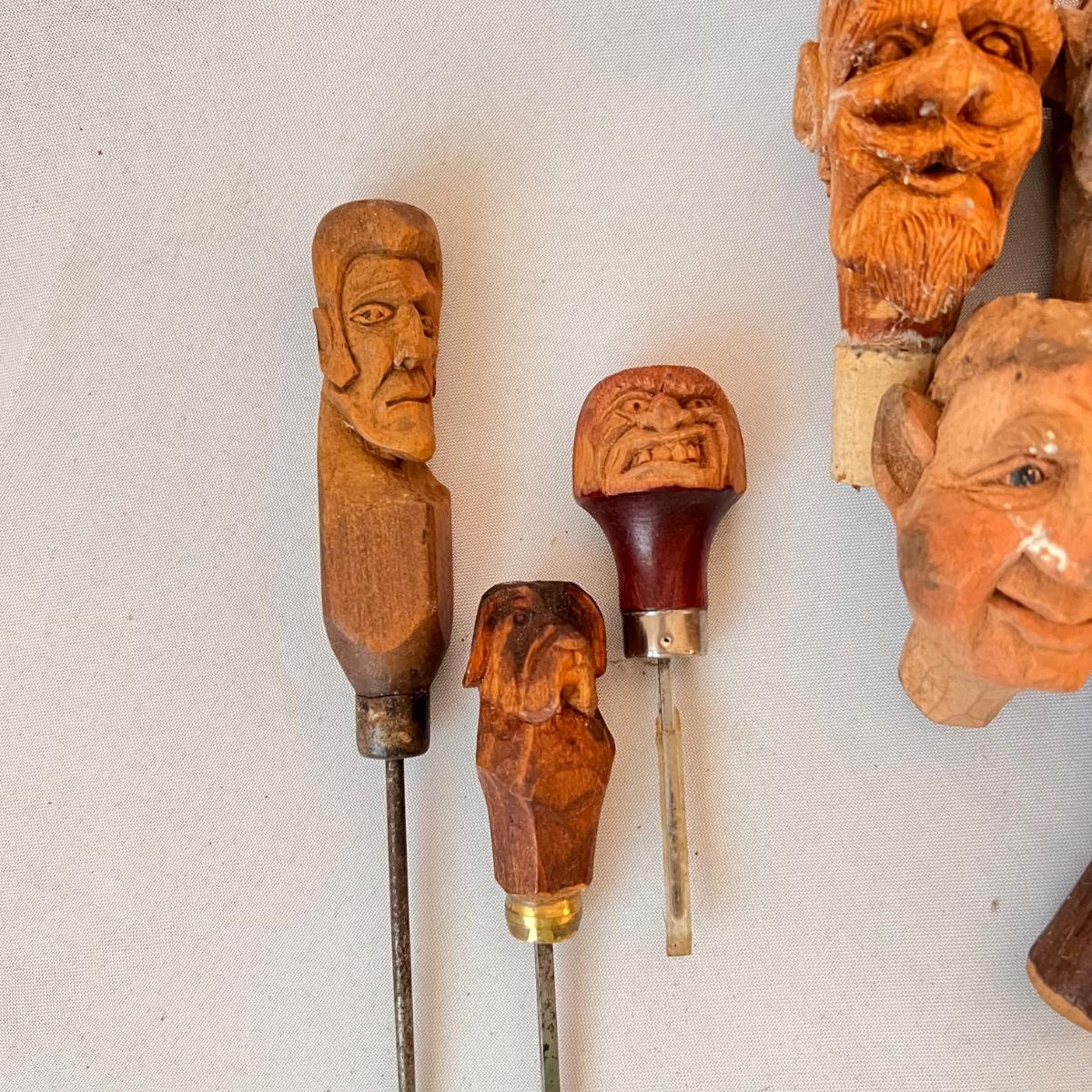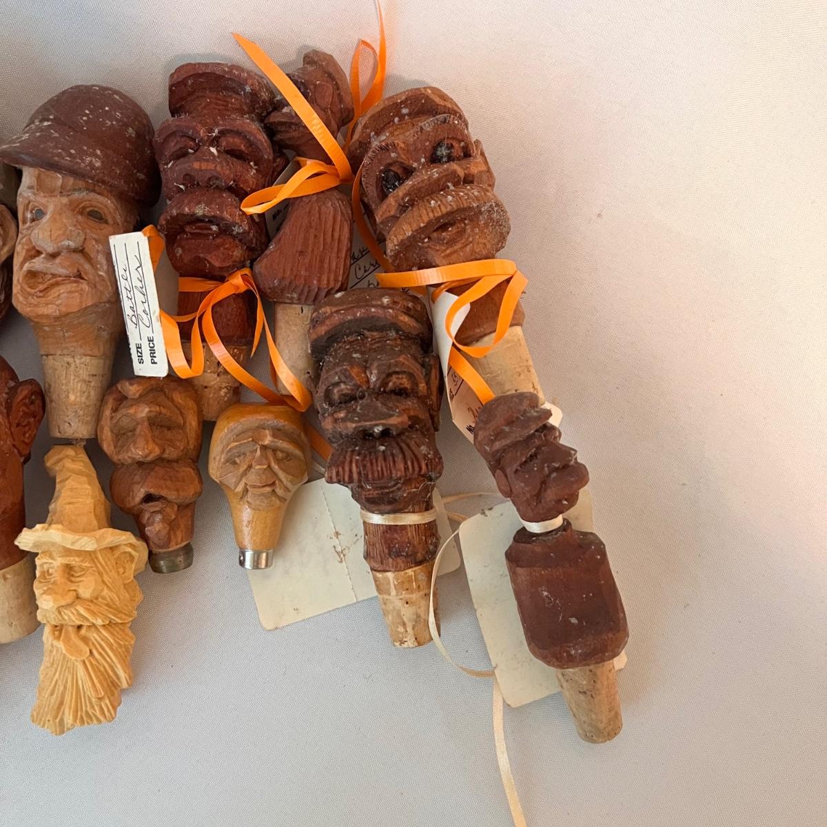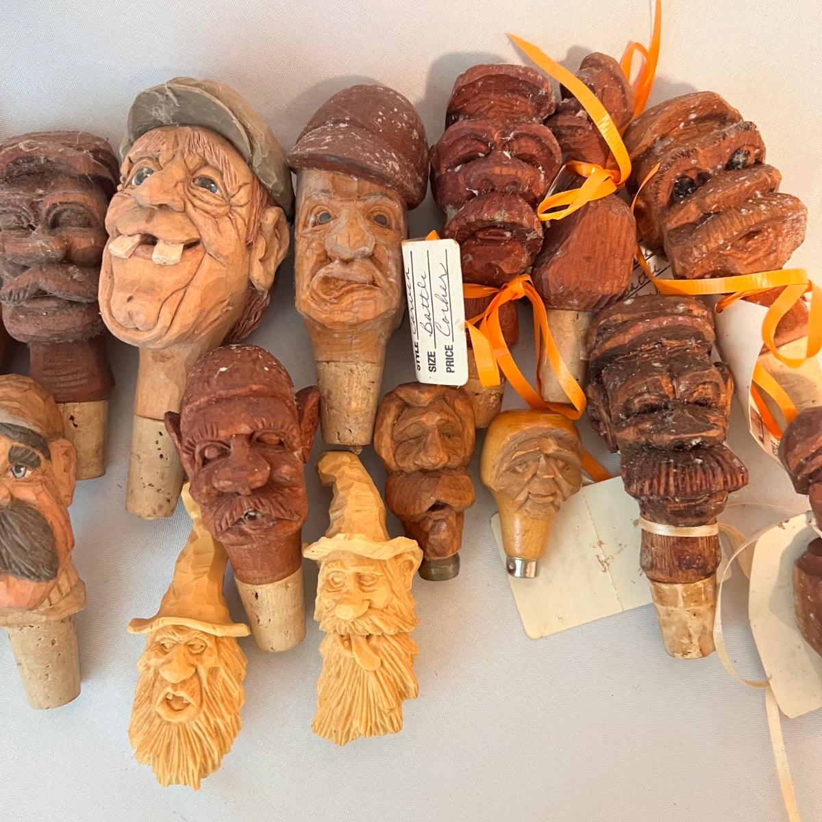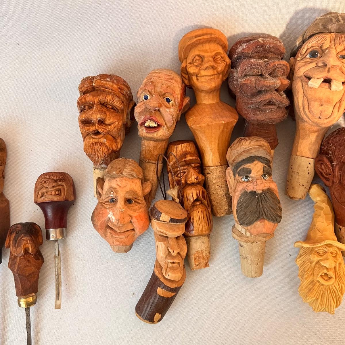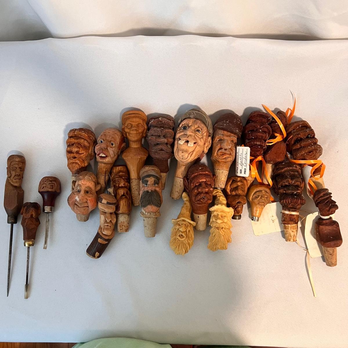 This lot includes twenty- three wooden hand carved different faces. Fourteen of these are bottle corks, Three are ice picks, Two are just faces, and the last three are just standing ones.