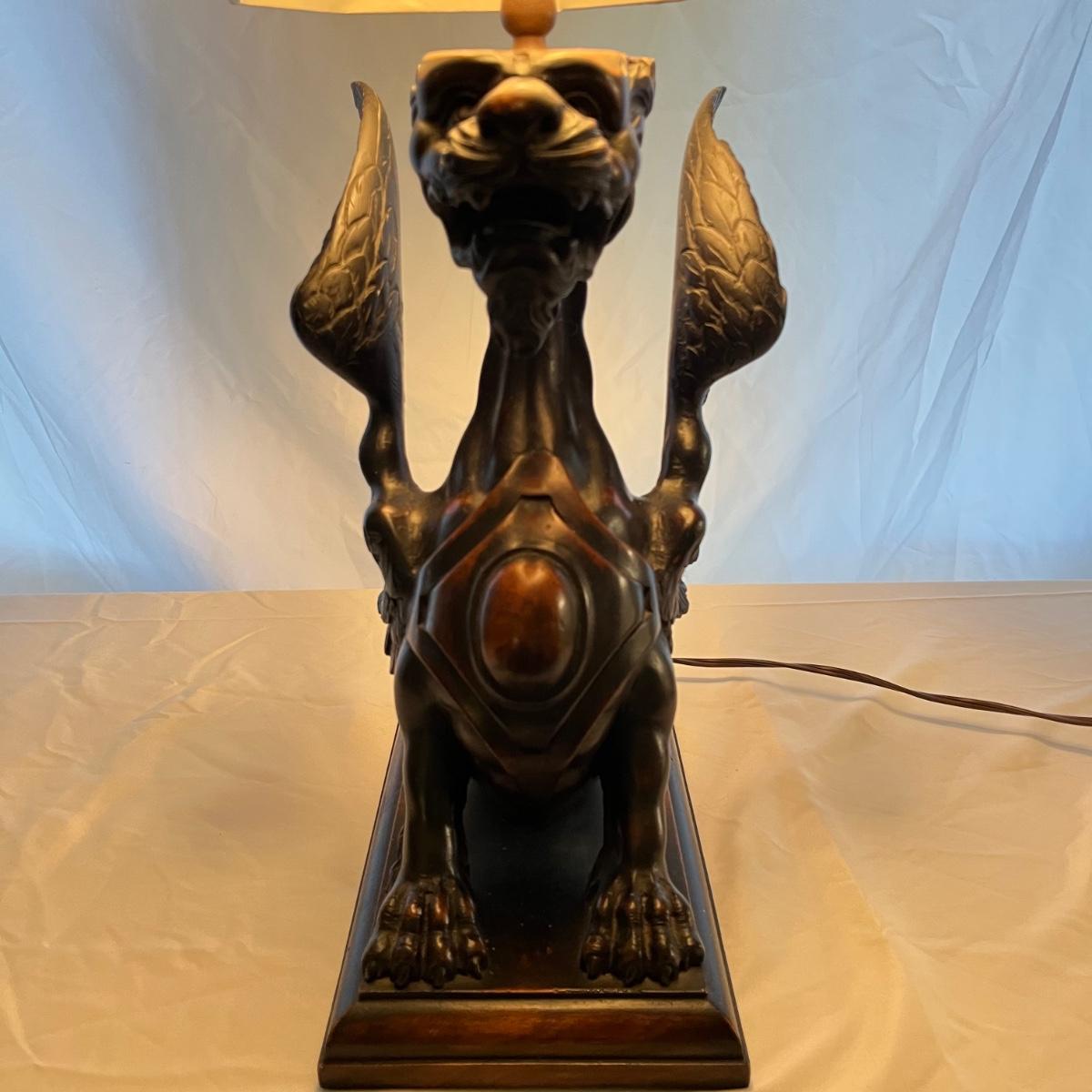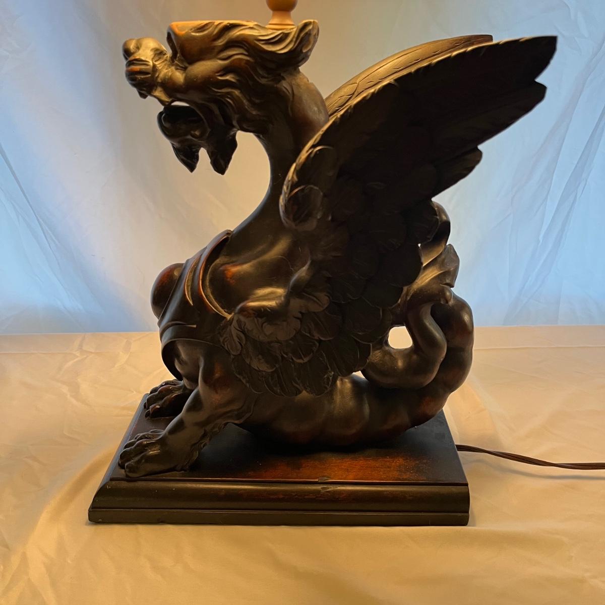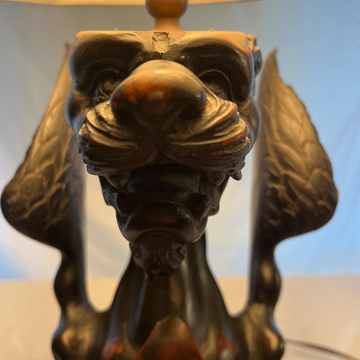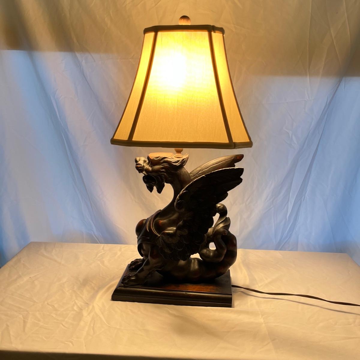 Lot includes a carved (possibly rosewood) wooden Griffin with a three way light. Lamp measures 7” x 11” x 24” without shade.