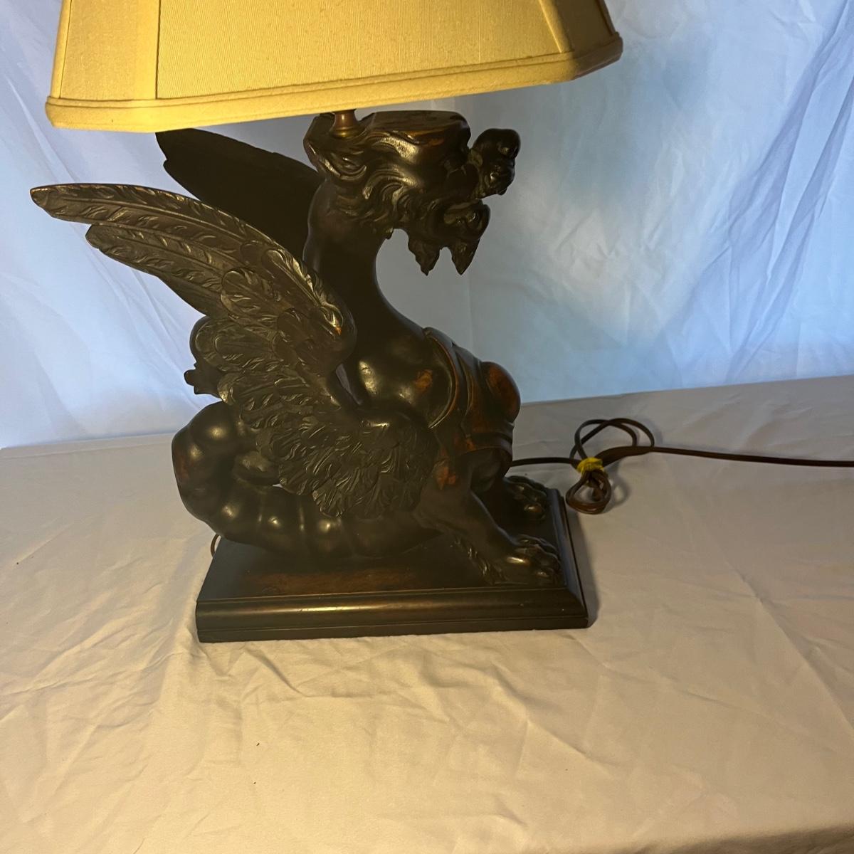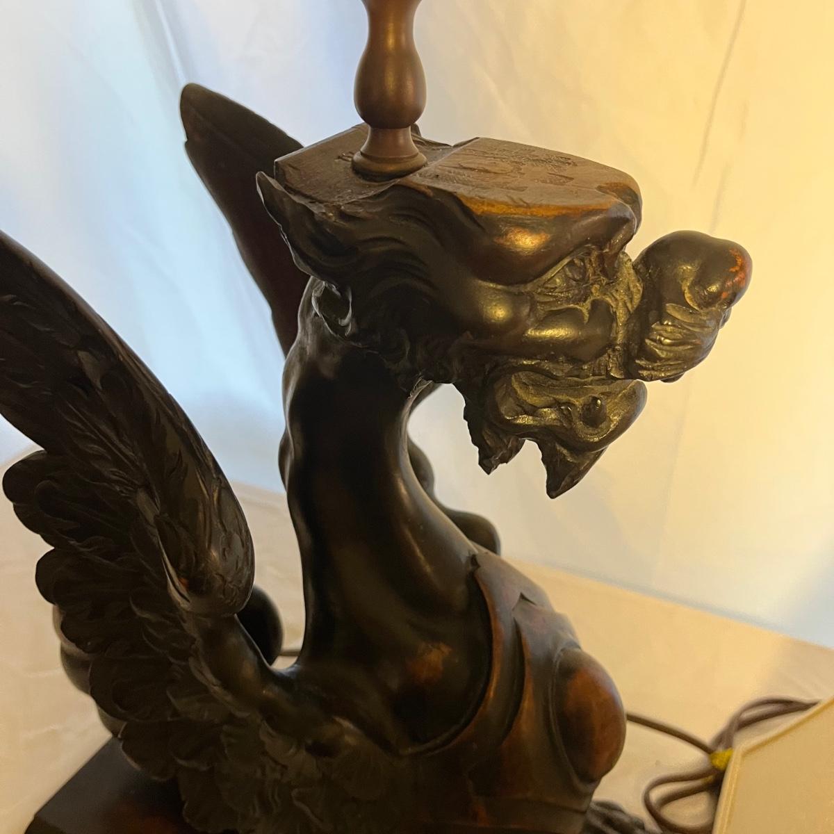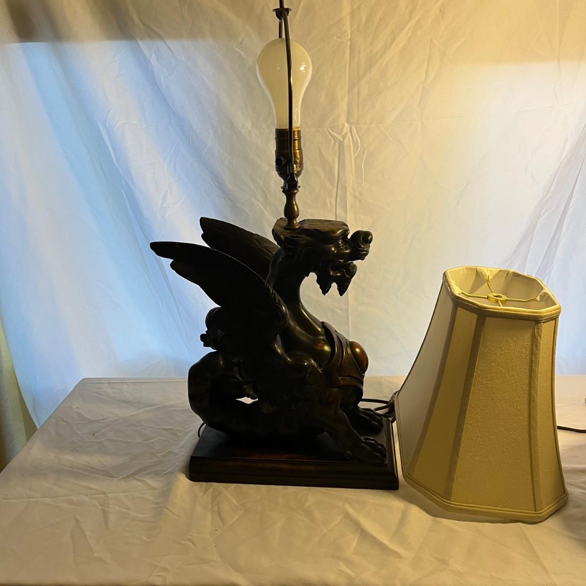 Lot includes a carved (possibly rosewood) wooden Griffin with a three way light. Lamp measures 7” x 11” x 24” without shade.