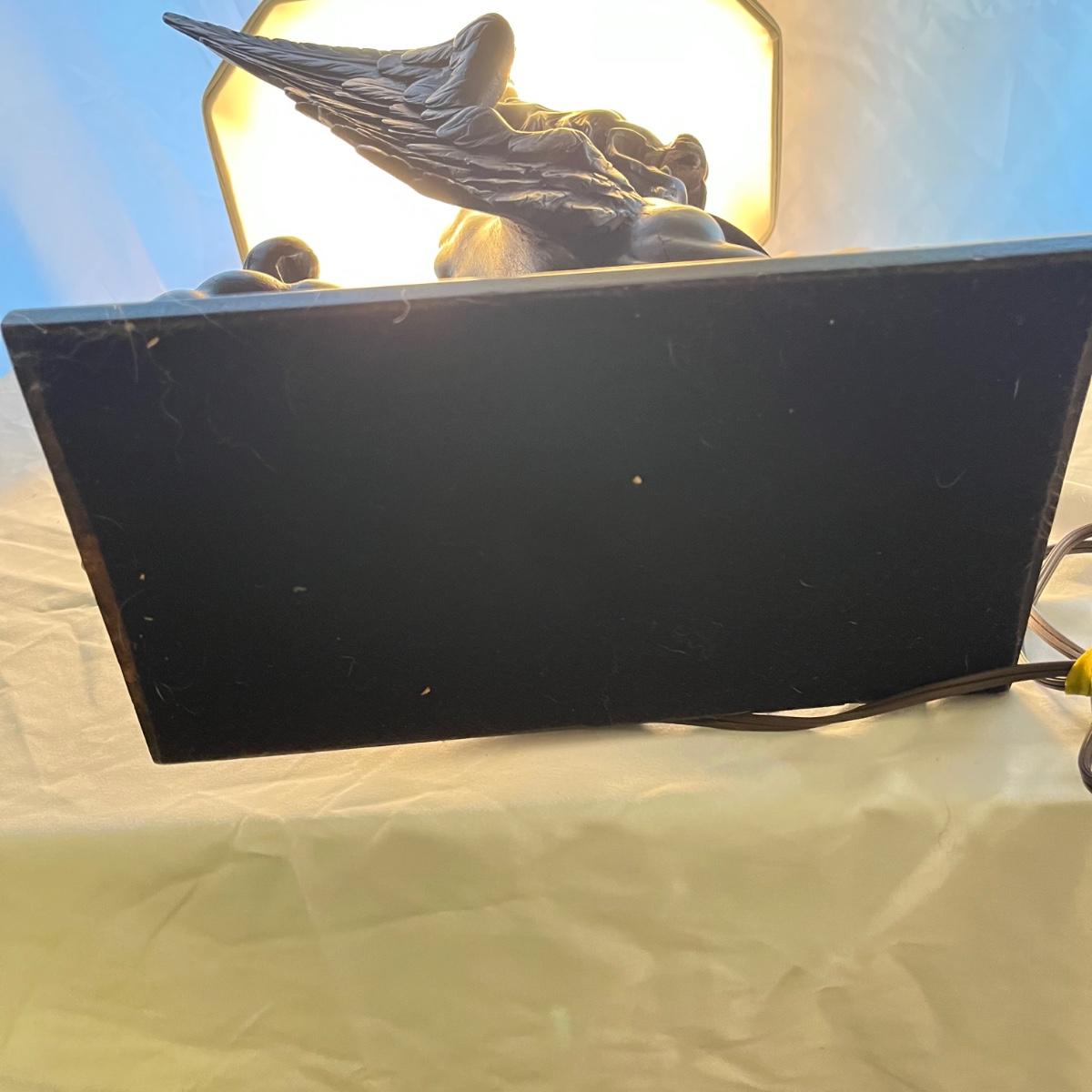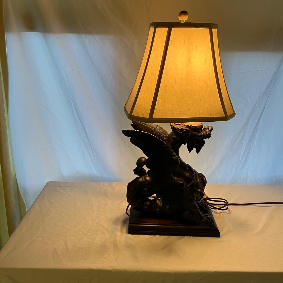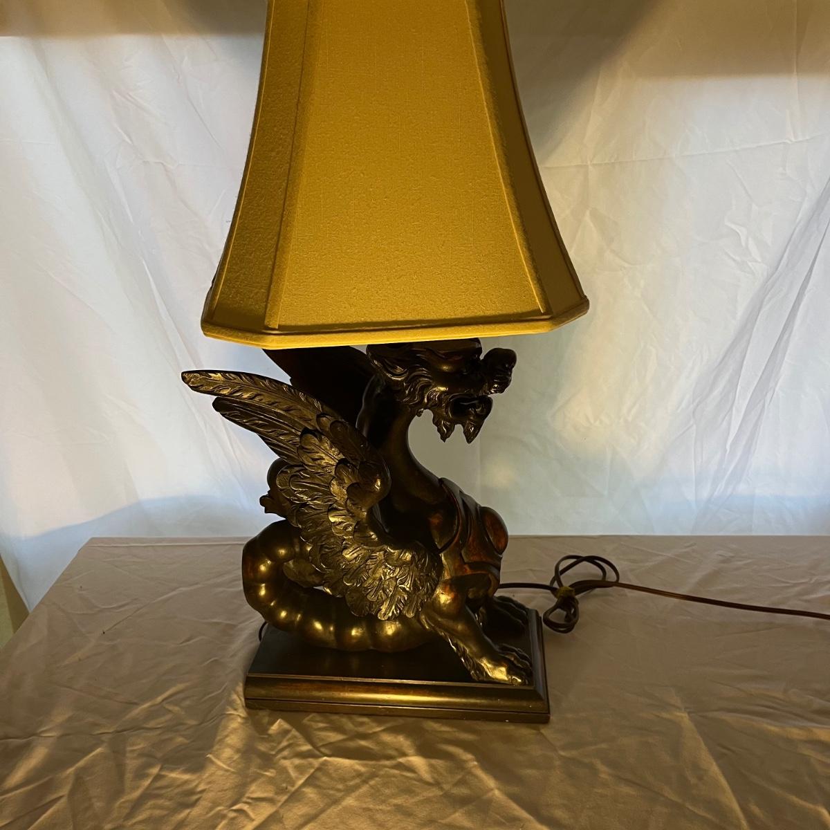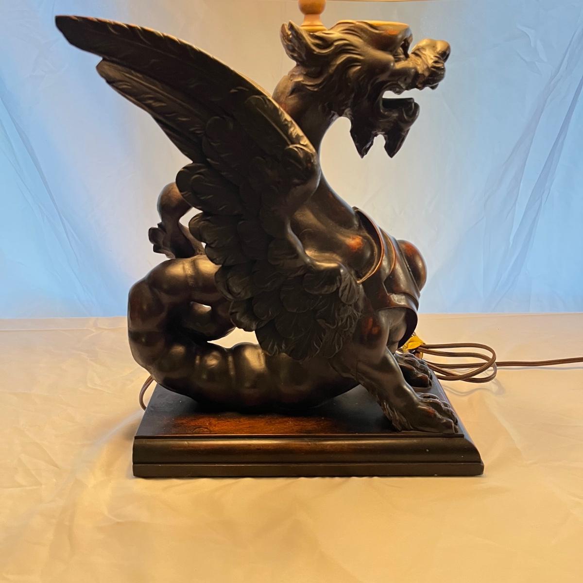 Lot includes a carved (possibly rosewood) wooden Griffin with a three way light. Lamp measures 7” x 11” x 24” without shade.