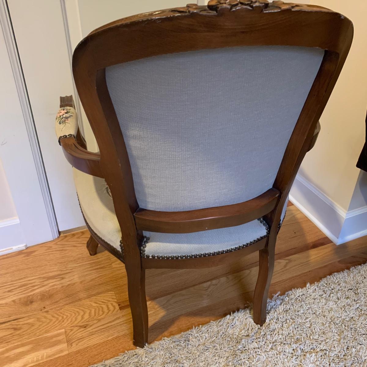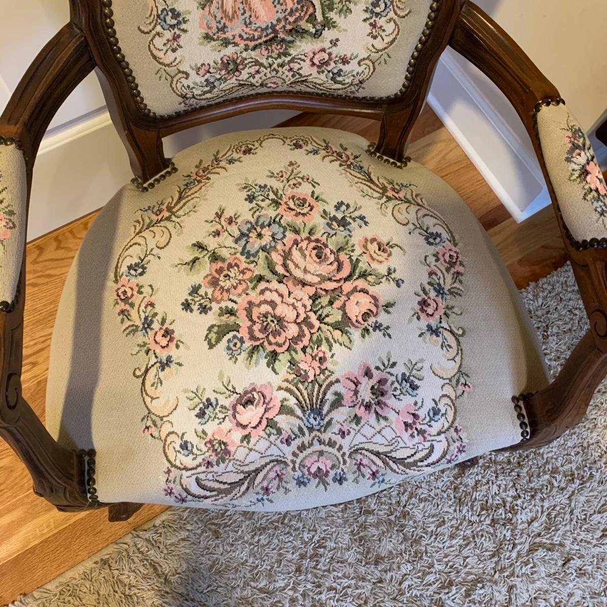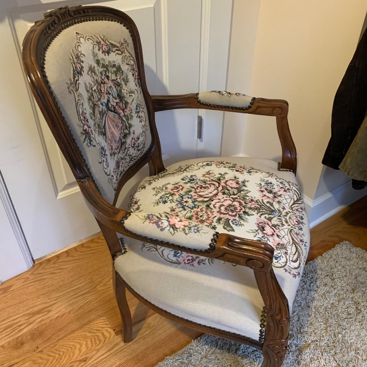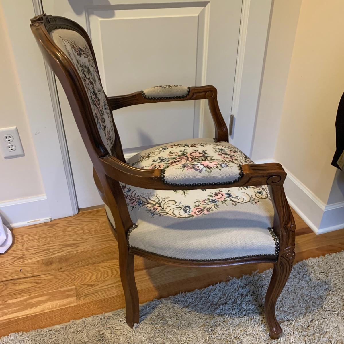 This lot includes one medium sized carved wood chair. The chair is lightweight and features tapestry like floral design and decorative studs. The chair appears to be in good condition with some small signs of wear on the wood and some loose threads. The chair measures about 19" x 24" x 34".
