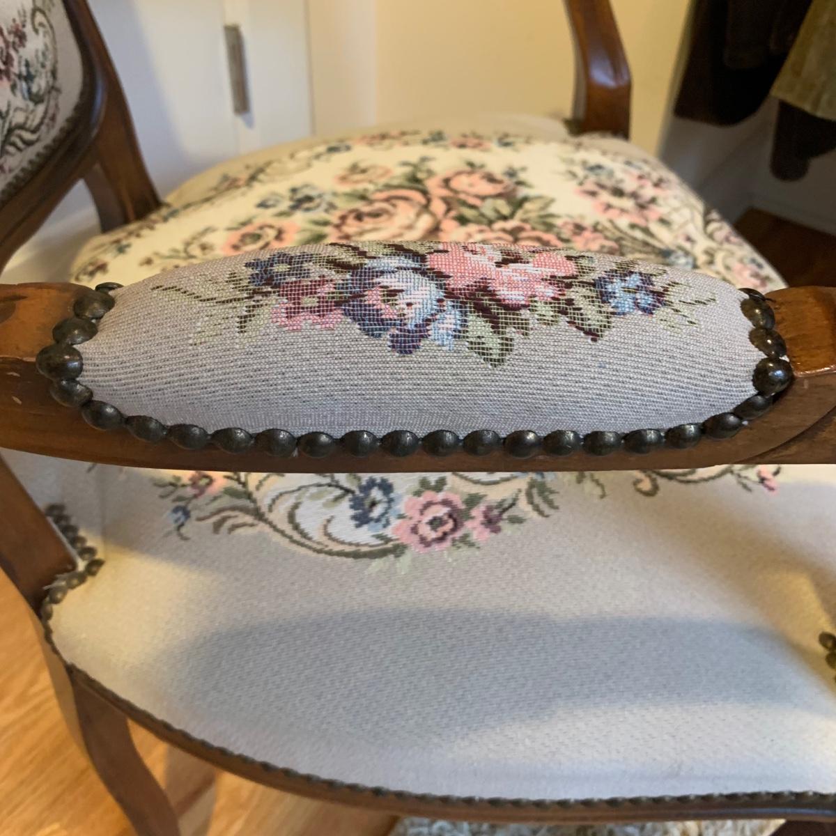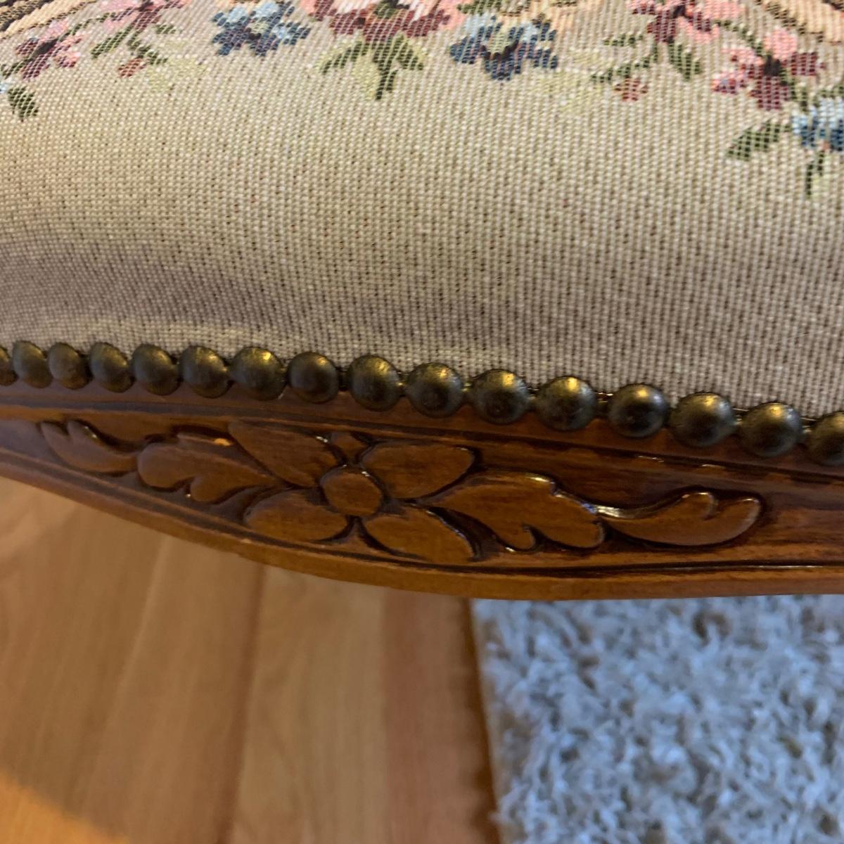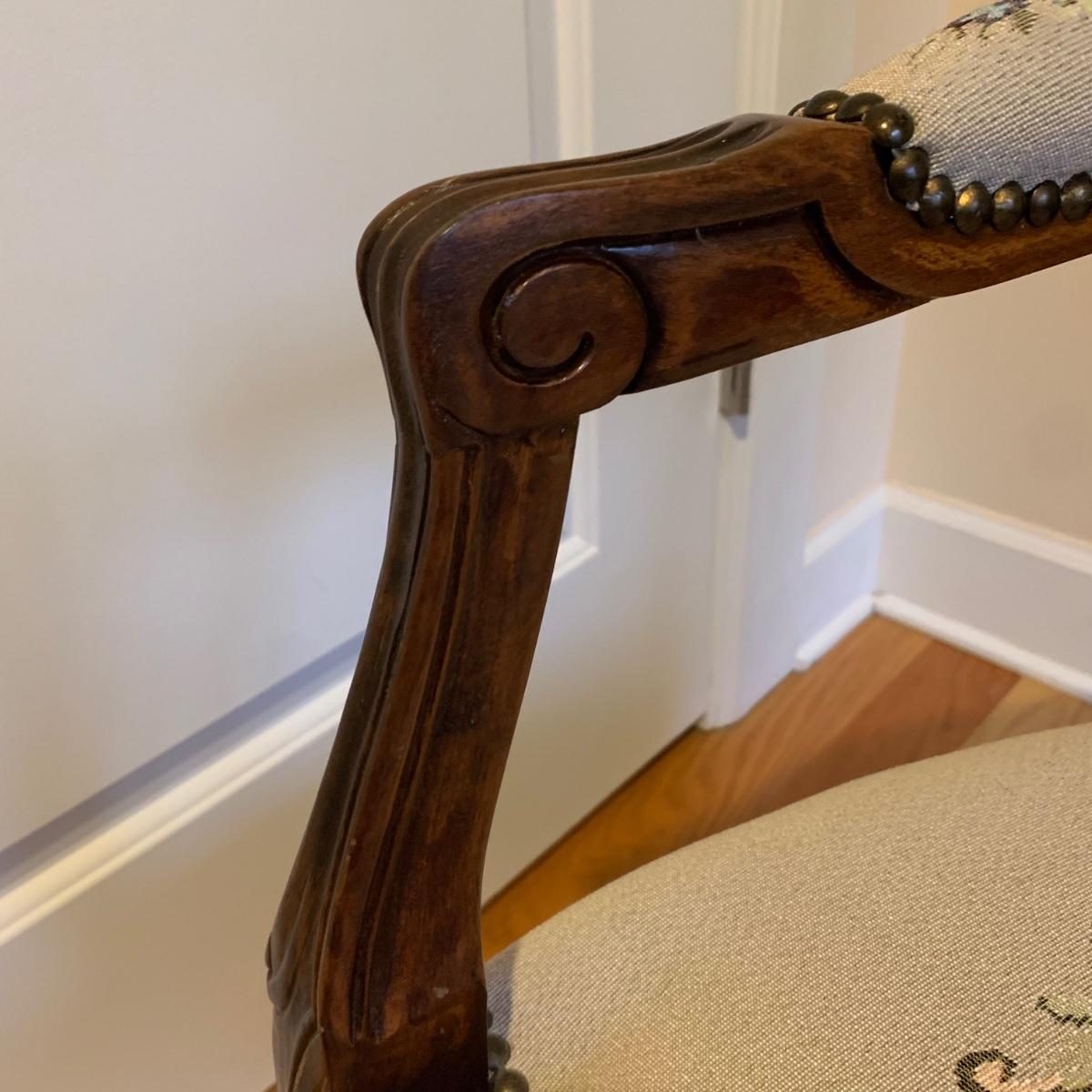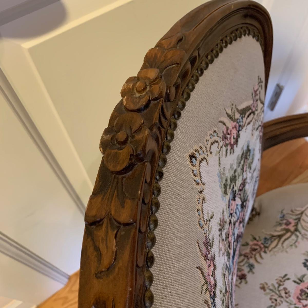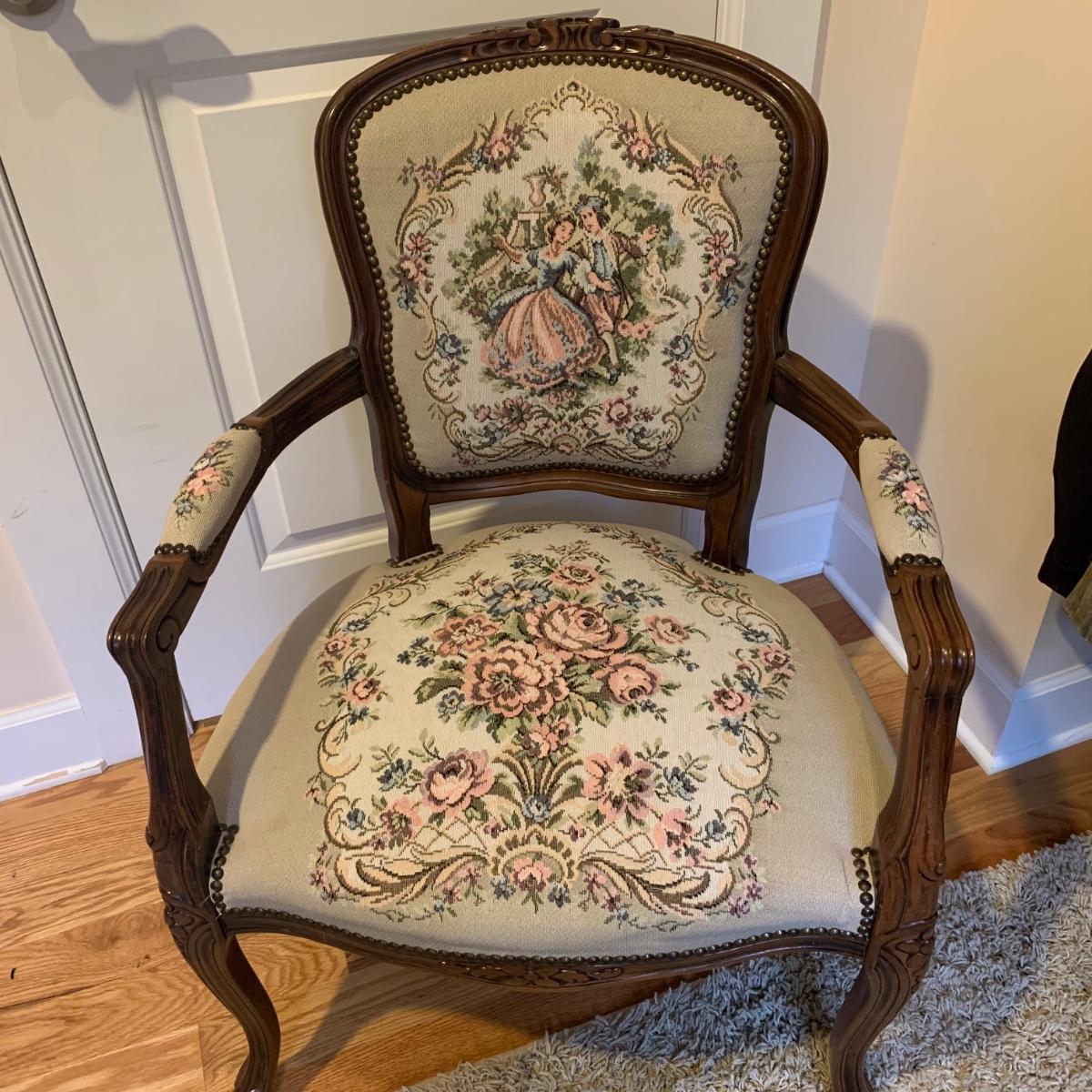 This lot includes one medium sized carved wood chair. The chair is lightweight and features tapestry like floral design and decorative studs. The chair appears to be in good condition with some small signs of wear on the wood and some loose threads. The chair measures about 19" x 24" x 34".