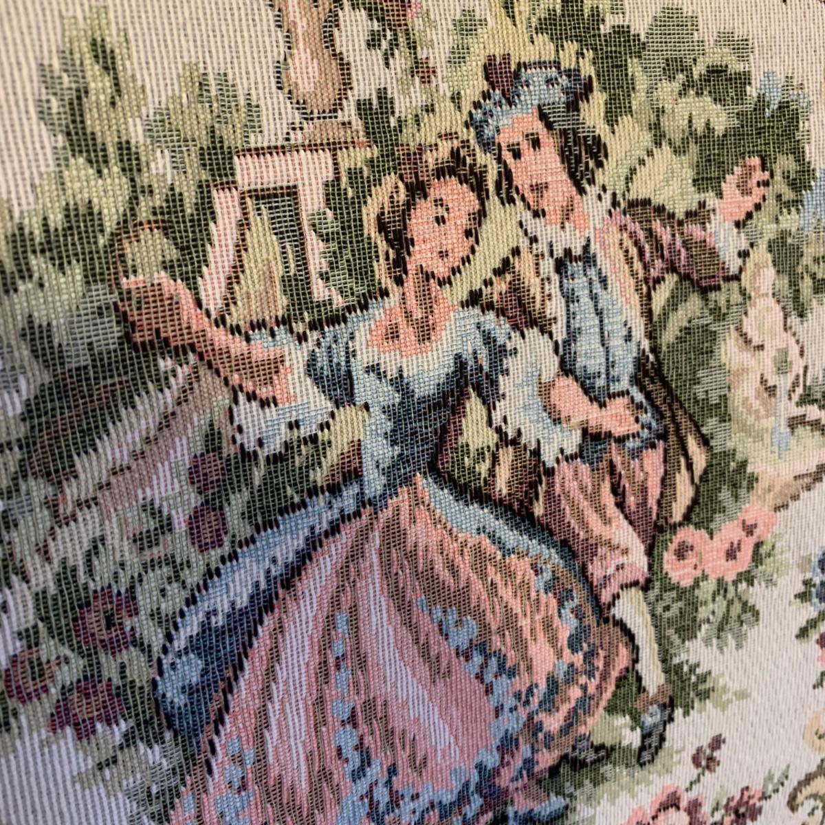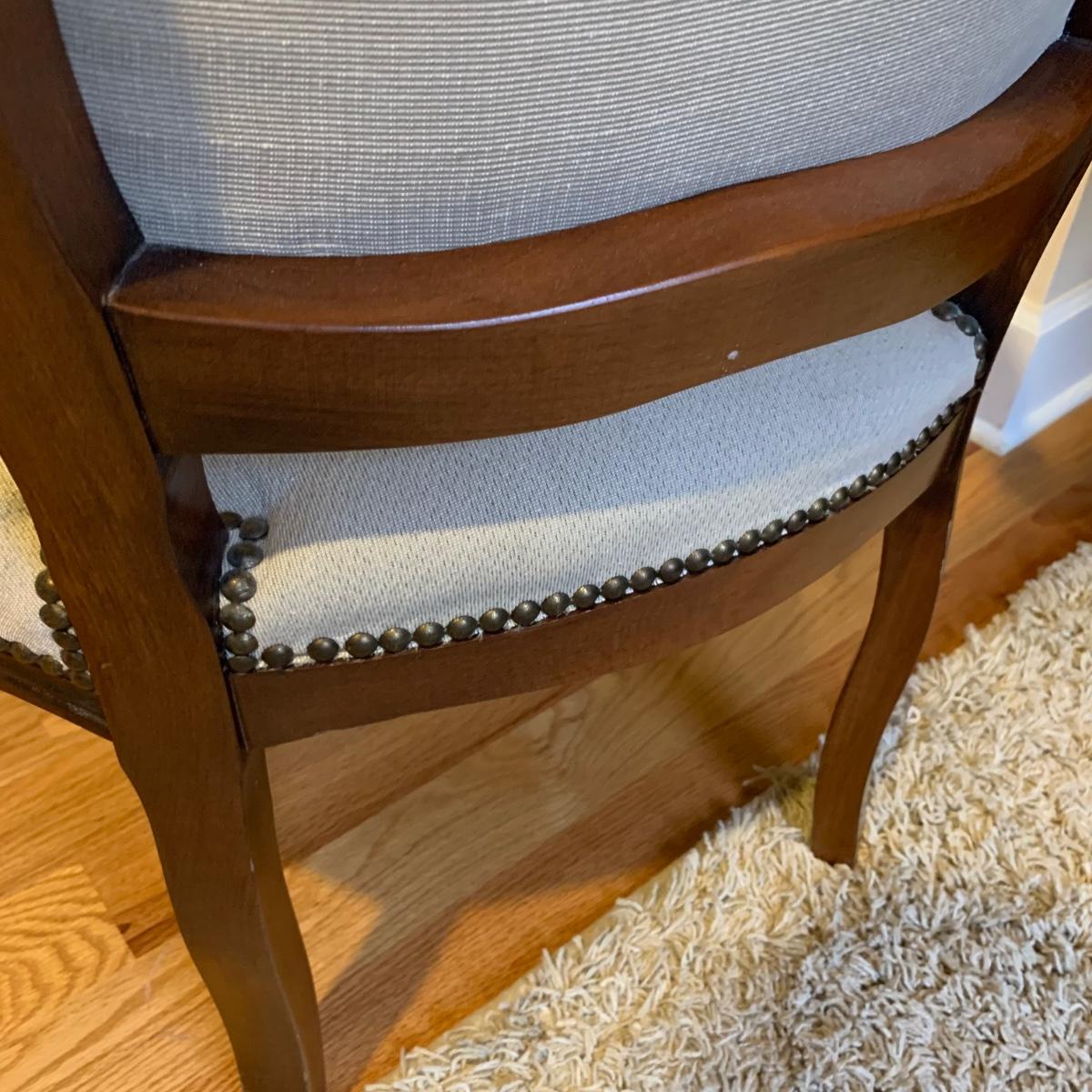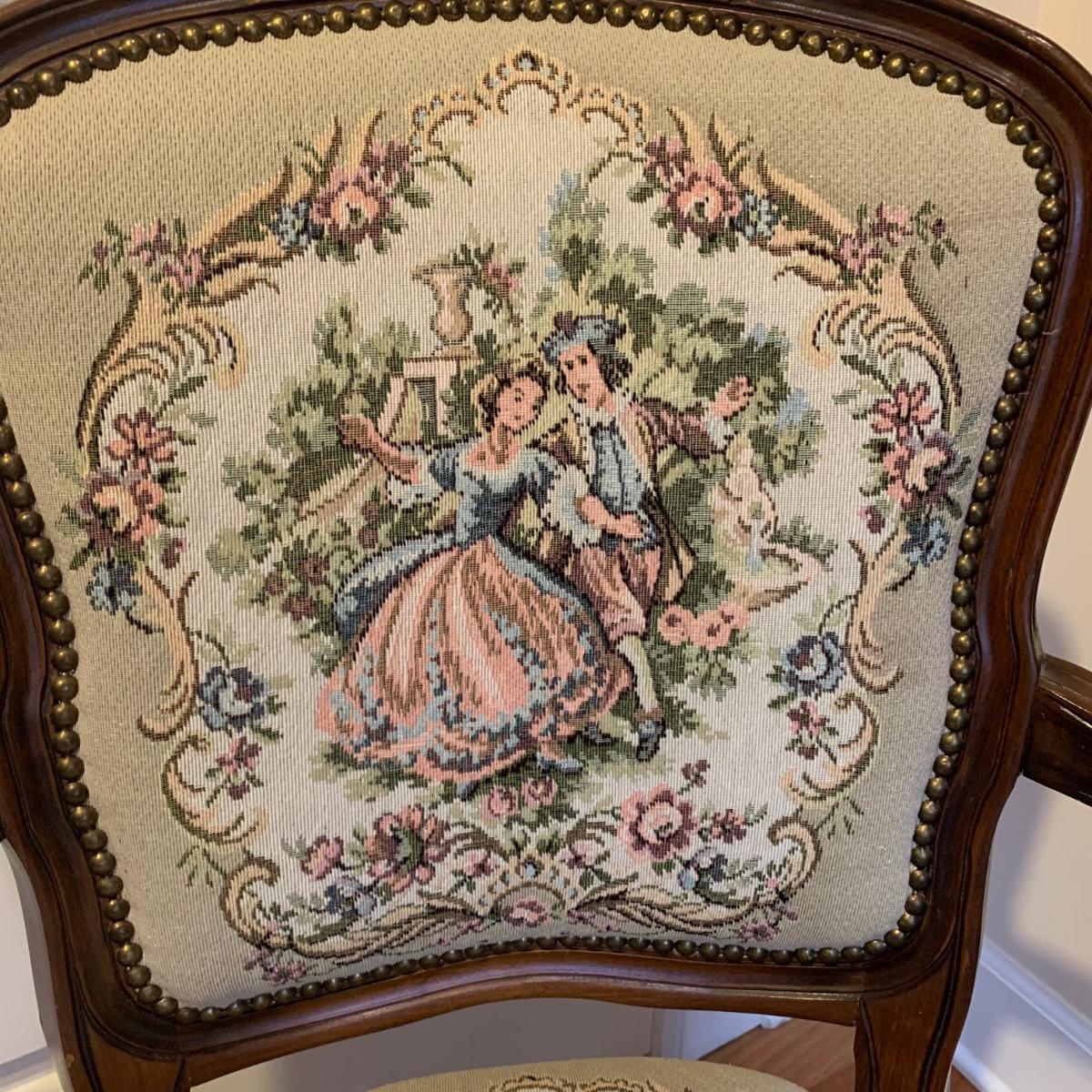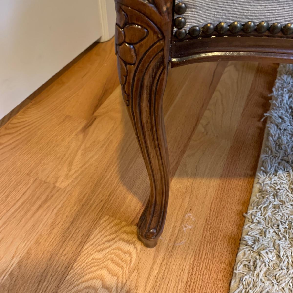 This lot includes one medium sized carved wood chair. The chair is lightweight and features tapestry like floral design and decorative studs. The chair appears to be in good condition with some small signs of wear on the wood and some loose threads. The chair measures about 19" x 24" x 34".