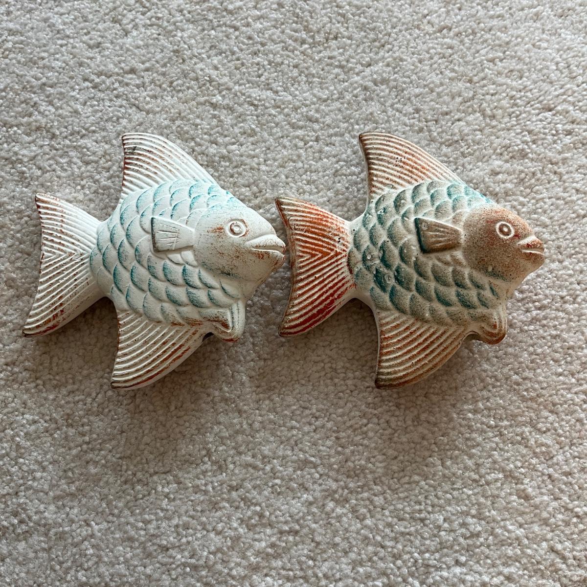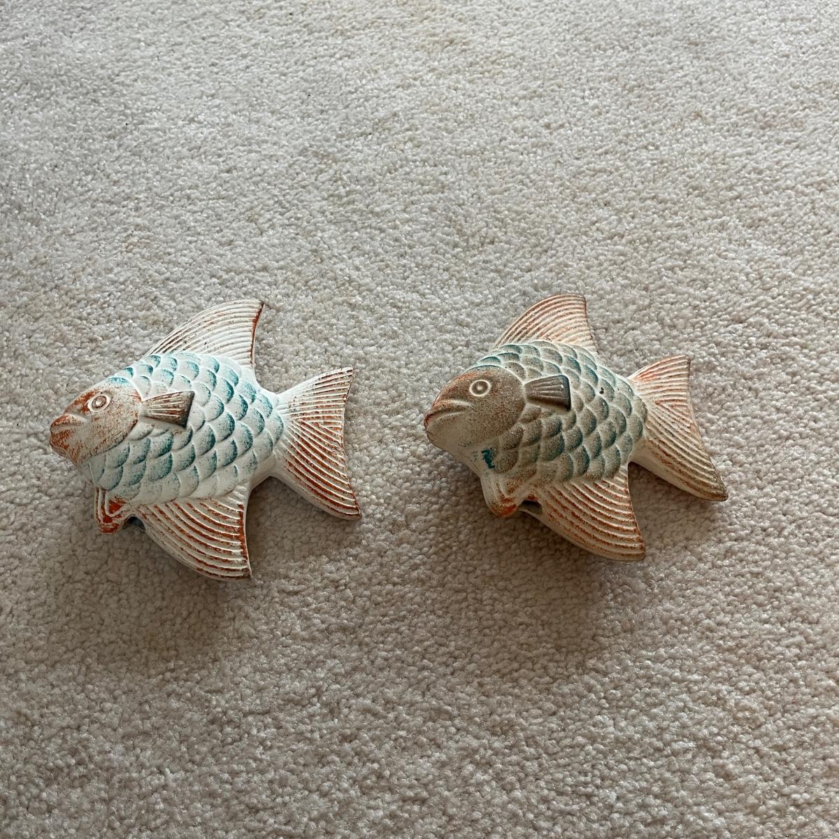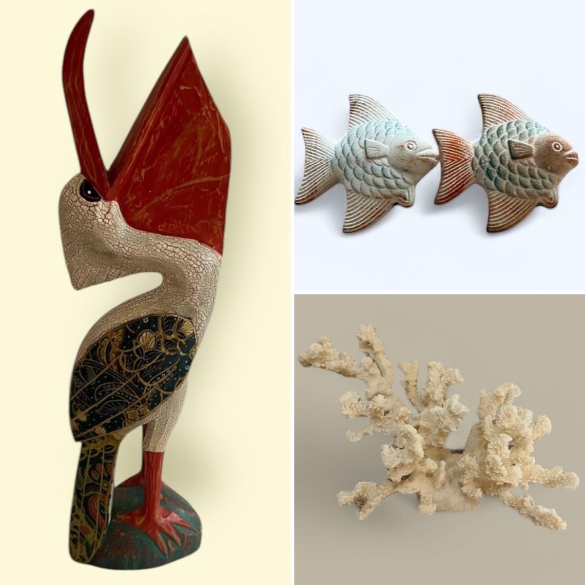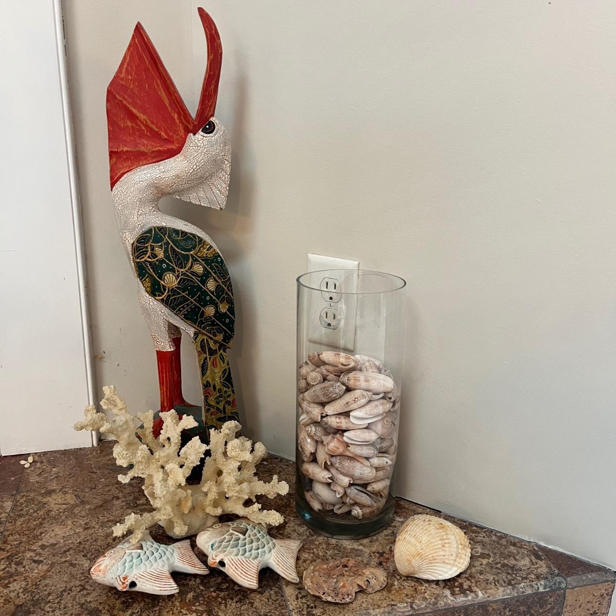 Lot includes a carved and painted wooden pelican, collection of sea shells in a glass container, two ceramic fish, and a piece of faux coral. Pelican measures 3” x 6.5” x 24”H.