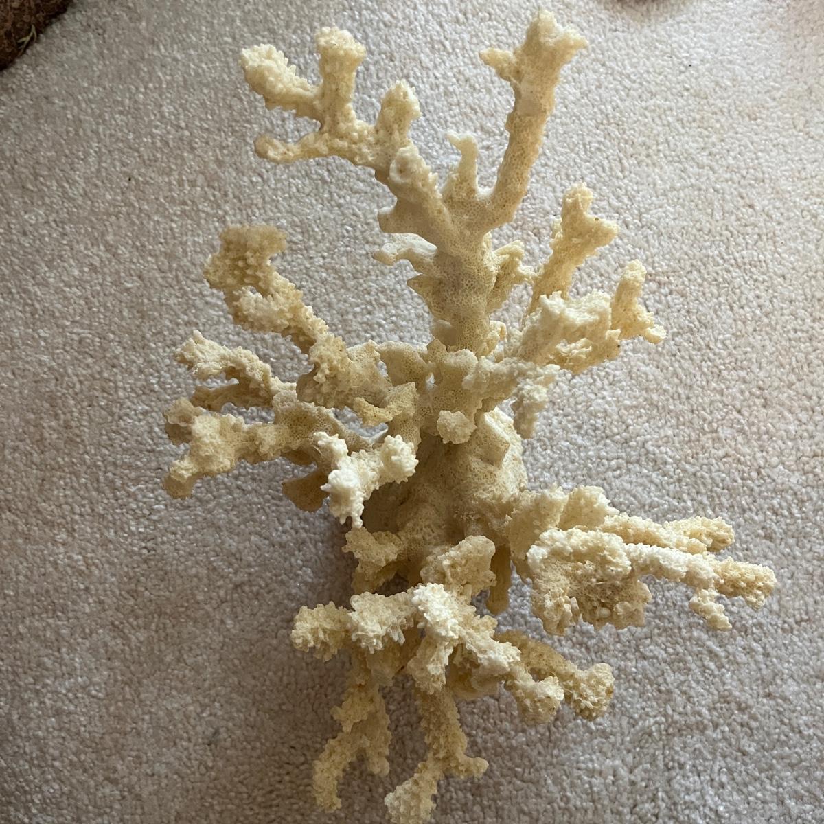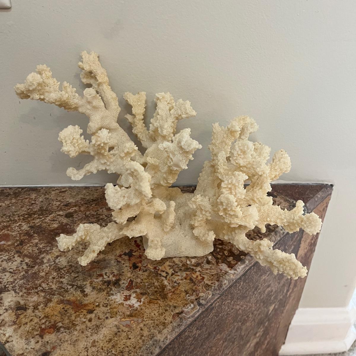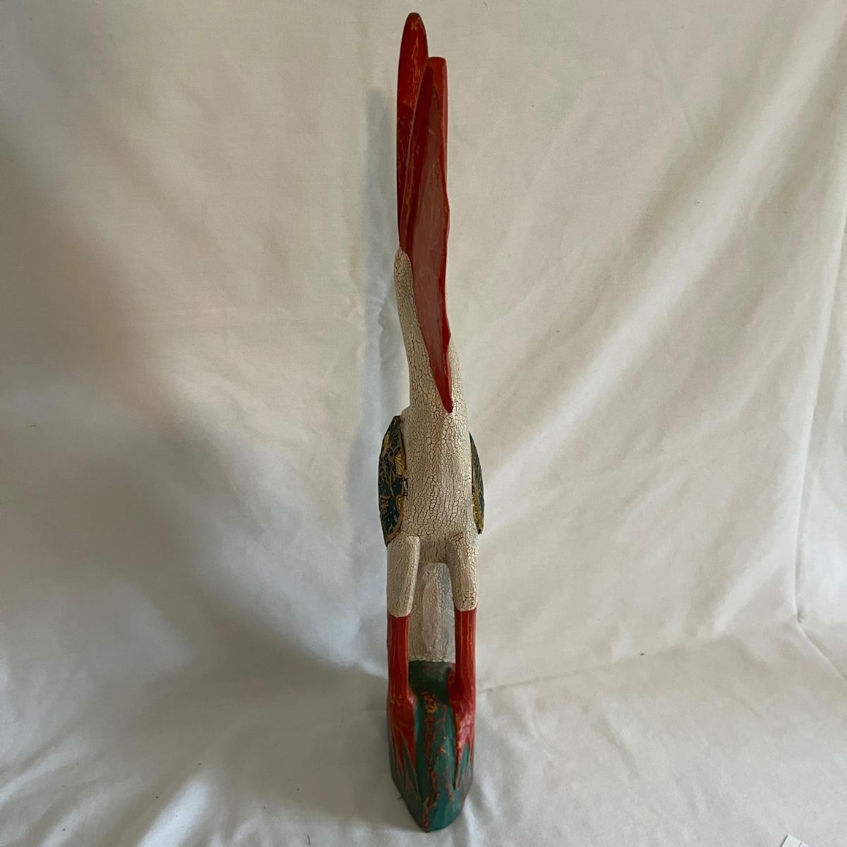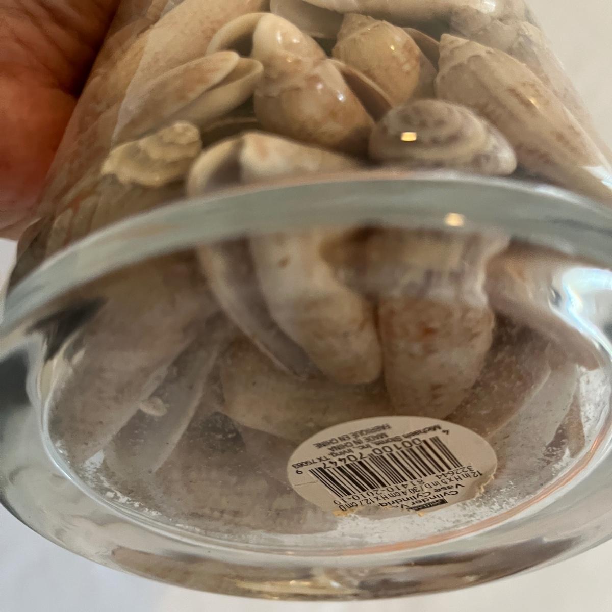 Lot includes a carved and painted wooden pelican, collection of sea shells in a glass container, two ceramic fish, and a piece of faux coral. Pelican measures 3” x 6.5” x 24”H.