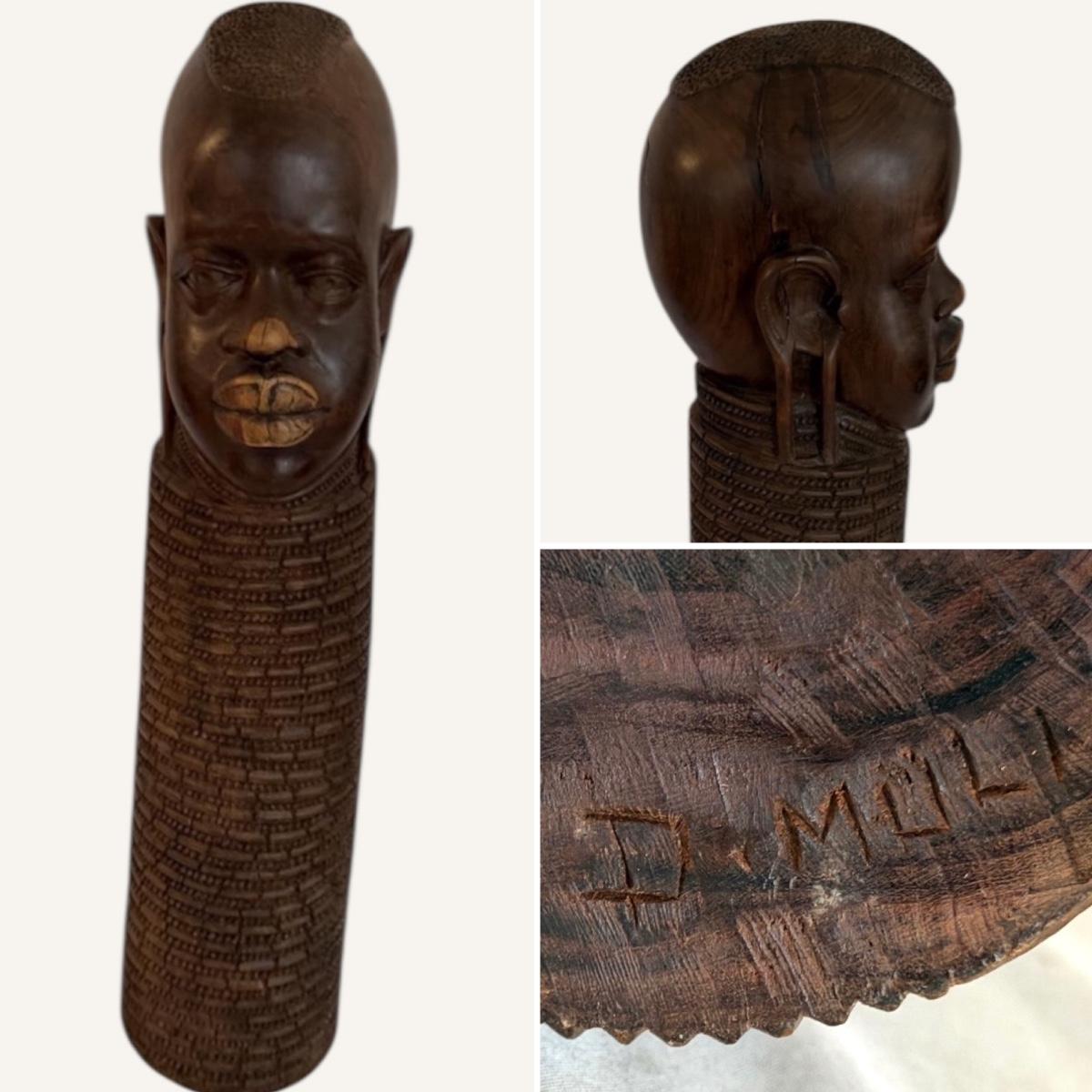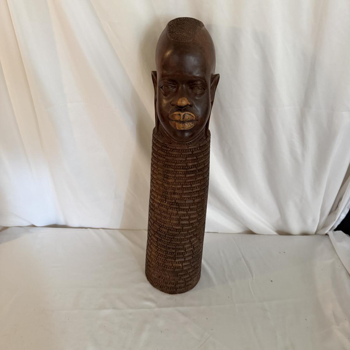 This carved wooden sculpture is by D. Muli and measures 6” x 6.5” x 25”H. Item is heavier than it appears.