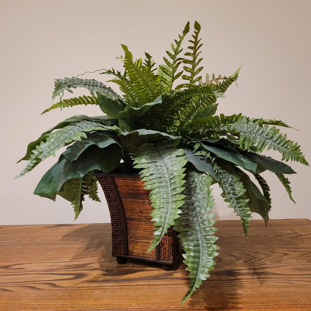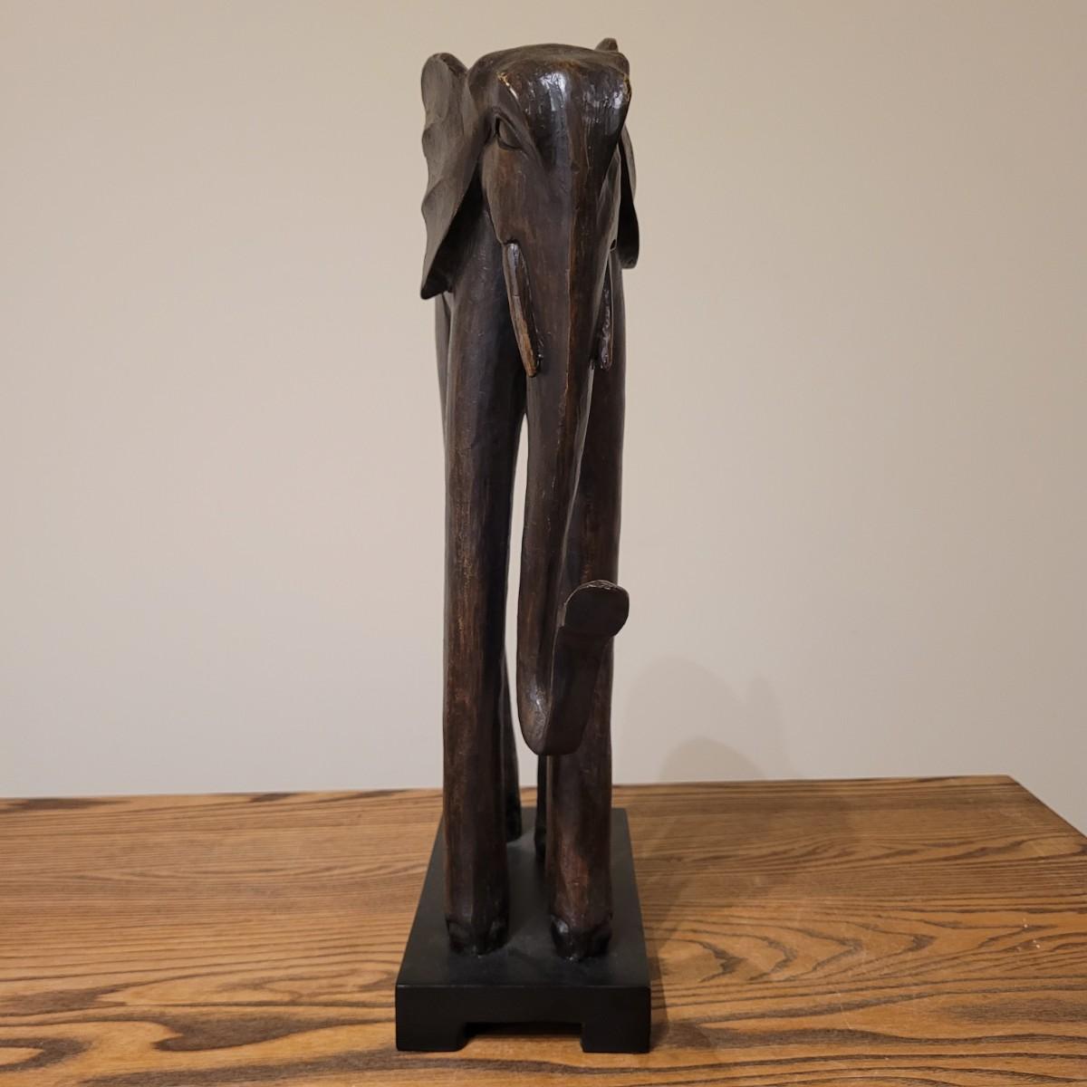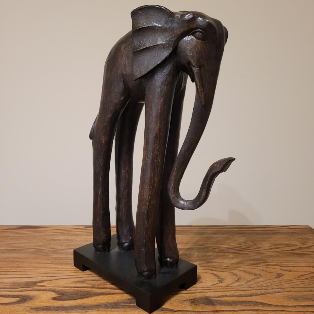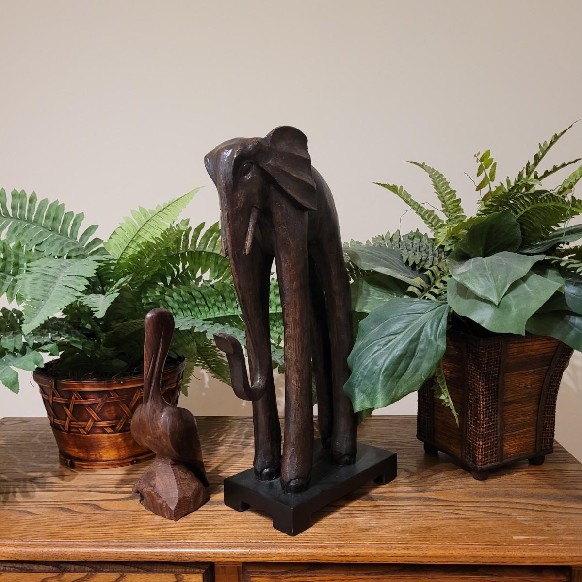 This lot includes two wooden sculptures and two faux plants in planters. The carved wooden sculptures consist of a large elephant, and a smaller pelican. The elephant is marked "Austin" and states the collection. The elephant measures 5" x 12" x 20"H. The pelican is numbered, but otherwise has no markings. The plants are fake and are made to resemble peace lily, and ferns. They are both in wooden planters. Background table is for sale in another lot.