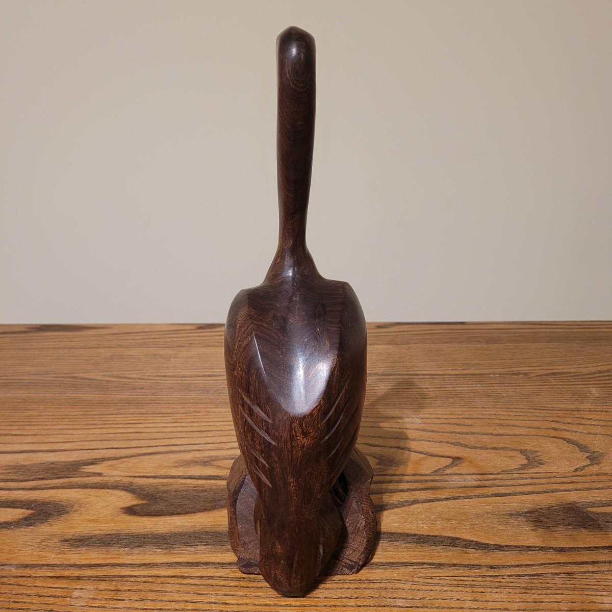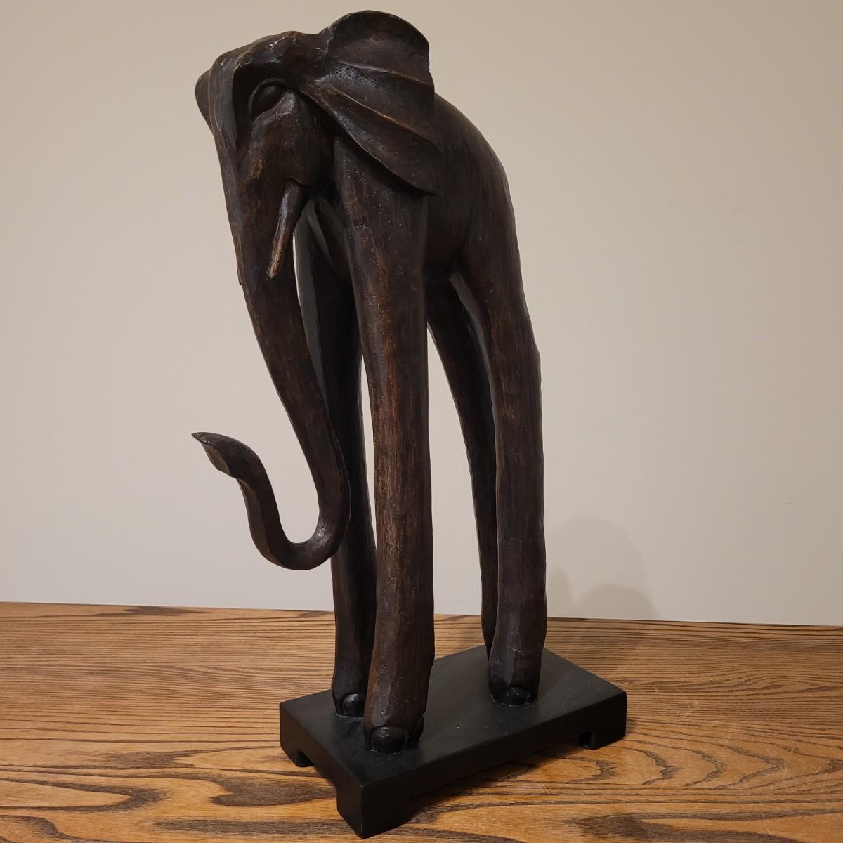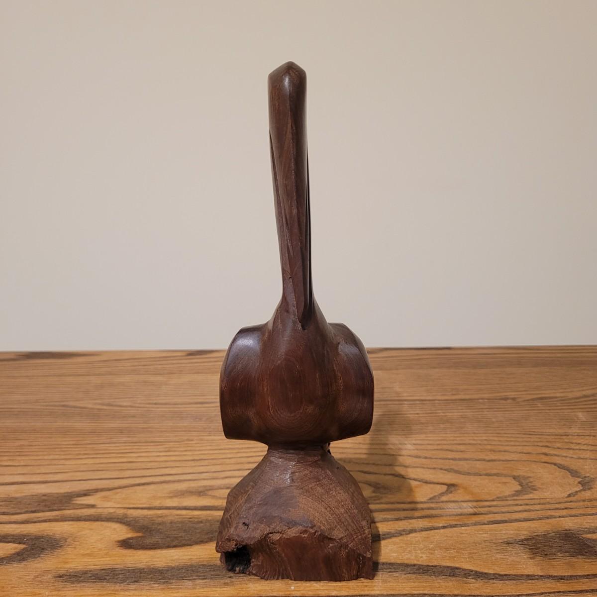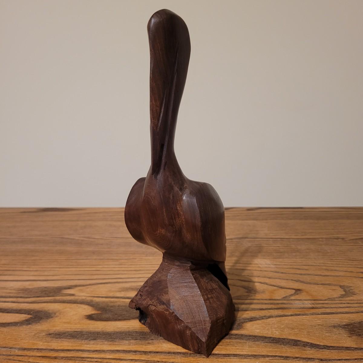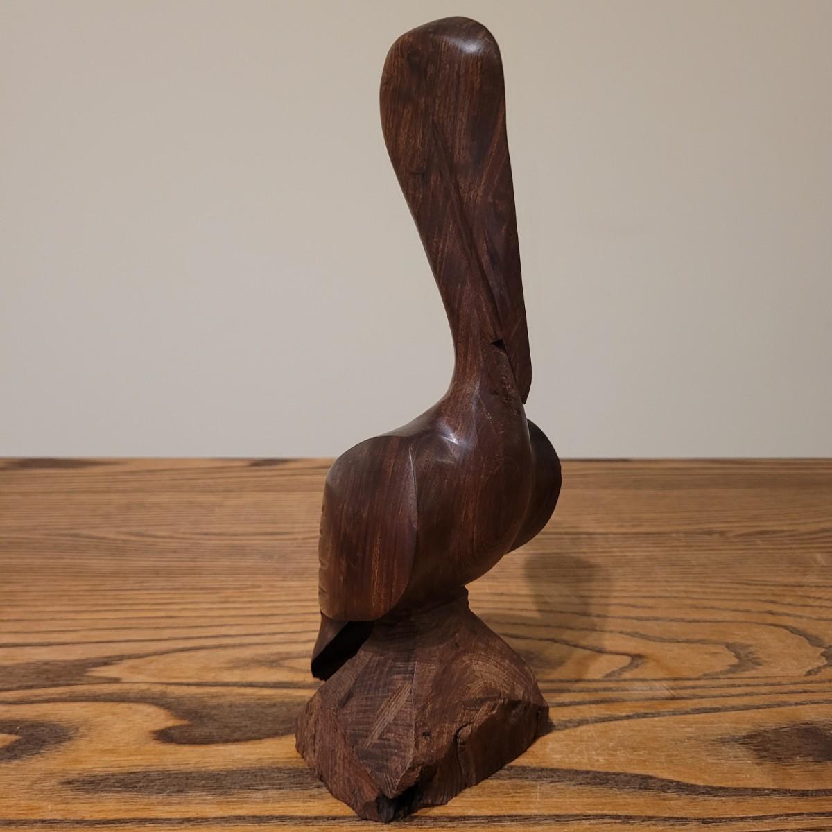 This lot includes two wooden sculptures and two faux plants in planters. The carved wooden sculptures consist of a large elephant, and a smaller pelican. The elephant is marked "Austin" and states the collection. The elephant measures 5" x 12" x 20"H. The pelican is numbered, but otherwise has no markings. The plants are fake and are made to resemble peace lily, and ferns. They are both in wooden planters. Background table is for sale in another lot.