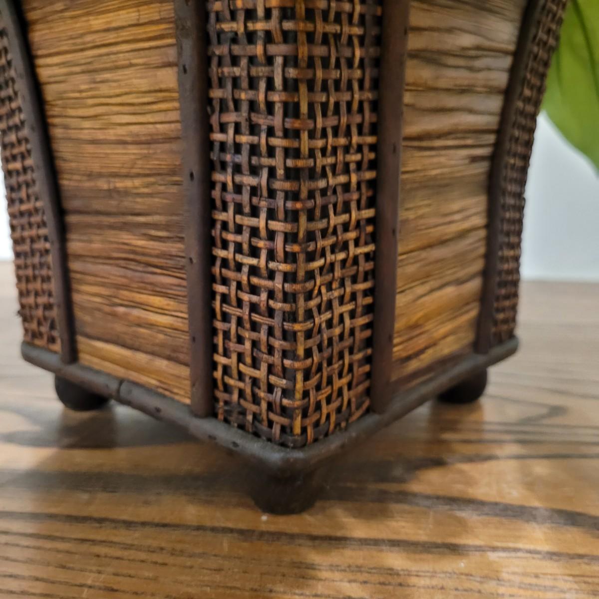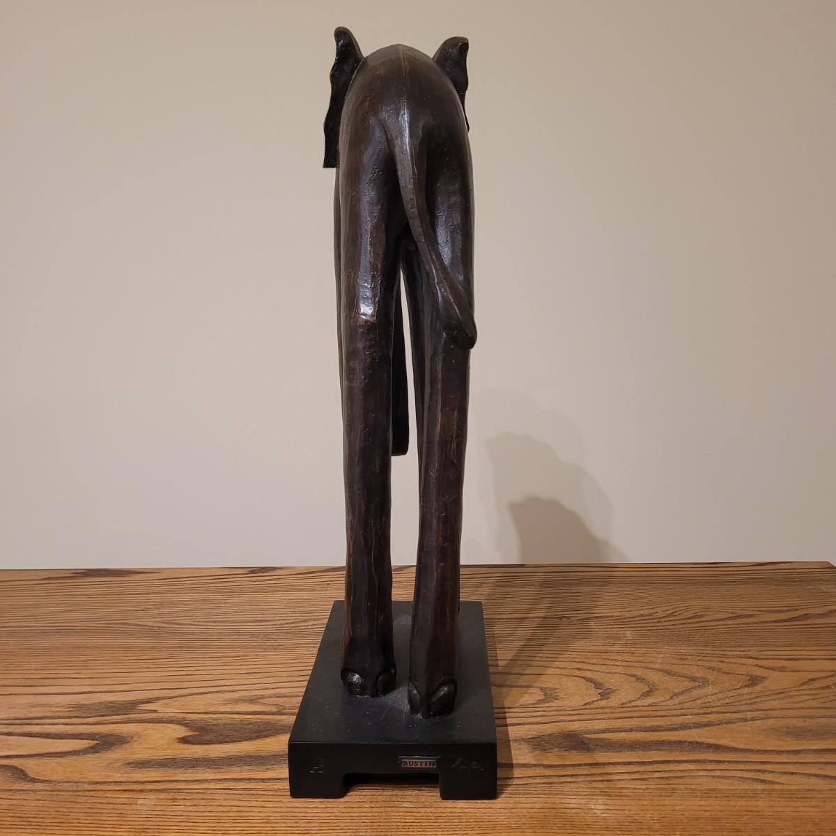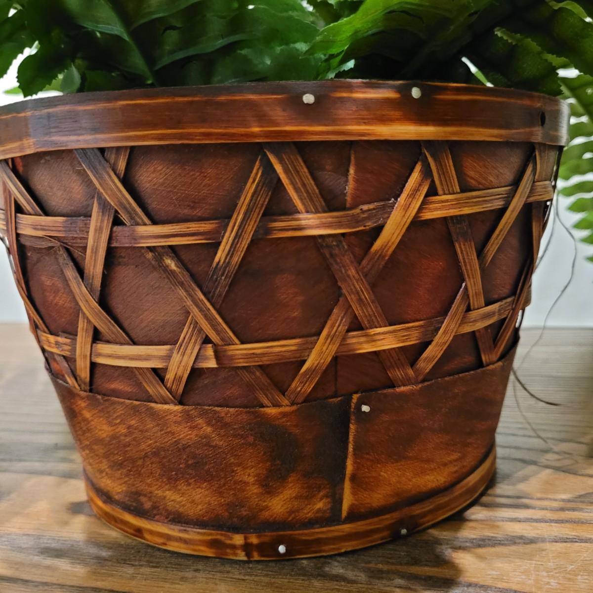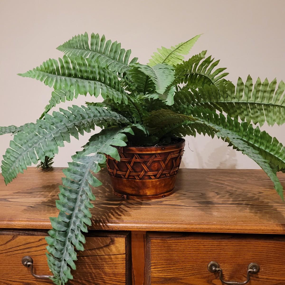 This lot includes two wooden sculptures and two faux plants in planters. The carved wooden sculptures consist of a large elephant, and a smaller pelican. The elephant is marked "Austin" and states the collection. The elephant measures 5" x 12" x 20"H. The pelican is numbered, but otherwise has no markings. The plants are fake and are made to resemble peace lily, and ferns. They are both in wooden planters. Background table is for sale in another lot.